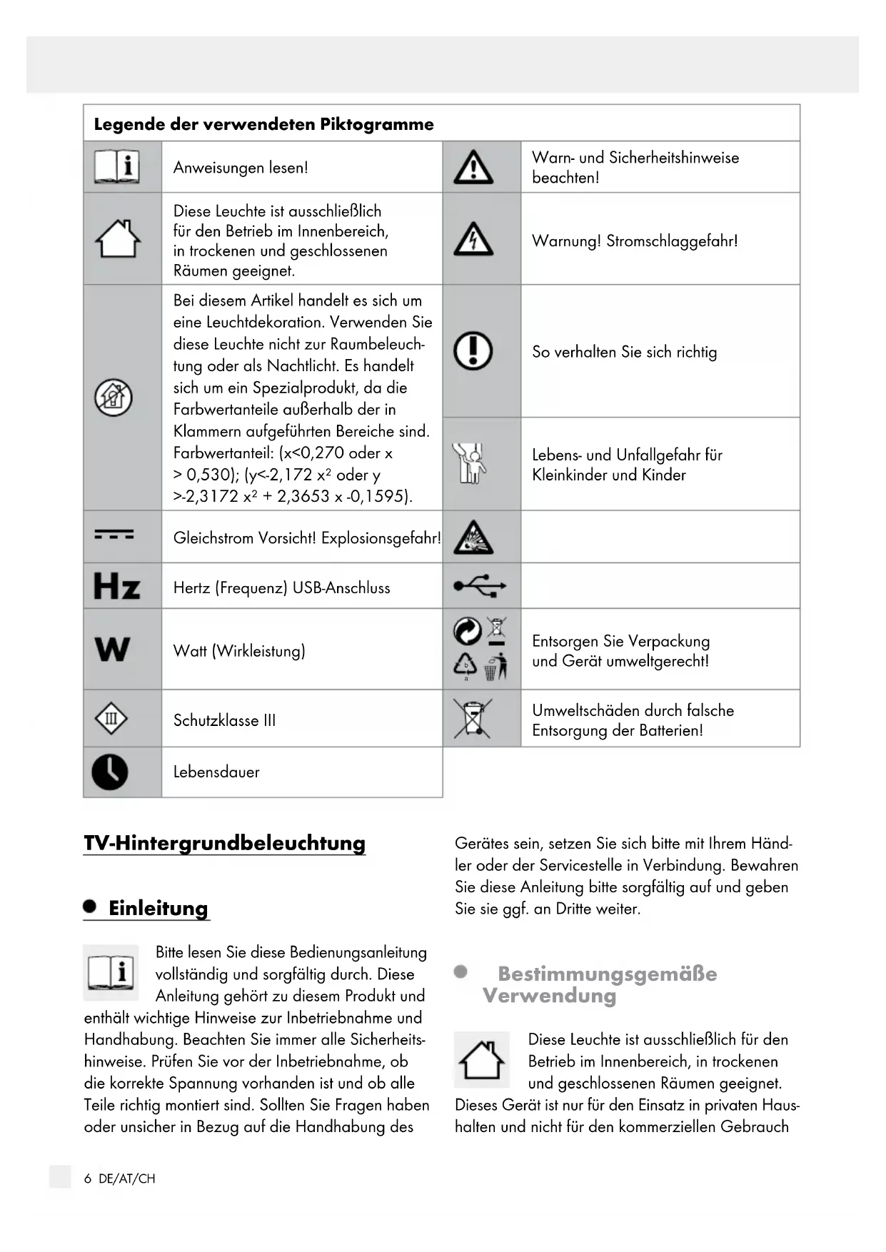 65 DE/AT/CH Inhaltsverzeichnis Legende der verwendeten Piktogramme ...........................................................Seite 6 Einleitung ......................................................................................................................................... Seite 6 Bestimmungsgemäße Verwendung ....................................................................................................Seite 6 Lieferumfang ........................................................................................................................................ Seite 7 Teilebeschreibung ...............................................................................................................................Seite 7 Technische Daten ................................................................................................................................Seite 7 Sicherheit ......................................................................................................................................... Seite 7 Sicherheitshinweise .............................................................................................................................Seite 7 Sicherheitshinweise für Batterien / Akkus ........................................................................................... Seite 9 Inbetriebnahme ......................................................................................................................... Seite 9 LED-Band verbinden ............................................................................................................................Seite 9 LED-Band kürzen .................................................................................................................................Seite 10 LED-Band montieren ............................................................................................................... Seite 10 LED-Band mittels Fernbedienung ein- / ausschalten ....................................Seite 10 Batterie einsetzen / wechseln (Fernbedienung) .............................................Seite 10 Wartung und Reinigung .....................................................................................................Seite 11 Entsorgung .....................................................................................................................................Seite 11 Garantie und Service ............................................................................................................Seite 11 Garantie ..............................................................................................................................................Seite 11 Hersteller / Serviceadresse .................................................................................................................Seite 12 Konformitätserklärung .........................................................................................................................Seite 126 DE/AT/CH Einleitung / SicherheitEinleitung Legende der verwendeten Piktogramme Anweisungen lesen! Warn- und Sicherheitshinweise beachten! Diese Leuchte ist ausschließlich für den Betrieb im Innenbereich, in trockenen und geschlossenen Räumen geeignet. Warnung! Stromschlaggefahr! Bei diesem Artikel handelt es sich um eine Leuchtdekoration. Verwenden Sie diese Leuchte nicht zur Raumbeleuch- tung oder als Nachtlicht. Es handelt sich um ein Spezialprodukt, da die Farbwertanteile außerhalb der in Klammern aufgeführten Bereiche sind. Farbwertanteil: (x<0,270 oder x > 0,530); (y<-2,172 x² oder y >-2,3172 x² + 2,3653 x -0,1595). So verhalten Sie sich richtig Lebens- und Unfallgefahr für Kleinkinder und Kinder Gleichstrom Vorsicht! Explosionsgefahr! Hertz (Frequenz) USB-Anschluss Watt (Wirkleistung)