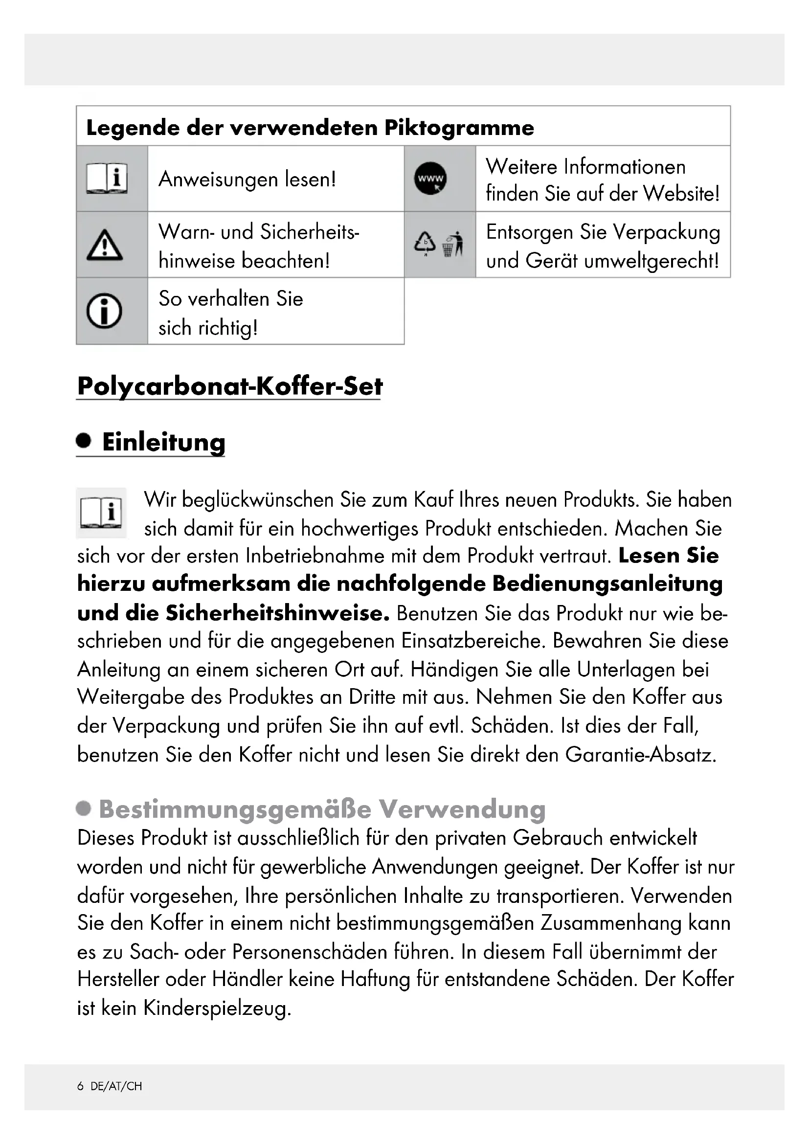 Entsorgen Sie Verpackung und Gerät umweltgerecht! So verhalten Sie sich richtig! Polycarbonat-Koffer-Set Einleitung Wir beglückwünschen Sie zum Kauf Ihres neuen Produkts. Sie haben sich damit für ein hochwertiges Produkt entschieden. Machen Sie sich vor der ersten Inbetriebnahme mit dem Produkt vertraut. Lesen Sie hierzu aufmerksam die nachfolgende Bedienungsanleitung und die Sicherheitshinweise. Benutzen Sie das Produkt nur wie be- schrieben und für die angegebenen Einsatzbereiche. Bewahren Sie diese Anleitung an einem sicheren Ort auf. Händigen Sie alle Unterlagen bei Weitergabe des Produktes an Dritte mit aus. Nehmen Sie den Koffer aus der Verpackung und prüfen Sie ihn auf evtl. Schäden. Ist dies der Fall, benutzen Sie den Koffer nicht und lesen Sie direkt den Garantie-Absatz. Bestimmungsgemäße Verwendung Dieses Produkt ist ausschließlich für den privaten Gebrauch entwickelt worden und nicht für gewerbliche Anwendungen geeignet. Der Koffer ist nur dafür vorgesehen, Ihre persönlichen Inhalte zu transportieren. Verwenden Sie den Koffer in einem nicht bestimmungsgemäßen Zusammenhang kann es zu Sach- oder Personenschäden führen. In diesem Fall übernimmt der Hersteller oder Händler keine Haftung für entstandene Schäden. Der Koffer ist kein Kinderspielzeug.7 DE/AT/CH Teilebeschreibung