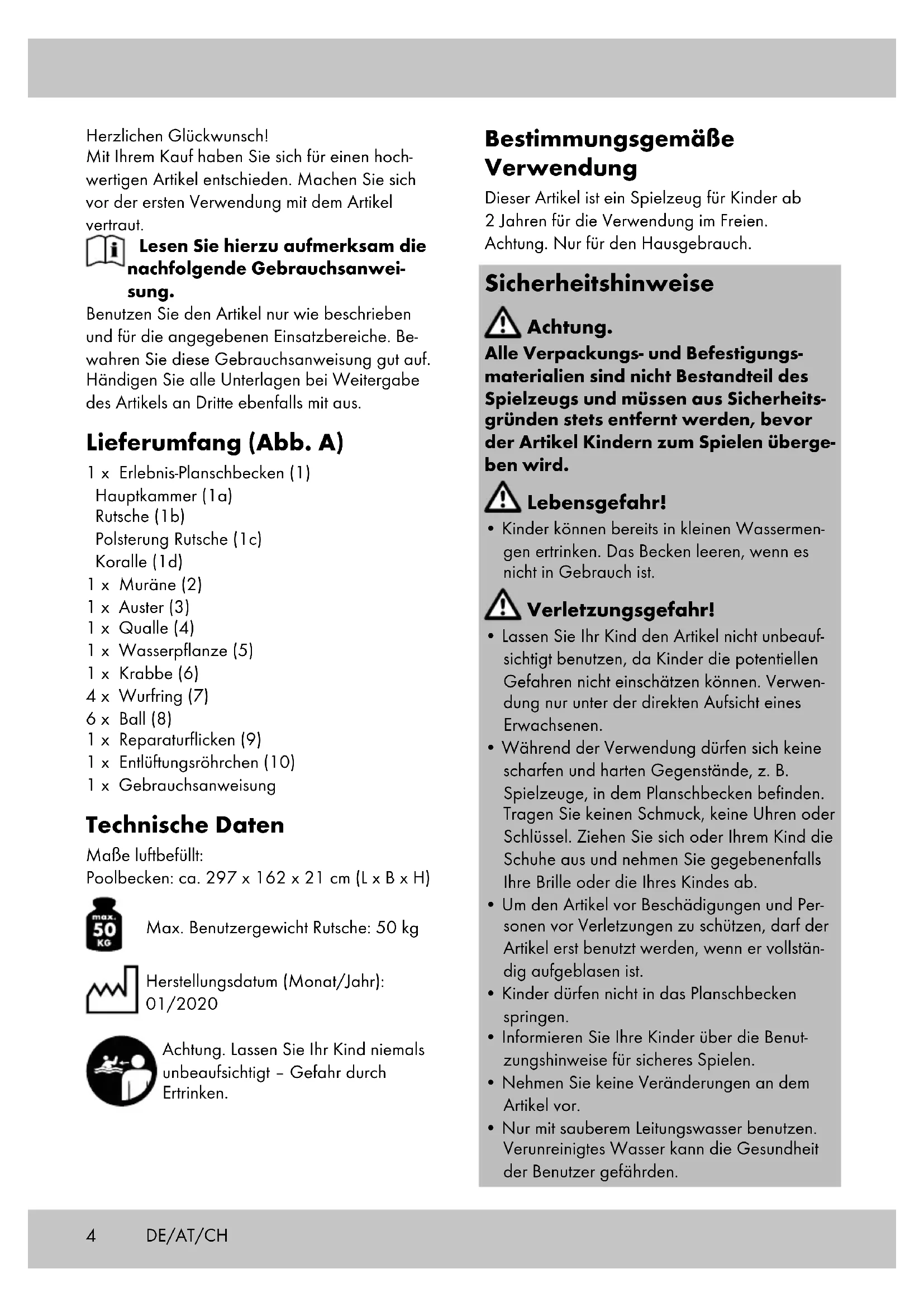 1d34 Herzlichen Glückwunsch! Mit Ihrem Kauf haben Sie sich für einen hoch- wertigen Artikel entschieden. Machen Sie sich vor der ersten Verwendung mit dem Artikel vertraut. Lesen Sie hierzu aufmerksam die nachfolgende Gebrauchsanwei- sung. Benutzen Sie den Artikel nur wie beschrieben und für die angegebenen Einsatzbereiche. Be- wahren Sie diese Gebrauchsanweisung gut auf. Händigen Sie alle Unterlagen bei Weitergabe des Artikels an Dritte ebenfalls mit aus. Lieferumfang (Abb. A) 1 x Erlebnis-Planschbecken (1) Hauptkammer (1a) Rutsche (1b) Polsterung Rutsche (1c) Koralle (1d) 1 x Muräne (2) 1 x Auster (3) 1 x Qualle (4) 1 x Wasserpflanze (5) 1 x Krabbe (6) 4 x Wurfring (7) 6 x Ball (8) 1 x Reparaturflicken (9) 1 x Entlüftungsröhrchen (10) 1 x Gebrauchsanweisung Technische Daten Maße luftbefüllt: Poolbecken: ca. 297 x 162 x 21 cm (L x B x H) Max. Benutzergewicht Rutsche: 50 kg Herstellungsdatum (Monat/Jahr): 01/2020 Achtung. Lassen Sie Ihr Kind niemals unbeaufsichtigt – Gefahr durch Ertrinken. Bestimmungsgemäße Verwendung Dieser Artikel ist ein Spielzeug für Kinder ab 2 Jahren für die Verwendung im Freien. Achtung. Nur für den Hausgebrauch. Sicherheitshinweise Achtung. Alle Verpackungs- und Befestigungs- materialien sind nicht Bestandteil des Spielzeugs und müssen aus Sicherheits- gründen stets entfernt werden, bevor der Artikel Kindern zum Spielen überge- ben wird. Lebensgefahr!
