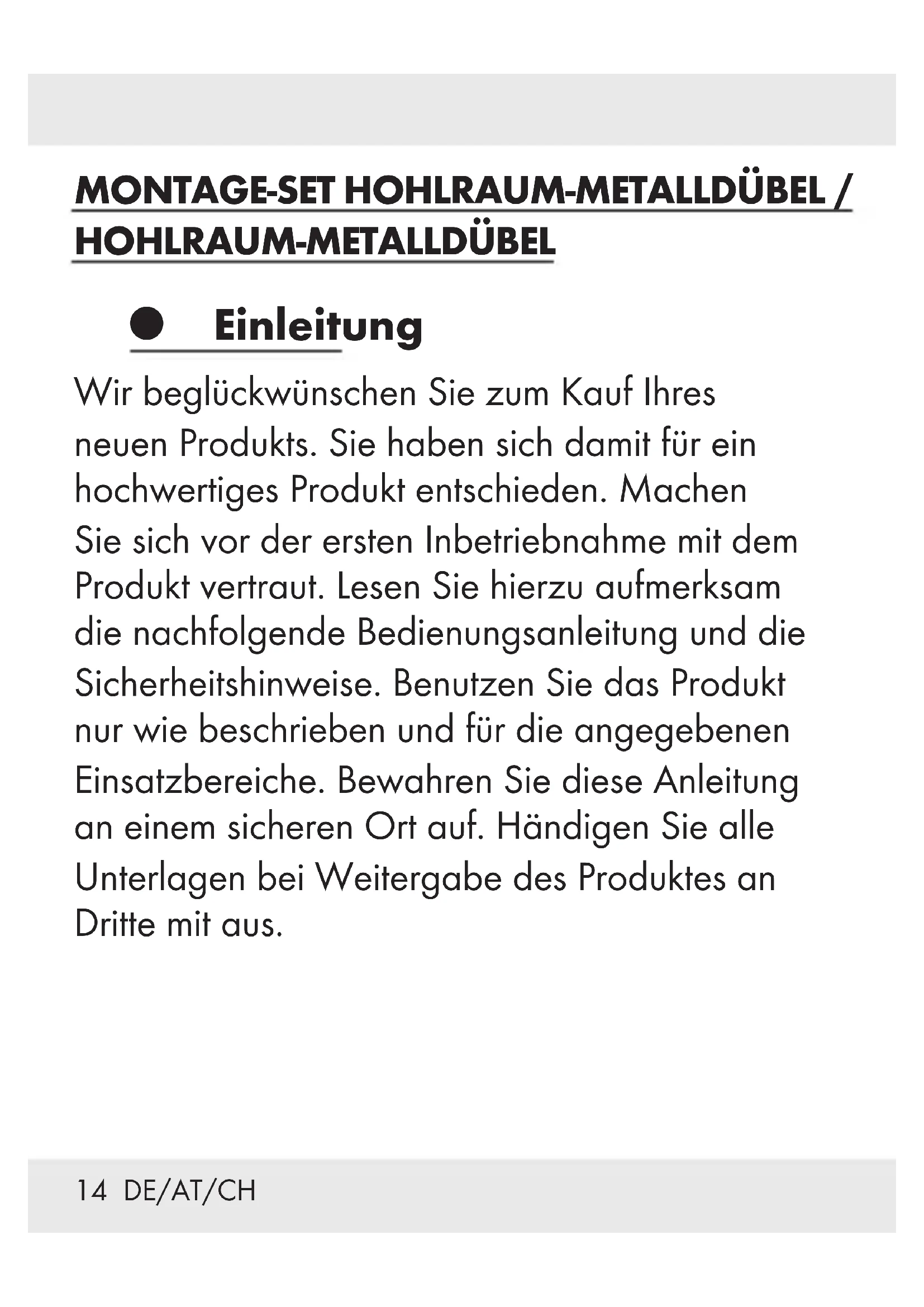 HOHLRAUM-METALLDÜBEL Einleitung Wir beglückwünschen Sie zum Kauf Ihres neuen Produkts. Sie haben sich damit für ein hochwertiges Produkt entschieden. Machen Sie sich vor der ersten Inbetriebnahme mit dem Produkt vertraut. Lesen Sie hierzu aufmerksam die nachfolgende Bedienungsanleitung und die Sicherheitshinweise. Benutzen Sie das Produkt nur wie beschrieben und für die angegebenen Einsatzbereiche. Bewahren Sie diese Anleitung an einem sicheren Ort auf. Händigen Sie alle Unterlagen bei Weitergabe des Produktes an Dritte mit aus.15DE/AT/CH Bestimmungsgemäße Verwendung Für Befestigungen in Gipskarton, Gipsfaserplatten, Hohlraumdecken und Spanplatten. Nur für den privaten Gebrauch. Das Produkt ist nicht für den gewerblichen Einsatz bestimmt. Für aus bestimmungswidriger Verwendung entstandene Schäden übernimmt der Hersteller keine Haftung. Sicherheitshinweise