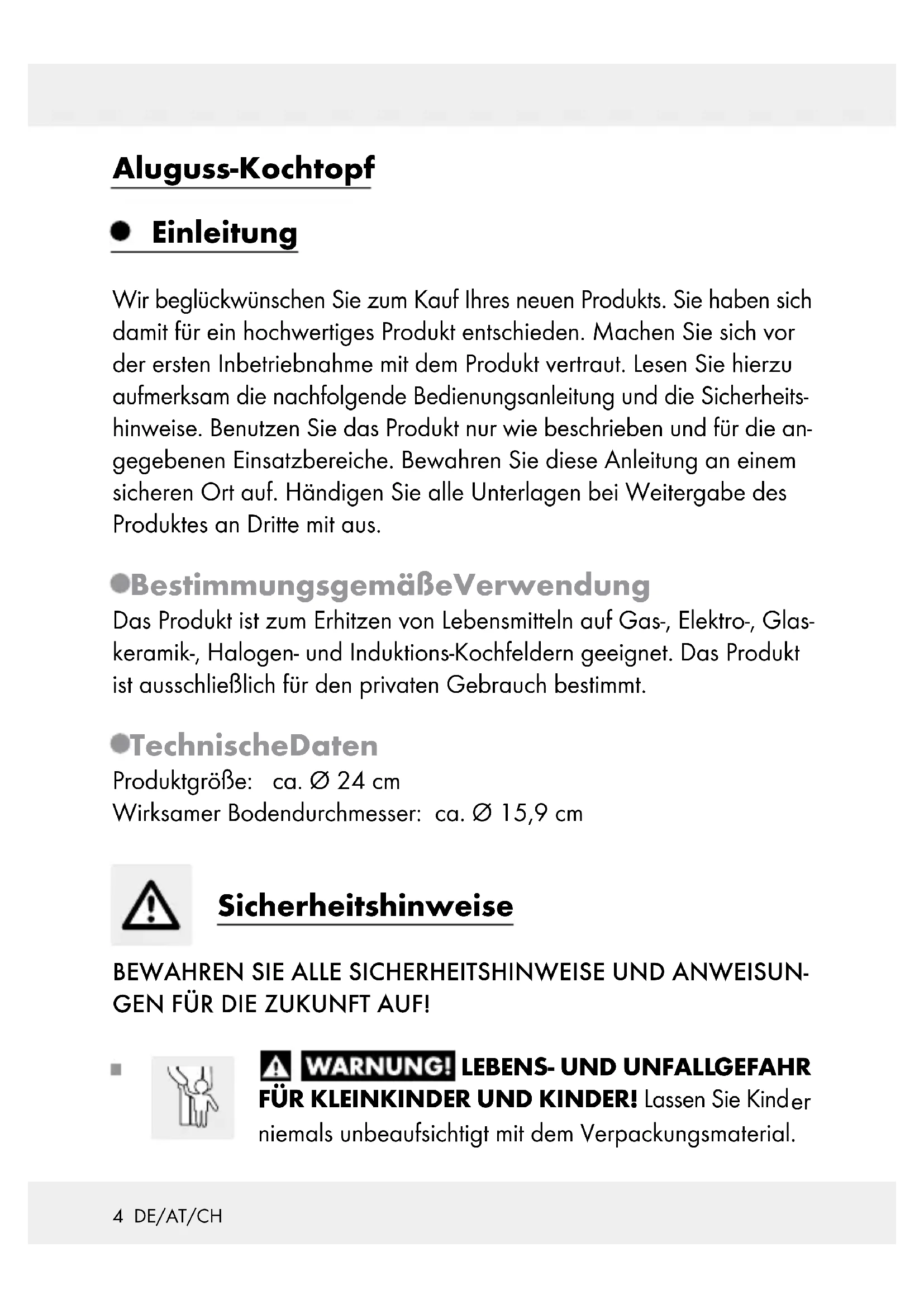 Instructions d‘utilisation et consignes de sécurité IAN 340647_2004DE / AT / CH Bedienungs- und Sicherheitshinweise Seite 3 FR / CH Instructions d‘utilisation et consignes de sécurité Page 10 IT / CH Indicazioni per l’uso e per la sicurezza Pagina 17Einleitung ............................................................................. Seite 4 Bestimmungsgemäße Verwendung ........................................ Seite 4 Technische Daten .................................................................... Seite 4 Sicherheitshinweise .................................................... Seite 4 Hinweis für Induktionskochfelder ................. Seite 6 Gebrauch ............................................................................. Seite 7 Entsorgung ......................................................................... Seite 7 Garantie ............................................................................... Seite 7 Abwicklung im Garantiefall .................................................... Seite 8 Service ..................................................................................... Seite 9 3 DE/AT/CH4 DE/AT/CH Aluguss-Kochtopf Einleitung Wir beglückwünschen Sie zum Kauf Ihres neuen Produkts. Sie haben sich damit für ein hochwertiges Produkt entschieden. Machen Sie sich vor der ersten Inbetriebnahme mit dem Produkt vertraut. Lesen Sie hierzu aufmerksam die nachfolgende Bedienungsanleitung und die Sicherheits- hinweise. Benutzen Sie das Produkt nur wie beschrieben und für die an- gegebenen Einsatzbereiche. Bewahren Sie diese Anleitung an einem sicheren Ort auf. Händigen Sie alle Unterlagen bei Weitergabe des Produktes an Dritte mit aus. Bestimmungsgemäße Verwendung Das Produkt ist zum Erhitzen von Lebensmitteln auf Gas-, Elektro-, Glas- keramik-, Halogen- und Induktions-Kochfeldern geeignet. Das Produkt ist ausschließlich für den privaten Gebrauch bestimmt. Technische Daten Produktgröße: ca. Ø 24 cm Wirksamer Bodendurchmesser: ca. Ø 15,9 cm Sicherheitshinweise
