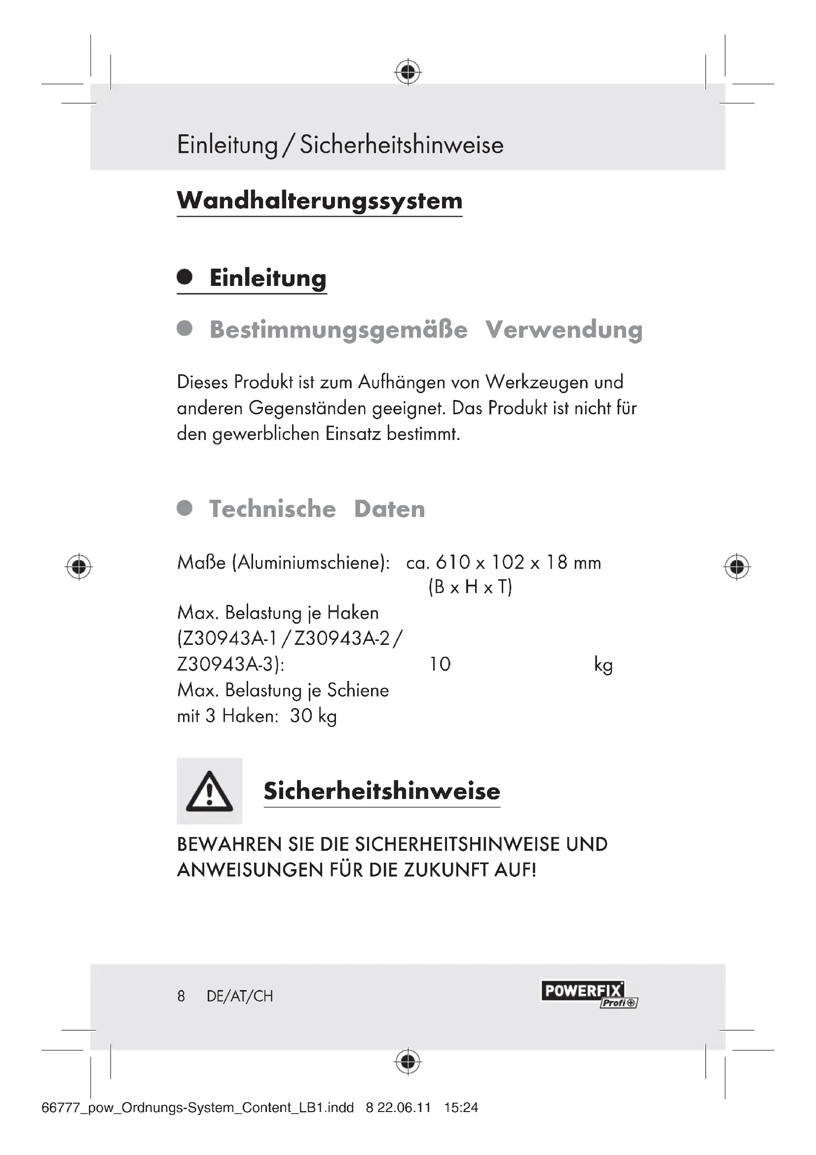 66777_pow_Ordnungs-System_Content_LB1.indd 6 22.06.11 15:247 DE/AT/CH Einleitung .................................................................Seite 8 Bestimmungsgemäße Verwendung .......................Seite 8 Technische Daten .......................................................Seite 8 Sicherheitshinweise ....................................Seite 8 Montage ...................................................................Seite 10 Reinigung und Pflege ................................Seite 11 Entsorgung ............................................................Seite 11 Inhaltsverzeichnis 66777_pow_Ordnungs-System_Content_LB1.indd 7 22.06.11 15:248 DE/AT/CH Einleitung / Sicherheitshinweise Wandhalterungssystem Einleitung Bestimmungsgemäße Verwendung Dieses Produkt ist zum Aufhängen von Werkzeugen und anderen Gegenständen geeignet. Das Produkt ist nicht für den gewerblichen Einsatz bestimmt. Technische Daten Maße (Aluminiumschiene): ca. 610 x 102 x 18 mm (B x H x T) Max. Belastung je Haken (Z30943A-1 / Z30943A-2 / Z30943A-3): 10 kg Max. Belastung je Schiene mit 3 Haken: 30 kg Sicherheitshinweise