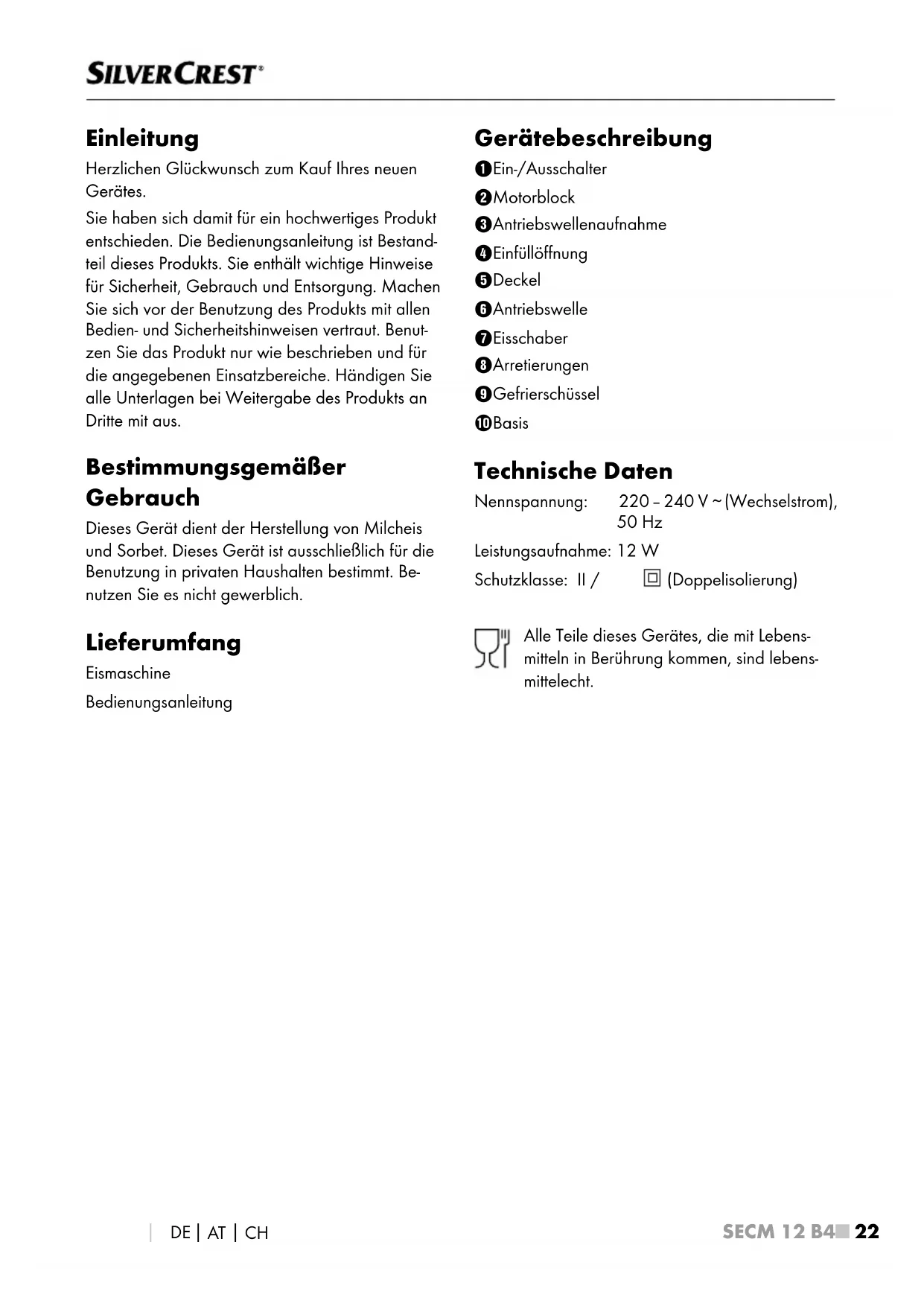 Einleitung Herzlichen Glückwunsch zum Kauf Ihres neuen Gerätes. Sie haben sich damit für ein hochwertiges Produkt entschieden. Die Bedienungsanleitung ist Bestand- teil dieses Produkts. Sie enthält wichtige Hinweise für Sicherheit, Gebrauch und Entsorgung. Machen Sie sich vor der Benutzung des Produkts mit allen Bedien- und Sicherheitshinweisen vertraut. Benut- zen Sie das Produkt nur wie beschrieben und für die angegebenen Einsatzbereiche. Händigen Sie alle Unterlagen bei Weitergabe des Produkts an Dritte mit aus. Bestimmungsgemäßer Gebrauch Dieses Gerät dient der Herstellung von Milcheis und Sorbet. Dieses Gerät ist ausschließlich für die Benutzung in privaten Haushalten bestimmt. Be- nutzen Sie es nicht gewerblich. Lieferumfang Eismaschine Bedienungsanleitung Gerätebeschreibung 1 Ein-/Ausschalter 2 Motorblock 3 Antriebswellenaufnahme 4 Einfüllöffnung 5 Deckel 6 Antriebswelle 7 Eisschaber 8 Arretierungen 9 Gefrierschüssel 0 Basis Technische Daten Nennspannung: 220 – 240 V ∼ (Wechselstrom), 50 Hz Leistungsaufnahme: 12 W Schutzklasse: II / (Doppelisolierung) Alle Teile dieses Gerätes, die mit Lebens- mitteln in Berührung kommen, sind lebens- mittelecht.SECM 12 B4