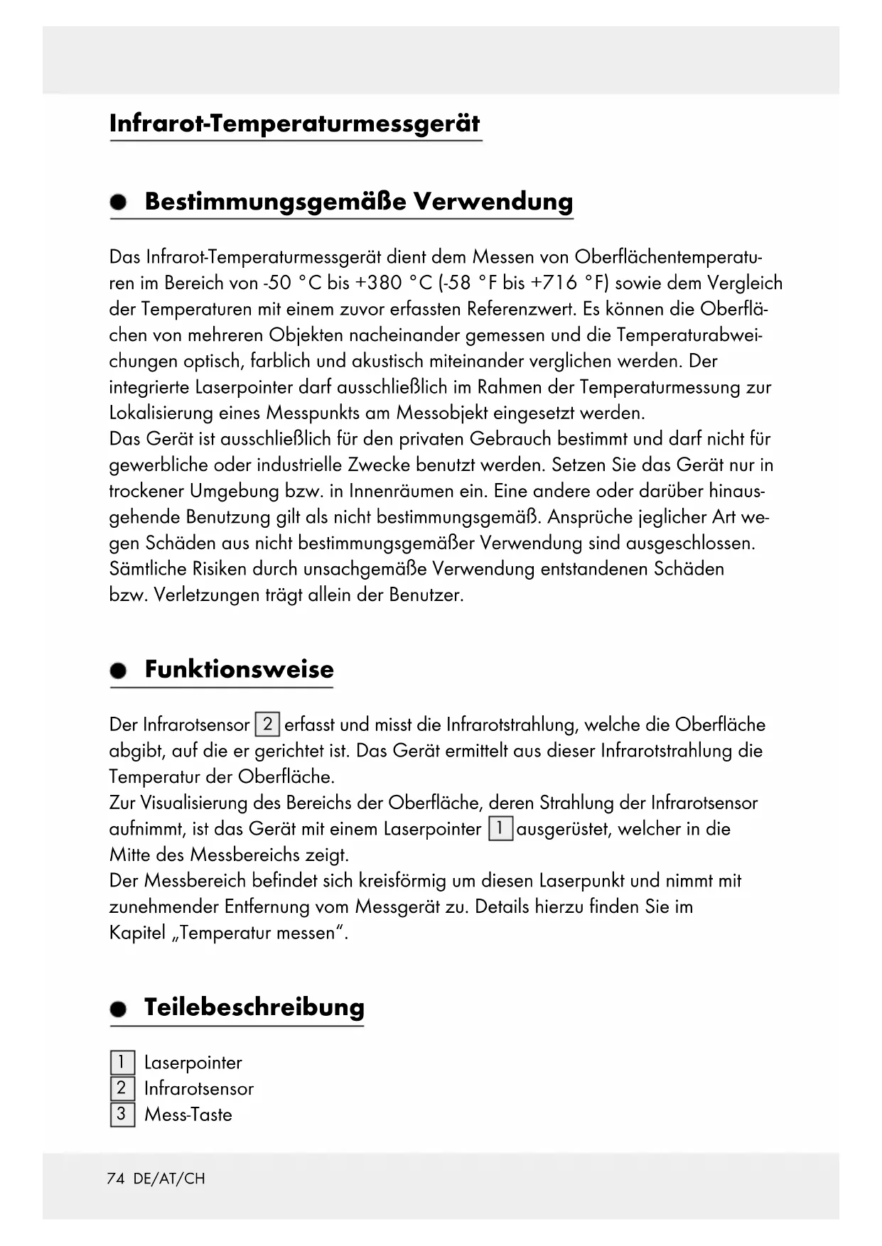 erfasst und misst die Infrarotstrahlung, welche die Oberfläche abgibt, auf die er gerichtet ist. Das Gerät ermittelt aus dieser Infrarotstrahlung die Temperatur der Oberfläche. Zur Visualisierung des Bereichs der Oberfläche, deren Strahlung der Infrarotsensor aufnimmt, ist das Gerät mit einem Laserpointer
