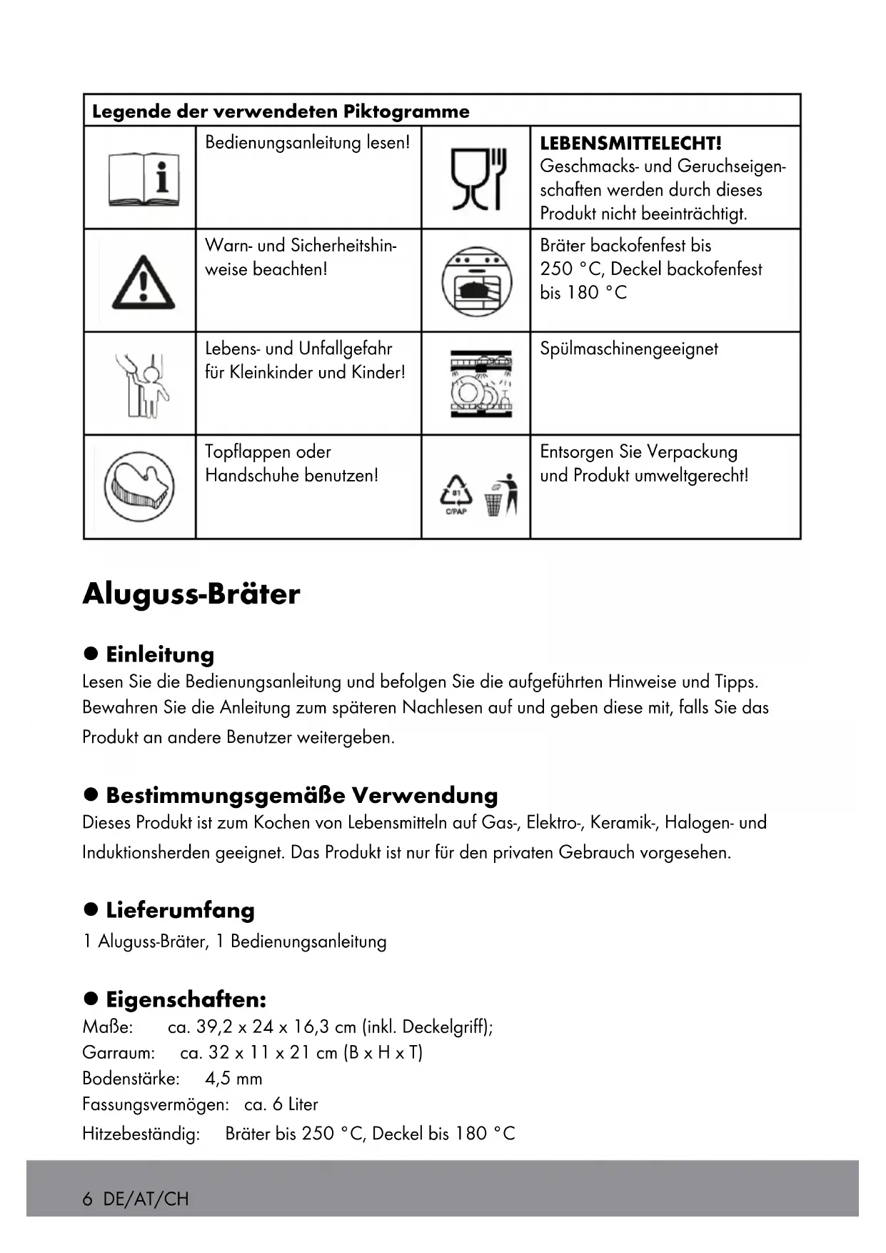 Disposal The packaging is made entirely of recyclable materials, which you may dispose of at local recycling facilities. Contact your local refuse disposal authority for more details of how to dispose of your worn-out product. GB/IE 5Aluguss-Bräter l Einleitung Lesen Sie die Bedienungsanleitung und befolgen Sie die aufgeführten Hinweise und Tipps. Bewahren Sie die Anleitung zum späteren Nachlesen auf und geben diese mit, falls Sie das Produkt an andere Benutzer weitergeben. l Bestimmungsgemäße Verwendung Dieses Produkt ist zum Kochen von Lebensmitteln auf Gas-, Elektro-, Keramik-, Halogen- und Induktionsherden geeignet. Das Produkt ist nur für den privaten Gebrauch vorgesehen. l Lieferumfang 1 Aluguss-Bräter, 1 Bedienungsanleitung l Eigenschaften: Maße: ca. 39,2 x 24 x 16,3 cm (inkl. Deckelgriff); Garraum: ca. 32 x 11 x 21 cm (B x H x T) Bodenstärke: 4,5 mm Fassungsvermögen: ca. 6 Liter Hitzebeständig: Bräter bis 250 °C, Deckel bis 180 °C 6 DE/AT/CH Legende der verwendeten Piktogramme Bedienungsanleitung lesen! LEBENSMITTELECHT! Geschmacks- und Geruchseigen- schaften werden durch dieses Produkt nicht beeinträchtigt. Warn- und Sicherheitshin- weise beachten! Bräter backofenfest bis 250 °C, Deckel backofenfest bis 180 °C Lebens- und Unfallgefahr für Kleinkinder und Kinder! Spülmaschinengeeignet Topflappen oder Handschuhe benutzen! Entsorgen Sie Verpackung und Produkt umweltgerecht!DE/AT/CH 7 Geeignet für folgende Umgebungen: Gasherd Induktion Elektroherd Halogen-Kochfeld Glas-Keramik-Kochfeld
