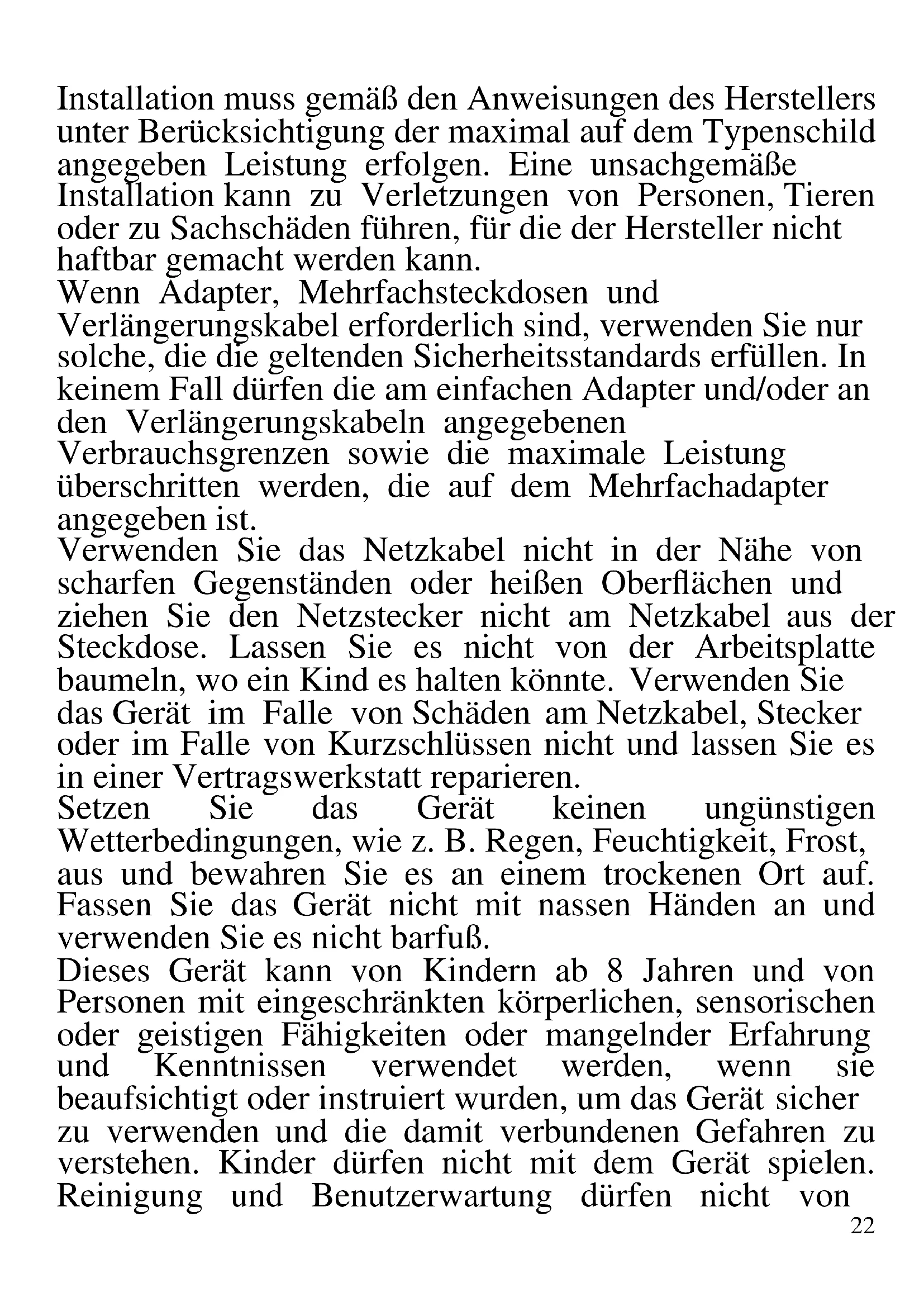 DEUTSCH: HINWEISE: Verwenden Sie das Gerät nur nach den Anweisungen in dieser Bedienungsanleitung. Jede anderweitige Verwendung gilt als unsachgemäß und gefährlich, und der Hersteller kann für Schäden haftbar gemacht werden, die durch eine unsachgemäße, falsche oder unvernünftige Verwendung verursacht werden. Stellen Sie vor der Verwendung sicher, dass das Gerät unversehrt ist. Im Zweifelsfall verwenden Sie es nicht und wenden Sie sich an den Kundendienst. Verpackungsmaterial (Plastiktüten, Styropor, Nägel, Klammern) muss für Kinder unzugänglich aufbewahrt werden, da es eine potenzielle Gefahrenquelle darstellt. Wir möchten Sie in diesem Zusammenhang auch daran erinnern, dass Verpackungsabfall der Mülltrennung zugeführt werden muss. Stellen Sie sicher, dass die Angaben auf dem Typenschild mit denen des Stromnetzes übereinstimmen. Die22 Installation muss gemäß den Anweisungen des Herstellers unter Berücksichtigung der maximal auf dem Typenschild angegeben Leistung erfolgen. Eine unsachgemäße Installation kann zu Verletzungen von Personen, Tieren oder zu Sachschäden führen, für die der Hersteller nicht haftbar gemacht werden kann. Wenn Adapter, Mehrfachsteckdosen und Verlängerungskabel erforderlich sind, verwenden Sie nur solche, die die geltenden Sicherheitsstandards erfüllen. In keinem Fall dürfen die am einfachen Adapter und/oder an den Verlängerungskabeln angegebenen Verbrauchsgrenzen sowie die maximale Leistung überschritten werden, die auf dem Mehrfachadapter angegeben ist. Verwenden Sie das Netzkabel nicht in der Nähe von scharfen Gegenständen oder heißen Oberflächen und ziehen Sie den Netzstecker nicht am Netzkabel aus der Steckdose. Lassen Sie es nicht von der Arbeitsplatte baumeln, wo ein Kind es halten könnte. Verwenden Sie das Gerät im Falle von Schäden am Netzkabel, Stecker oder im Falle von Kurzschlüssen nicht und lassen Sie es in einer Vertragswerkstatt reparieren. Setzen Sie das Gerät keinen ungünstigen Wetterbedingungen, wie z. B. Regen, Feuchtigkeit, Frost, aus und bewahren Sie es an einem trockenen Ort auf. Fassen Sie das Gerät nicht mit nassen Händen an und verwenden Sie es nicht barfuß. Dieses Gerät kann von Kindern ab 8 Jahren und von Personen mit eingeschränkten körperlichen, sensorischen oder geistigen Fähigkeiten oder mangelnder Erfahrung und Kenntnissen verwendet werden, wenn sie beaufsichtigt oder instruiert wurden, um das Gerät sicher zu verwenden und die damit verbundenen Gefahren zu verstehen. Kinder dürfen nicht mit dem Gerät spielen. Reinigung und Benutzerwartung dürfen nicht von23 Kindern ohne Aufsicht durchgeführt werden. Kinder dürfen nicht mit dem Gerät spielen. Bewahren Sie das Gerät und sein Netzanschluss außerhalb der Reichweite von Kinder unter 8 Jahren. Nicht für den gewerblichen Gebrauch bestimmt. Nur für den Hausgebrauch bestimmt. Im Falle eines Defekts und/oder von Fehlfunktionen das Gerät nicht öffnen. Für Reparaturen wenden Sie sich an eine vom Hersteller autorisierte Werkstatt (Vertragswerkstatt) und fordern Sie den Einsatz von Original-Ersatzteilen. Die Nichtbeachtung der obigen Vorschriften kann die Sicherheit beeinträchtigen und zur Folge haben, dass die Garantie erlischt. Dieses Gerät ist nur für den Hausgebrauch oder gleichwertiges bestimmt, in Situationen wie bspw.: Kantinen in kleinen Firmen oder ähnliche Arbeitsumgebungen, von Kunden in Hotels, Motels oder andere Art von touristische Unterkunft, wie ländlicher oder Wohn –Tourismus. Das Gerät darf nicht mit einer Zeitschaltuhr oder mit einem separaten Fernwirksystem betrieben werden Führen Sie vor jedem Gebrauch das Netzkabel aus. Setzen Sie das Produkt keinen Stößen aus, es könnte beschädigt werden. Verwenden Sie nur originale und kompatible Teile und Zubehör. Halten Sie das Gerät fern von brennbaren Materialien, Wärmequellen, Dampf-und kalte Zonen. ALLGEMEINE HINWEISE ACHTUNG: Verwenden Sie den Haarklipper nicht in der Badewanne, unter der Dusche und in der Duschkabine. Falls der Haartrockner ins Wasser fällt, nicht anfassen und ziehen Sie sofort der Netzstecker. Verhindern Sie Wasserspritzen. Falls Sie eines dieser Probleme feststellen, bevor sie es verwenden, nehmen Sie den Haarklipper zu einem autorisierten Service-24 Center; denselben darf nur von qualifiziertem Fachpersonal überprüft werden. Verwenden Sie den Haarklipper nicht in der Nähe von Waschbecken oder sonstige Behälter mit Wasser und verstauen Sie den Klipper in einem stabilen Regal, so dass es nicht auf den Boden oder in Behälter mit Flüssigkeit fällt. Wenn er heiß ist, stellen Sie den Klipper nur auf hitzebeständigen Oberflächen und weg von Kleidung, Papier oder brennbaren Flüssigkeiten. Die Lüftungsöffnungen nicht verhindern, da diese die Motoreinheit beschädigen können. Achten Sie darauf, lassen Sie Ihre Haare nicht zu nahe an diesen Öffnungen, weil den Klipper sie saugen und verbrennen kann. Das Gerät niemals unbeaufsichtigt lassen. Im Falle von Überhitzung, durch übermäßigen Gebrauch oder durch zufällige Blockierung der Entlüftungsöffnungen, sperrt der Sicherheitsthermostat den Motoranlauf. Warten Sie bis die vollständige Abkühlung des Motors bis Sie es neu in Betrieb setzen können. Benutzen Sie das Gerät nie als Heizer. Das Netzkabel nicht einwickeln, wenn das Gerät in Betrieb ist. Gerät keine Schocks aussetzen, die beschädigen können. Nach jedem Gebrauch, lassen Sie das Gerät abkühlen, bevor Sie es wegräumen. Wenn das Gerät im Badezimmern genutzt wird, ist nach dem Gebrauch der Netzstecker zuziehen, weil die Nähe von Wasser eine Gefahr darstellt, auch wenn das Gerät ausgeschaltet ist. Um einen besseren Schutz zu gewährleisten wird die Installation einer Fehlerstromschutzeinrichtung mit einem nominalen Auslösestrom von maximal 30 mA, im Badezimmer Stromkries empfohlen. Fragen Sie Ihren Installateur.25