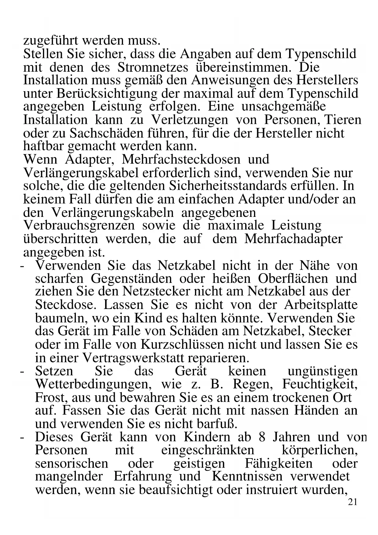DEUTSCH: HINWEISE: Verwenden Sie das Gerät nur nach den Anweisungen in dieser Bedienungsanleitung. Jede anderweitige Verwendung gilt als unsachgemäß und gefährlich, und der Hersteller kann für Schäden haftbar gemacht werden, die durch eine unsachgemäße, falsche oder unvernünftige Verwendung verursacht werden. Stellen Sie vor der Verwendung sicher, dass das Gerät unversehrt ist. Im Zweifelsfall verwenden Sie es nicht und wenden Sie sich an den Kundendienst. Verpackungsmaterial (Plastiktüten, Styropor, Nägel, Klammern) muss für Kinder unzugänglich aufbewahrt werden, da es eine potenzielle Gefahrenquelle darstellt. Wir möchten Sie in diesem Zusammenhang auch daran erinnern, dass Verpackungsabfall der Mülltrennung21 zugeführt werden muss. Stellen Sie sicher, dass die Angaben auf dem Typenschild mit denen des Stromnetzes übereinstimmen. Die Installation muss gemäß den Anweisungen des Herstellers unter Berücksichtigung der maximal auf dem Typenschild angegeben Leistung erfolgen. Eine unsachgemäße Installation kann zu Verletzungen von Personen, Tieren oder zu Sachschäden führen, für die der Hersteller nicht haftbar gemacht werden kann. Wenn Adapter, Mehrfachsteckdosen und Verlängerungskabel erforderlich sind, verwenden Sie nur solche, die die geltenden Sicherheitsstandards erfüllen. In keinem Fall dürfen die am einfachen Adapter und/oder an den Verlängerungskabeln angegebenen Verbrauchsgrenzen sowie die maximale Leistung überschritten werden, die auf dem Mehrfachadapter angegeben ist. - Verwenden Sie das Netzkabel nicht in der Nähe von scharfen Gegenständen oder heißen Oberflächen und ziehen Sie den Netzstecker nicht am Netzkabel aus der Steckdose. Lassen Sie es nicht von der Arbeitsplatte baumeln, wo ein Kind es halten könnte. Verwenden Sie das Gerät im Falle von Schäden am Netzkabel, Stecker oder im Falle von Kurzschlüssen nicht und lassen Sie es in einer Vertragswerkstatt reparieren. - Setzen Sie das Gerät keinen ungünstigen Wetterbedingungen, wie z. B. Regen, Feuchtigkeit, Frost, aus und bewahren Sie es an einem trockenen Ort auf. Fassen Sie das Gerät nicht mit nassen Händen an und verwenden Sie es nicht barfuß. - Dieses Gerät kann von Kindern ab 8 Jahren und von Personen mit eingeschränkten körperlichen, sensorischen oder geistigen Fähigkeiten oder mangelnder Erfahrung und Kenntnissen verwendet werden, wenn sie beaufsichtigt oder instruiert wurden,22 um das Gerät sicher zu verwenden und die damit verbundenen Gefahren zu verstehen. Kinder dürfen nicht mit dem Gerät spielen. Reinigung und Benutzerwartung dürfen nicht von Kindern ohne Aufsicht durchgeführt werden. - Kinder dürfen nicht mit dem Gerät spielen. - Bewahren Sie das Gerät und sein Netzanschluss außerhalb der Reichweite von Kinder unter 8 Jahren. - Nicht für den gewerblichen Gebrauch bestimmt. Nur für den Hausgebrauch bestimmt. Im Falle eines Defekts und/oder von Fehlfunktionen das Gerät nicht öffnen. Für Reparaturen wenden Sie sich an eine vom Hersteller autorisierte Werkstatt (Vertragswerkstatt) und fordern Sie den Einsatz von Original-Ersatzteilen. Die Nichtbeachtung der obigen Vorschriften kann die Sicherheit beeinträchtigen und zur Folge haben, dass die Garantie erlischt. Dieses Gerät ist nur für den Hausgebrauch oder gleichwertiges bestimmt, in Situationen wie bspw.: Kantinen in kleinen Firmen oder ähnliche Arbeitsumgebungen, von Kunden in Hotels, Motels oder andere Art von touristische Unterkunft, wie ländlicher oder Wohn –Tourismus. Das Gerät darf nicht mit einer Zeitschaltuhr oder mit einem separaten Fernwirksystem betrieben werden Führen Sie vor jedem Gebrauch das Netzkabel aus. Setzen Sie das Produkt keinen Stößen aus, es könnte beschädigt werden. Verwenden Sie nur originale und kompatible Teile und Zubehör. Halten Sie das Gerät fern von brennbaren Materialien, Wärmequellen, Dampf-und kalte Zonen. ALLGEMEINE HINWEISE ACHTUNG: Verwenden Sie den Haarklipper nicht in der Badewanne, unter der Dusche und in23 der Duschkabine. Falls der Haarklipper ins Wasser fällt, nicht anfassen und ziehen Sie sofort der Netzstecker. Verhindern Sie Wasserspritzen. Falls Sie eines dieser Probleme feststellen, bevor sie es verwenden, nehmen Sie den Haarklipper zu einem autorisierten Service-Center; denselben darf nur von qualifiziertem Fachpersonal überprüft werden. - Verwenden Sie den Haarklipper nicht in der Nähe von Waschbecken oder sonstige Behälter mit Wasser und verstauen Sie den Klipper in einem stabilen Regal, so dass es nicht auf den Boden oder in Behälter mit Flüssigkeit fällt. Wenn er heiß ist, stellen Sie den Klipper nur auf hitzebeständigen Oberflächen und weg von Kleidung, Papier oder brennbaren Flüssigkeiten. - Die Lüftungsöffnungen nicht verhindern, da diese die Motoreinheit beschädigen können. Achten Sie darauf, lassen Sie Ihre Haare nicht zu nahe an diesen Öffnungen, weil den Klipper sie saugen und verbrennen kann. Das Gerät niemals unbeaufsichtigt lassen. - Im Falle von Überhitzung, durch übermäßigen Gebrauch oder durch zufällige Blockierung der Entlüftungsöffnungen, sperrt der Sicherheitsthermostat den Motoranlauf. Warten Sie bis die vollständige Abkühlung des Motors bis Sie es neu in Betrieb setzen können. Wenn der Trockner in Betrieb ist, wird die Lüftungsöffnung sehr warm. Berühren Sie sie nicht, da diese schwere Verbrennungen verursachen kann. Benutzen Sie das Gerät nie als Heizer. - Das Netzkabel nicht einwickeln, wenn das Gerät in Betrieb ist. Nach jedem Gebrauch, lassen Sie das Gerät abkühlen, bevor Sie es wegräumen. - Wenn das Gerät im Badezimmern benutzt wird, ist nach dem Gebrauch der Netzstecker zuziehen, weil die Nähe von Wasser eine Gefahr darstellt, auch wenn das Gerät ausgeschaltet ist.24 - Um einen besseren Schutz zu gewährleisten wird die Installation einer Fehlerstromschutzeinrichtung mit einem nominalen Auslösestrom von maximal 30 mA, im Badezimmer Stromkries empfohlen. Fragen Sie Ihren In