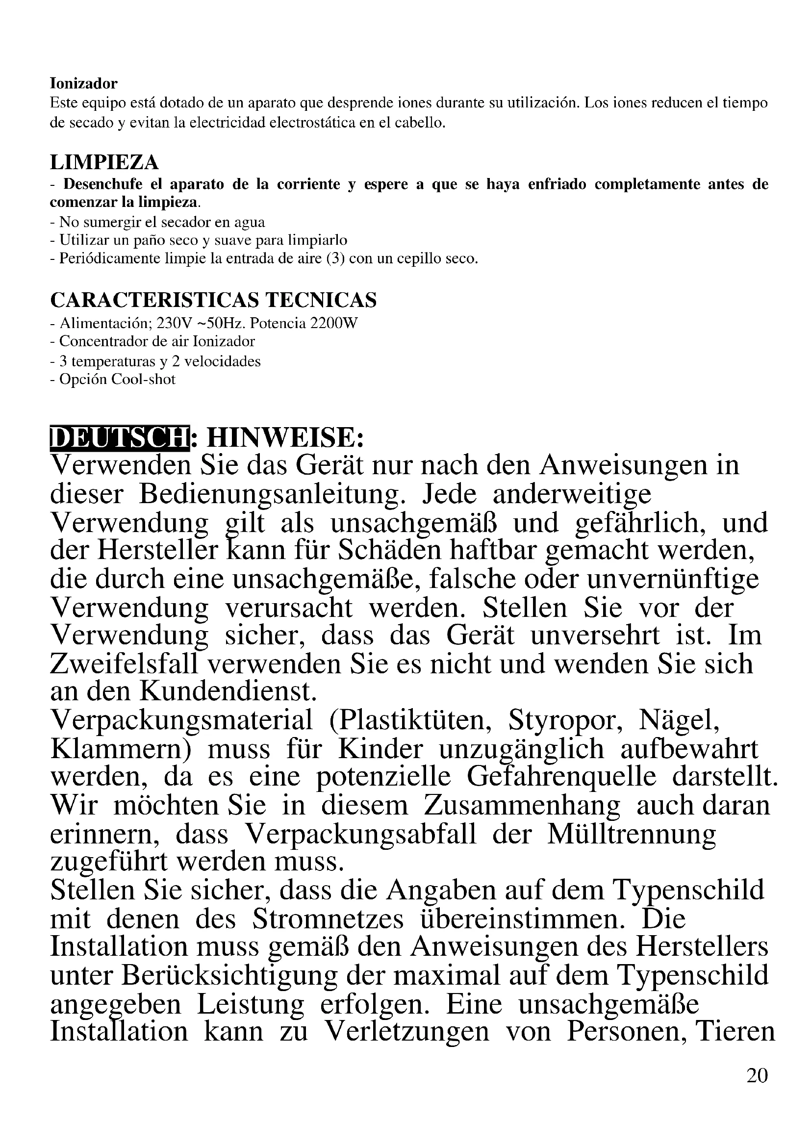 INBETRIEBNAHME - Setzen Sie die Betriebstaste (7) auf “0” und schalten Sie den Trockner in die Steckdose ein. - Dieser Trockner arbeitet mit zwei Geschwindigkeiten: setzen Sie den Knopf (7) auf "I" für die langsamste Geschwindigkeit und "II" für die höchste Geschwindigkeit. - Wählen Sie die Lufttemperatur indem Sie die Luftstromeinstellung (6) benutzen. - Achtung: die Luftaustrittsöffnung (1) erwärmt sehr schnell. Berühren Sie den trockner nicht, wenn er in Betrieb ist. - Nach Abschluss des Trocknungsprozesses, setzen Sie die Betriebstaste (7) auf Position "0". - Der Haartrockner vollständig abkühlen lassen (ungefähr 20 Minuten). - Sobald das Gerät vollständig kalt ist, bewahren Sie es außerhalb der Reichweite von Kinder. Temperaturschalter Dieses Gerät bietet die Temperatur des Luftstroms zu wählen. Setzen Sie den entsprechenden Bedienknopf (7) auf "O" für eine Raumtemperatur Luftstrom zu erhalten, "I" für mäßige heiße Luft, e "II für heiße Luft. Kalte Luft Der Haartrockner befreit konstanten Heißluftzufluss. Drücken Sie die Kalt-Taste (5), der innere Widerstand wird vorübergehend deaktiviert und innerhalb wenigen Sekunden bläst das Gerät Raumtemperatur Luft. Ionisation. Dieses Gerät ist mit einer Einrichtung ausgestattet, um Ionen während der Verwendung zu befreien. Die Ionisation Funktion reduziert die Trocknungszeit, erleichtert die Frisur bei Entfernung des elektrostatischen Effekt. Reinigung Vor der Reinigung muss das Gerät ausgeschaltet und der Stecker aus der Steckdose gezogen werden und der Haartrockner abkühlen lassen. Tauchen Sie den Trockner niemals in Wasser, reinigen Sie ihn mit einem weichen, feuchten Tuch. Die Entlüftung (3) mit einer trockenen Bürste regelmäßig reinigen. TECHNISCHE DATEN