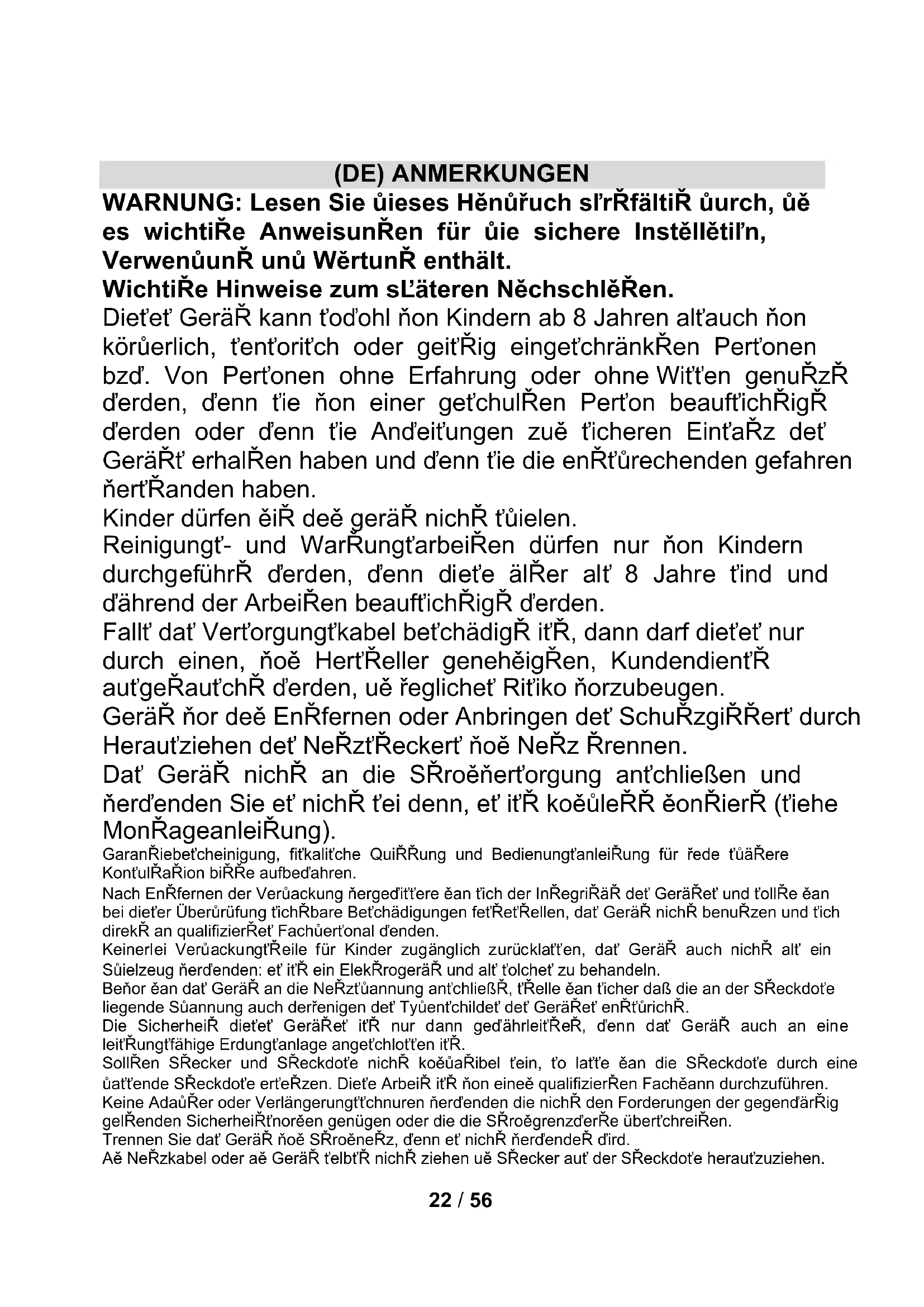 DISPOSITION PILES - Retirer les piles de l’appareil avant de l’éliminer. Ne pas jeter les piles avec les ordures ménagères. Les piles doivent être éliminées dans des conteneurs spéciaux ou dans des points de collecte spécifiques. Une collecte séparée adéquate permet d’éviter d’éventuels effets négatifs sur l’environnement et la santé. Pour retirer les piles, suivre les instructions dans le UTILISATION. INFORMATION UTILISATEUR « Mise en oeuvre de la directive 2012/19/UE sur les déchets d’équipements électriques et électroniques (DEEE) », relative à la réduction de l’utilisation de substances dangereuses dans les appareils électriques et électroniques, ainsi qu’à l’élimination des déchets. Le symbole de la poubelle sur roulettes barrée sur l’appareil ou sur son emballage indique que le produit doit être éliminé séparément des autres déchets à la fin de sa durée de vie. L’utilisateur doit donc apporter l’appareil à jeter à des centres de collecte séparés appropriés pour les déchets électriques et électroniques. Pour plus de détails, veuillez contacter l’autorité locale spéciale. Une collecte séparée appropriée de l’appareil pour un recyclage, un traitement ou une élimination respectueux de l’environnement permet d’éviter les dommages à l’environnement et à la santé humaine et encourage la réutilisation et/ou le recyclage des matériaux qui composent l’appareil.21 / 56 L’élimination abusive du produit par l’utilisateur entraînera l’application d’amendes administratives conformément aux lois en vigueur. (FR) GARANTIE Conditions La garantie est valable 2 ans à partir de la date d’achat. Cette garantie n’est valable que si correctement remplie et accompagnée par le ticket de caisse prouvant le jour de l’achat. Pour garantie, on entend le remplacement ou la réparation des composants de l’appareil défectueux à l’origine pour vice de fabrication. Il est toutefois garantie l’assistance (payée) pour les articles hors garantie. La Maison de construction dégage toute responsabilité en cas de dommages à personnes, animaux et choses, à la suite de l’utilisation impropre de l’appareil et à la non-observation des règles indiquées dans le mode d’emploi. Limitations Tout droit de garantie et toute notre responsabilité sont dégagés en cas de: - dommages provoqués par personnel non autorisé. - emploi, conservation ou transport non adéquats. Ils sont toutefois exclus de la garantie les pertes de performances esthétiques ou telles qui ne compromettent pas le fonctionnement de l’appareil. Si malgré le soin dans la sélection des matériaux et les efforts dans la réalisation du produit que vous venez d’acheter, vous remarquez des défauts ou si vous avez besoin de renseignements, nous vous prions de bien vouloir contacter le revendeur de votre zone.22 / 56 (DE) ANMERKUNGEN WARNUNG: Lesen Sie dieses Handbuch sorgfältig durch, da es wichtige Anweisungen für die sichere Installation, Verwendung und Wartung enthält. Wichtige Hinweise zum späteren Nachschlagen. Dieses Gerät kann sowohl von Kindern ab 8 Jahren alsauch von körperlich, sensorisch oder geistig eingeschränkten Personen bzw. Von Personen ohne Erfahrung oder ohne Wissen genutzt werden, wenn sie von einer geschulten Person beaufsichtigt werden oder wenn sie Anweisungen zum sicheren Einsatz des Geräts erhalten haben und wenn sie die entsprechenden gefahren verstanden haben. Kinder dürfen mit dem gerät nicht spielen. Reinigungs- und Wartungsarbeiten dürfen nur von Kindern durchgeführt werden, wenn diese älter als 8 Jahre sind und während der Arbeiten beaufsichtigt werden. Falls das Versorgungskabel beschädigt ist, dann darf dieses nur durch einen, vom Hersteller genehmigten, Kundendienst ausgetauscht werden, um jegliches Risiko vorzubeugen. Gerät vor dem Entfernen oder Anbringen des Schutzgitters durch Herausziehen des Netzsteckers vom Netz trennen. Das Gerät nicht an die Stromversorgung anschließen und verwenden Sie es nicht sei denn, es ist komplett montiert (siehe Montageanleitung). Garantiebescheinigung, fiskalische Quittung und Bedienungsanleitung für jede spätere Konsultation bitte aufbewahren. Nach Entfernen der Verpackung vergewissere man sich der Integrität des Gerätes und sollte man bei dieser Überprüfung sichtbare Beschädigungen festestellen, das Gerät nicht benutzen und sich direkt an qualifiziertes Fachpersonal wenden. Keinerlei Verpackungsteile für Kinder zugänglich zurücklassen, das Gerät auch nicht als ein Spielzeug verwenden: es ist ein Elektrogerät und als solches zu behandeln. Bevor man das Gerät an die Netzspannung anschließt, stelle man sicher daß die an der Steckdose liegende Spannung auch derjenigen des Typenschildes des Gerätes entspricht. Die Sicherheit dieses Gerätes ist nur dann gewährleistet, wenn das Gerät auch an eine leistungsfähige Erdungsanlage angeschlossen ist. Sollten Stecker und Steckdose nicht kompatibel sein, so lasse man die Steckdose durch eine passende Steckdose ersetzen. Diese Arbeit ist von einem qualifizierten Fachmann durchzuführen. Keine Adapter oder Verlängerungsschnuren verwenden die nicht den Forderungen der gegenwärtig geltenden Sicherheitsnormen genügen oder die die Stromgrenzwerte überschreiten. Trennen Sie das Gerät vom Stromnetz, wenn es nicht verwendet wird. Am Netzkabel oder am Gerät selbst nicht ziehen um Stecker aus der Steckdose herauszuziehen.23 / 56 Der Gebrauch irgendeines Elektrogerätes erfordert immer die Beachtung einiger grundlegenden Regeln und zwar insbesondere: - Man darf niemals das Gerät mit nassen oder feuchten Händen berühren. - Das Gerät niemals barfuß benutzen. - Das Gerät nicht den Witterungseinflüssen ausgesetzt lassen (Regen, Sonnenstrahlung). - Gerät nicht Schlag-oder Stoßbeanspruchungen aussetzen. Es ist zu empfehlen, das Netzkabel für seine ganze Länge abzuwickeln um somit event