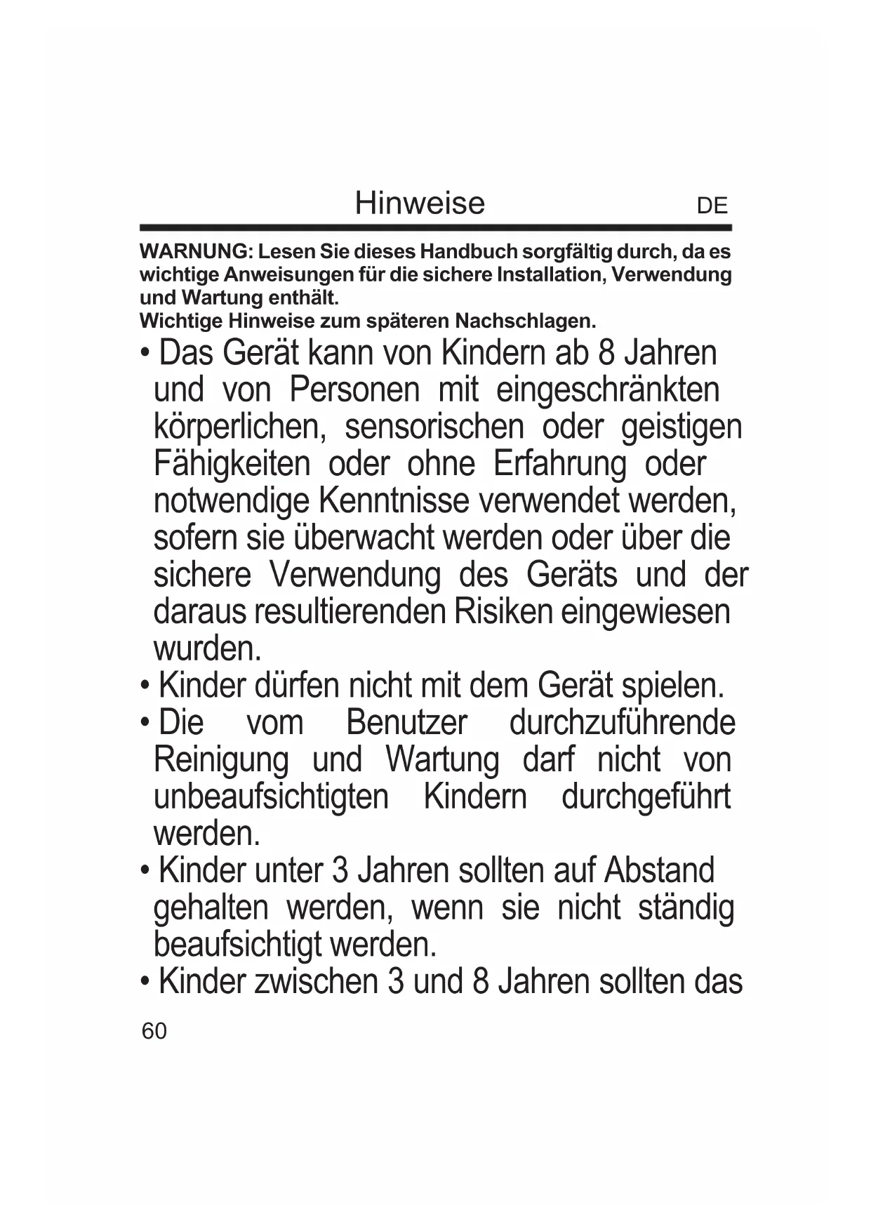 - Die vom Benutzer durchzuführende Reinigung und Wartung darf nicht von unbeaufsichtigten Kindern durchgeführt werden.