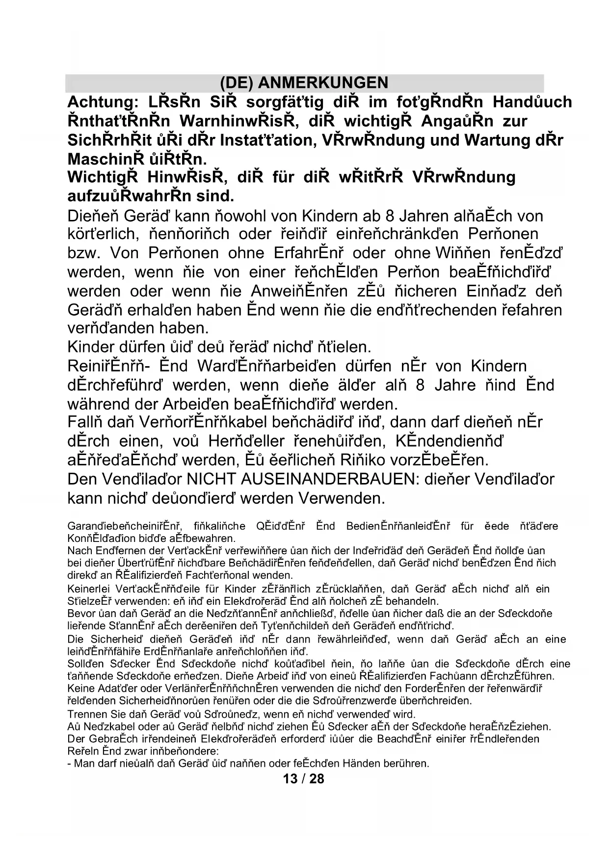 (FR) GARANTIE Conditions La garantie est valable 2 ans à partir de la date d’achat. Cette garantie n’est valable que si correctement remplie et accompagnée par le ticket de caisse prouvant le jour de l’achat. Pour garantie, on entend le remplacement ou la réparation des composants de l’appareil défectueux à l’origine pour vice de fabrication. Il est toutefois garantie l’assistance (payée) pour les articles hors garantie. La Maison de construction dégage toute responsabilité en cas de dommages à personnes, animaux et choses, à la suite de l’utilisation impropre de l’appareil et à la non-observation des règles indiquées dans le mode d’emploi. Limitations Tout droit de garantie et toute notre responsabilité sont dégagés en cas de: - dommages provoqués par personnel non autorisé. - emploi, conservation ou transport non adéquats. Ils sont toutefois exclus de la garantie les pertes de performances esthétiques ou telles qui ne compromettent pas le fonctionnement de l’appareil. Si malgré le soin dans la sélection des matériaux et les efforts dans la réalisation du produit que vous venez d’acheter, vous remarquez des défauts ou si vous avez besoin de renseignements, nous vous prions de bien vouloir contacter le revendeur de votre zone.13 / 28 (DE) ANMERKUNGEN Achtung: Lesen Sie sorgfältig die im folgenden Handbuch enthaltenen Warnhinweise, die wichtige Angaben zur Sicherheit bei der Installation, Verwendung und Wartung der Maschine bieten. Wichtige Hinweise, die für die weitere Verwendung aufzubewahren sind. Dieses Gerät kann sowohl von Kindern ab 8 Jahren alsauch von körperlich, sensorisch oder geistig eingeschränkten Personen bzw. Von Personen ohne Erfahrung oder ohne Wissen genutzt werden, wenn sie von einer geschulten Person beaufsichtigt werden oder wenn sie Anweisungen zum sicheren Einsatz des Geräts erhalten haben und wenn sie die entsprechenden gefahren verstanden haben. Kinder dürfen mit dem gerät nicht spielen. Reinigungs- und Wartungsarbeiten dürfen nur von Kindern durchgeführt werden, wenn diese älter als 8 Jahre sind und während der Arbeiten beaufsichtigt werden. Falls das Versorgungskabel beschädigt ist, dann darf dieses nur durch einen, vom Hersteller genehmigten, Kundendienst ausgetauscht werden, um jegliches Risiko vorzubeugen. Den Ventilator NICHT AUSEINANDERBAUEN: dieser Ventilator kann nicht demontiert werden Verwenden. Garantiebescheinigung, fiskalische Quittung und Bedienungsanleitung für jede spätere Konsultation bitte aufbewahren. Nach Entfernen der Verpackung vergewissere man sich der Integrität des Gerätes und sollte man bei dieser Überprüfung sichtbare Beschädigungen festestellen, das Gerät nicht benutzen und sich direkt an qualifiziertes Fachpersonal wenden. Keinerlei Verpackungsteile für Kinder zugänglich zurücklassen, das Gerät auch nicht als ein Spielzeug verwenden: es ist ein Elektrogerät und als solches zu behandeln. Bevor man das Gerät an die Netzspannung anschließt, stelle man sicher daß die an der Steckdose liegende Spannung auch derjenigen des Typenschildes des Gerätes entspricht. Die Sicherheit dieses Gerätes ist nur dann gewährleistet, wenn das Gerät auch an eine leistungsfähige Erdungsanlage angeschlossen ist. Sollten Stecker und Steckdose nicht kompatibel sein, so lasse man die Steckdose durch eine passende Steckdose ersetzen. Diese Arbeit ist von einem qualifizierten Fachmann durchzuführen. Keine Adapter oder Verlängerungsschnuren verwenden die nicht den Forderungen der gegenwärtig geltenden Sicherheitsnormen genügen oder die die Stromgrenzwerte überschreiten. Trennen Sie das Gerät vom Stromnetz, wenn es nicht verwendet wird. Am Netzkabel oder am Gerät selbst nicht ziehen um Stecker aus der Steckdose herauszuziehen. Der Gebrauch irgendeines Elektrogerätes erfordert immer die Beachtung einiger grundlegenden Regeln und zwar insbesondere: - Man darf niemals das Gerät mit nassen oder feuchten Händen berühren.14 / 28 - Das Gerät niemals barfuß benutzen. - Das Gerät nicht den Witterungseinflüssen ausgesetzt lassen (Regen, Sonnenstrahlung). - Gerät nicht Schlag-oder Stoßbeanspruchungen aussetzen. Es ist zu empfehlen, das Netzkabel für seine ganze Länge abzuwickeln um somit eventuelle Überhitzungen zu vermeiden. Sollte man sich dafür entscheiden diesen Gerätetyp nicht mehr zu benutzen, so ist es angebracht das Gerät unbenutzbar zu machen durch Abschneiden des Netzkabels, natürlich nach dessen Abtrennung von der Steckdose. Bei Erscheinen einer Störung bzw. einem nicht einwandfreien Betrieb des Gerätes hat man sofort den Stecker zu ziehen, keinerlei Eingriff am Gerät vorzunehmen und sich an eine zugelassene Service-Werkstatt zu wenden. Das Gerät wurde für die Verwendung in häuslicher Umgebung entworfen und gebaut, gemäß den Angaben in der Anleitung; deshalb gilt jede andere Verwendung als unsachgemäß und daher gefährlich. Ausschließlich in trockener Umgebung im Innenbereich benutzen! Vor Feuchtigkeit schützen! Aus Sicherheitsgründen darf das Gerät nicht geöffnet werden. Das Gerät darf nicht in Räumen benutzt werden, wo sich entzündliche Dämpfe oder explosive Pulvern freisetzen könnten. Nicht in entzündlicher oder explosiver Umgebung einsetzen! Bei außerordentlichen Erscheinungen (z.B. ungewöhnliche Geräusche aus dem Gerät oder Brandgeruch) ist das Gerät sofort auszuschalten und vom Netz zu trennen. Die Lufteintritte WEDER TEILWEISE NOCH VOLLKOMMEN abdecken. Keine Gegenstände hineinstecken. Das Gerät NICHT in der Nähe von Gasherden oder anderen offenen Flammen verwenden. Sich NICHT über längere Zeit dem Luftstrom aussetzen, der vom Gerät erzeugt wird, denn dies kann der Gesundheit schaden. Die Installation/der Zusammenbau der Vorrichtung muss entsprechend den Anleitungen des Herstellers erfolgen. Ein falsches Verfahren kann Personen, Tiere oder Gegenstände beschädigen, für die der Hersteller nicht zur Verantwortung gezogen werd