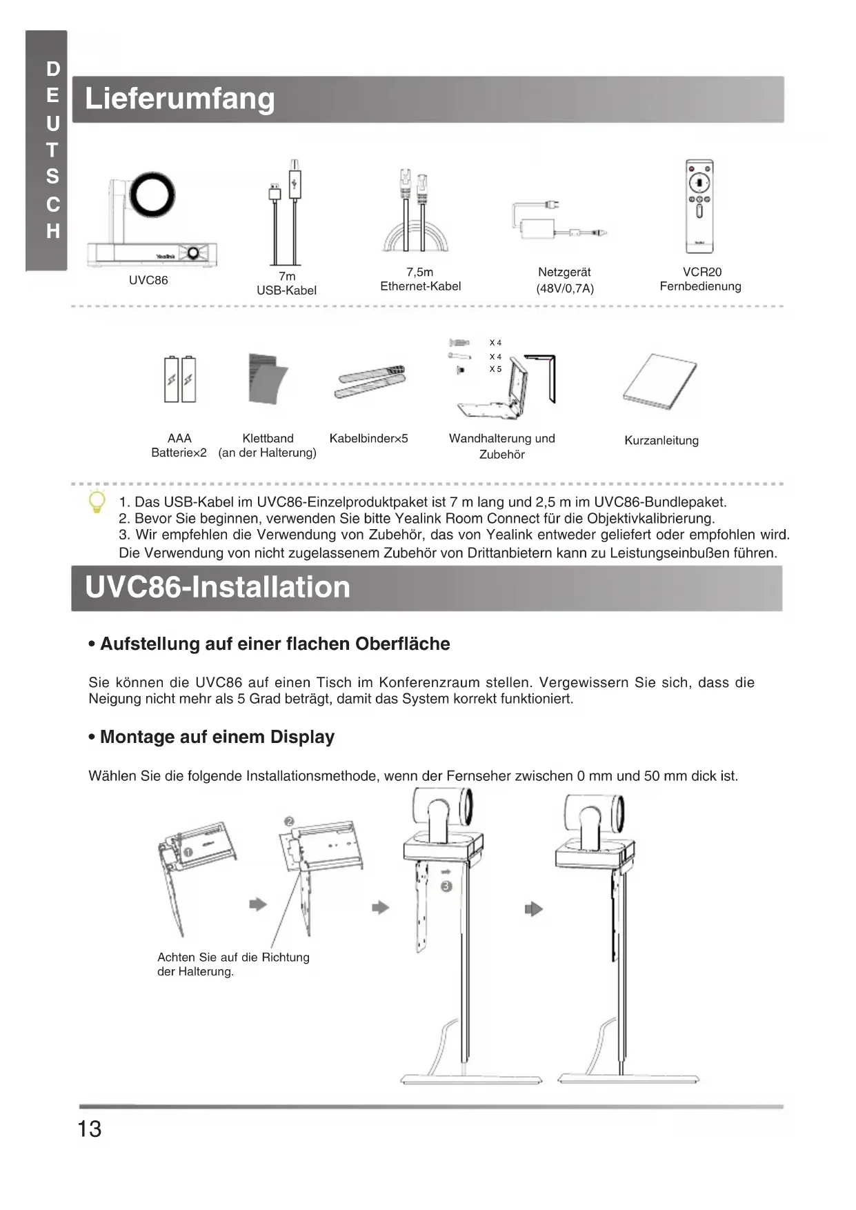 Lieferumfang UVC86 USB-Kabel7,5m Ethernet-Kabel Netzgerät (48V/0,7A) VCR20 Fernbedienung AAA Batterie×2Kabelbinder×5Klettband(an der Halterung)Wandhalterung und Zubehör Kurzanleitung