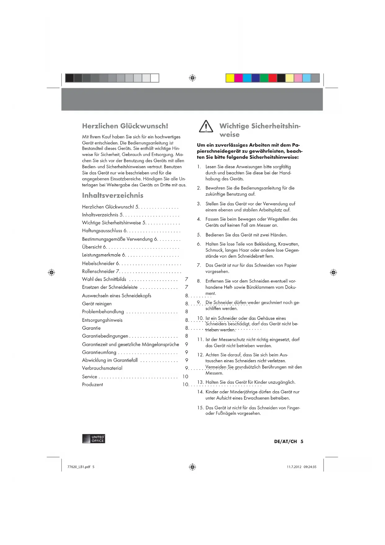 77620_LB1.pdf 477620_LB1.pdf 4 11.7.2012 09:24:3511.7.2012 09:24:35DE/AT/CH 5 Herzlichen Glückwunsch! Mit Ihrem Kauf haben Sie sich für ein hochwertiges Gerät entschieden. Die Bedienungsanleitung ist Bestandteil dieses Geräts. Sie enthält wichtige Hin weise für Sicherheit, Gebrauch und Entsorgung. Ma chen Sie sich vor der Benutzung des Geräts mit allen Bedien- und Sicherheitshinweisen vertraut. Benutzen Sie das Gerät nur wie beschrieben und für die angegebenen Einsatzbereiche. Händigen Sie alle Un terlagen bei Weitergabe des Geräts an Dritte mit aus. Inhaltsverzeichnis Herzlichen Glückwunsch! 5............... Inhaltsverzeichnis 5..................... Wichtige Sicherheitshinweise 5............. Haftungsausschluss 6.................... Bestimmungsgemäße Verwendung 6......... Übersicht 6........................... Leistungsmerkmale 6.................... Hebelschneider 6....................... Rollenschneider 7....................... Wahl des Schnittbilds 7.................. Ersetzen der Schneideleiste 7.............. Auswechseln eines Schneidekopfs 8......... Gerät reinigen 8....................... Problembehandlung 8................... Entsorgungshinweis 8.................... Garantie 8........................... Garantiebedingungen 8.................. Garantiezeit und gesetzliche Mängelansprüche 9 Garantieumfang 9...................... Abwicklung im Garantiefall 9.............. Verbrauchsmaterial 9.................... Service 10............................. Produzent 10........................... Wichtige Sicherheitshin weise Um ein zuverlässiges Arbeiten mit dem Pa pierschneidegerät zu gewährleisten, beach ten Sie bitte folgende Sicherheitshinweise: