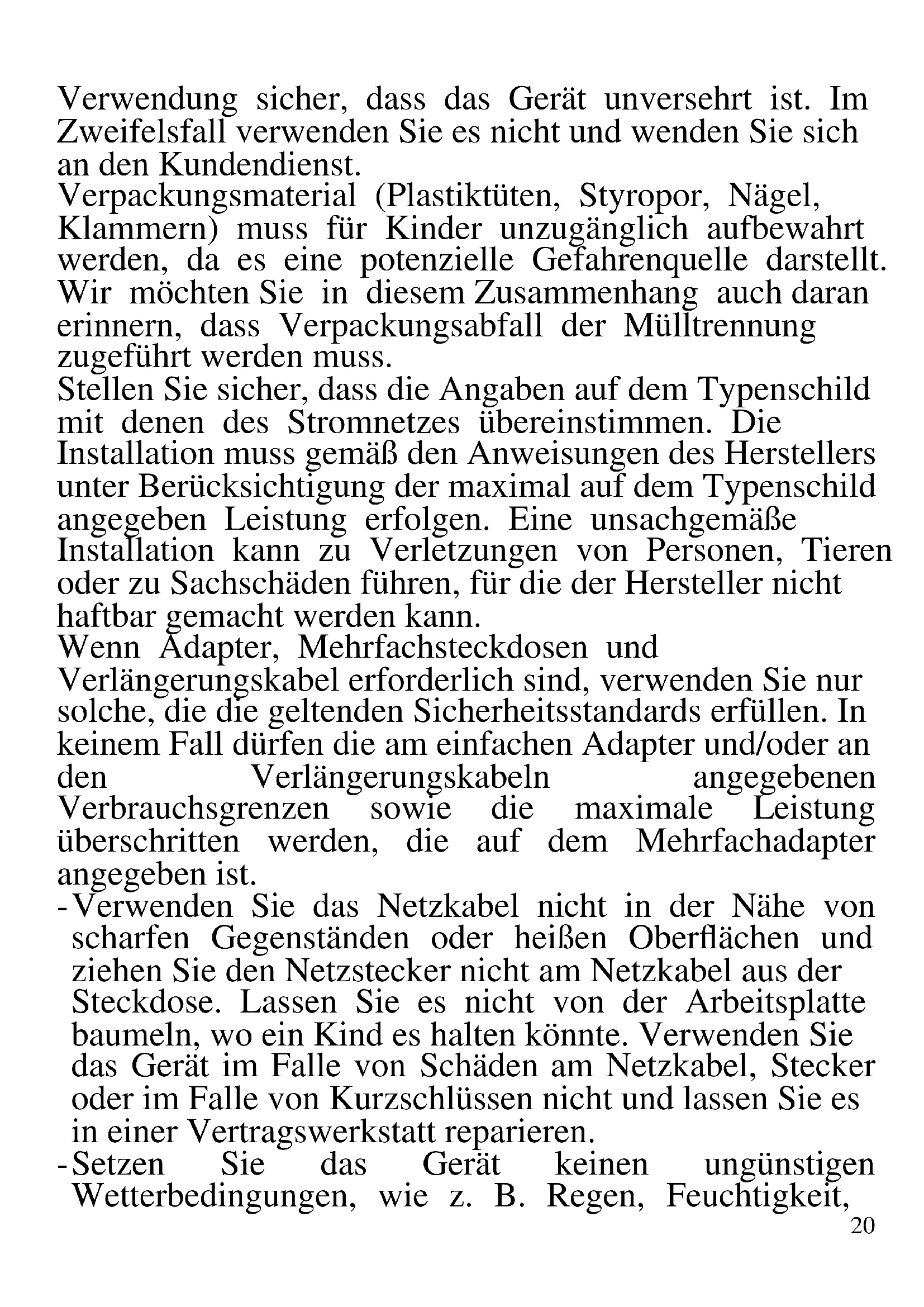 DEUTSCH: HINWEISE: Verwenden Sie das Gerät nur nach den Anweisungen in dieser Bedienungsanleitung. Jede anderweitige Verwendung gilt als unsachgemäß und gefährlich, und der Hersteller kann für Schäden haftbar gemacht werden, die durch eine unsachgemäße, falsche oder unvernünftige Verwendung verursacht werden. Stellen Sie vor der20 Verwendung sicher, dass das Gerät unversehrt ist. Im Zweifelsfall verwenden Sie es nicht und wenden Sie sich an den Kundendienst. Verpackungsmaterial (Plastiktüten, Styropor, Nägel, Klammern) muss für Kinder unzugänglich aufbewahrt werden, da es eine potenzielle Gefahrenquelle darstellt. Wir möchten Sie in diesem Zusammenhang auch daran erinnern, dass Verpackungsabfall der Mülltrennung zugeführt werden muss. Stellen Sie sicher, dass die Angaben auf dem Typenschild mit denen des Stromnetzes übereinstimmen. Die Installation muss gemäß den Anweisungen des Herstellers unter Berücksichtigung der maximal auf dem Typenschild angegeben Leistung erfolgen. Eine unsachgemäße Installation kann zu Verletzungen von Personen, Tieren oder zu Sachschäden führen, für die der Hersteller nicht haftbar gemacht werden kann. Wenn Adapter, Mehrfachsteckdosen und Verlängerungskabel erforderlich sind, verwenden Sie nur solche, die die geltenden Sicherheitsstandards erfüllen. In keinem Fall dürfen die am einfachen Adapter und/oder an den Verlängerungskabeln angegebenen Verbrauchsgrenzen sowie die maximale Leistung überschritten werden, die auf dem Mehrfachadapter angegeben ist. - Verwenden Sie das Netzkabel nicht in der Nähe von scharfen Gegenständen oder heißen Oberflächen und ziehen Sie den Netzstecker nicht am Netzkabel aus der Steckdose. Lassen Sie es nicht von der Arbeitsplatte baumeln, wo ein Kind es halten könnte. Verwenden Sie das Gerät im Falle von Schäden am Netzkabel, Stecker oder im Falle von Kurzschlüssen nicht und lassen Sie es in einer Vertragswerkstatt reparieren. - Setzen Sie das Gerät keinen ungünstigen Wetterbedingungen, wie z. B. Regen, Feuchtigkeit,21 Frost, aus und bewahren Sie es an einem trockenen Ort auf. Fassen Sie das Gerät nicht mit nassen Händen an und verwenden Sie es nicht barfuß. - Dieses Gerät kann von Kindern ab 8 Jahren und von Personen mit eingeschränkten körperlichen, sensorischen oder geistigen Fähigkeiten oder mangelnder Erfahrung und Kenntnissen verwendet werden, wenn sie beaufsichtigt oder instruiert wurden, um das Gerät sicher zu verwenden und die damit verbundenen Gefahren zu verstehen. Kinder dürfen nicht mit dem Gerät spielen. Reinigung und Benutzerwartung dürfen nicht von Kindern ohne Aufsicht durchgeführt werden. - Kinder dürfen nicht mit dem Gerät spielen. - Bewahren Sie das Gerät und sein Netzanschluss außerhalb der Reichweite von Kinder unter 8 Jahren. Wenn das Netzkabel beschädigt ist oder wenn ein Fehler vorliegt, darf das Gerät nicht manipuliert werden. Jede Reparatur muss vom Hersteller oder seinem technischen Kundendienst oder in jedem Fall von einer Person mit ähnlicher Qualifikation durchgeführt werden, um jegliches Risiko zu vermeiden. Die Nichtbeachtung der vorstehenden Bestimmungen kann die Sicherheit des Geräts beeinträchtigen und die Garantiebedingungen ungültig machen. WARNUNG: Dieses Gerät enthält eine Heizfunktion. Oberflächen, außer die funktionellen Oberflächen können hohe Temperaturen entwickeln. Da die Temperaturen von verschiedene Personen unterschiedlich wahrgenommen werden, sollte dieses Gerät mit VORSICHT verwendet werden. Halten Sie das Gerät ausschließlich auf Griffflächen die abhalten und verwenden Sie solche Hitzeschutzmaßen. Dieses Gerät ist nur für den Hausgebrauch oder gleichwertiges bestimmt, in Situationen wie bspw.: Kantinen in kleinen Firmen oder ähnliche22 Arbeitsumgebungen, von Kunden in Hotels, Motels oder andere Art von touristische Unterkunft, wie ländlicher oder Wohn –Tourismus. Das Gerät darf nicht mit einer Zeitschaltuhr oder mit einem separaten Fernwirksystem betrieben werden Führen Sie vor jedem Gebrauch das Netzkabel aus. Setzen Sie das Produkt keinen Stößen aus, es könnte beschädigt werden. Verwenden Sie nur originale und kompatible Teile und Zubehör. Halten Sie das Gerät fern von brennbaren Materialien, Wärmequellen, Dampf-und kalte Zonen. GEBRAUCHSHINWEISE Vor dem ersten Gebrauch die Teile reinigen, die mit Nahrung in Kontakt kommen, d.h. die Innenseite des Wasserkochers. Das Gerät niemals während des Betriebs unbeaufsichtigt lassen. Den Wasserkocher einzig und allein zum Erwärmen oder Kochen von Wasser benutzen. Den Wasserkocher nur mit kaltem Wasser füllen, wobei darauf geachtet werden muss, dass der auf dem Gerät angegebene maximale Füllstand nicht überschritten wird (max. 1.7L, min. 0.5L). Immer zuerst das Wasser einfüllen, bevor der Wasserkocher eingeschaltet wird. Niemals Flüssigkeiten nach dem Einschalten einfüllen. Sollte der Wasserkocher ohne sich darin befindendes Wasser eingeschaltet werden, dann schaltet die eingebaute Sicherheitsvorrichtung das Gerät automatisch ab, um Schäden zu vermeiden. Es wird nicht möglich sein, Wasser zu erwärmen, bis das Heizelement abgekühlt ist. Nachdem das Wasser den Siedepunkt erreicht hat, den Netzstecker ziehen und das Gerät komplett entleeren, um Verkrustungen am Heizelement zu vermeiden. Nur für den häuslichen Gebrauch. Nach dem Gebrauch, den Netzstecker ziehen und warten, bis das Gerät23 komplett abgekühlt ist, bevor es weggestellt oder gereinigt wird. Das Gerät niemals in Wasser oder anderen Flüssigkeiten eintauchen. Unbedingt vermeiden, dass Wasserspritzer oder Spritzer von anderen Flüssigkeiten das Gerät erreichen. Den Wasserkocher auf stabilen und ebenen Oberflächen abstellen. G10131 1 Deckel 2 Bedienknopf 3 Griff 4 Basis 5 Wasserkocher 6 Durchsichtiges Fenster 7 Ausguss mit Filter 8 Deckelgriff 9 Anzeigen BETRIEB Beim ersten Gebrauch zwei- oder dreimal die Höchstmenge an Wasser (1.7 Liter) zum Kochen bringen, dabei jedes Mal d