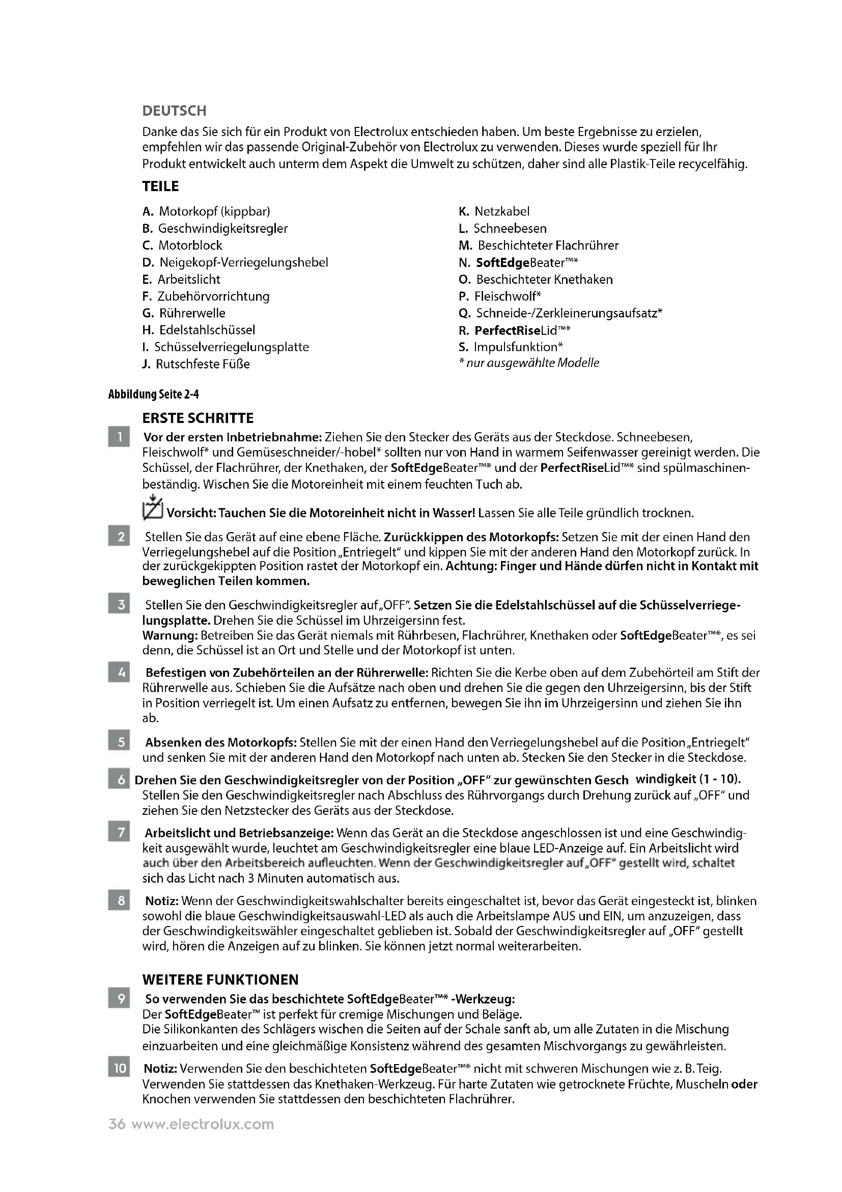 22 Trennen Sie das Gerät vom Stromnetz. Wir empfehlen, den Rührbesen, den Fleischwolf * und den Slicer / Shred- der * von Hand in warmem Seifenwasser zu waschen. . Die Schüssel, der Flachrührer, der Knethaken, der SoftEdgeBeater™* und der PerfectRiseLid™* sind spül- maschinenbeständig. Wischen Sie die Motoreinheit mit einem feuchten Tuch ab. Vorsicht: Tauchen Sie die Motoreinheit nicht in Wasser! Lassen Sie alle Teile gründlich trocknen. 23 Verwenden Sie zum Reinigen des Geräts keine Scheuermittel oder Metallschwämme. Viel Freude mit Ihrem neuen Produkt von Electrolux!38 www.electrolux.com SICHERHEITSHINWEISE Lesen Sie sich die folgenden Anweisungen sorgfältig durch, bevor Sie das Gerät zum ersten Mal verwenden.