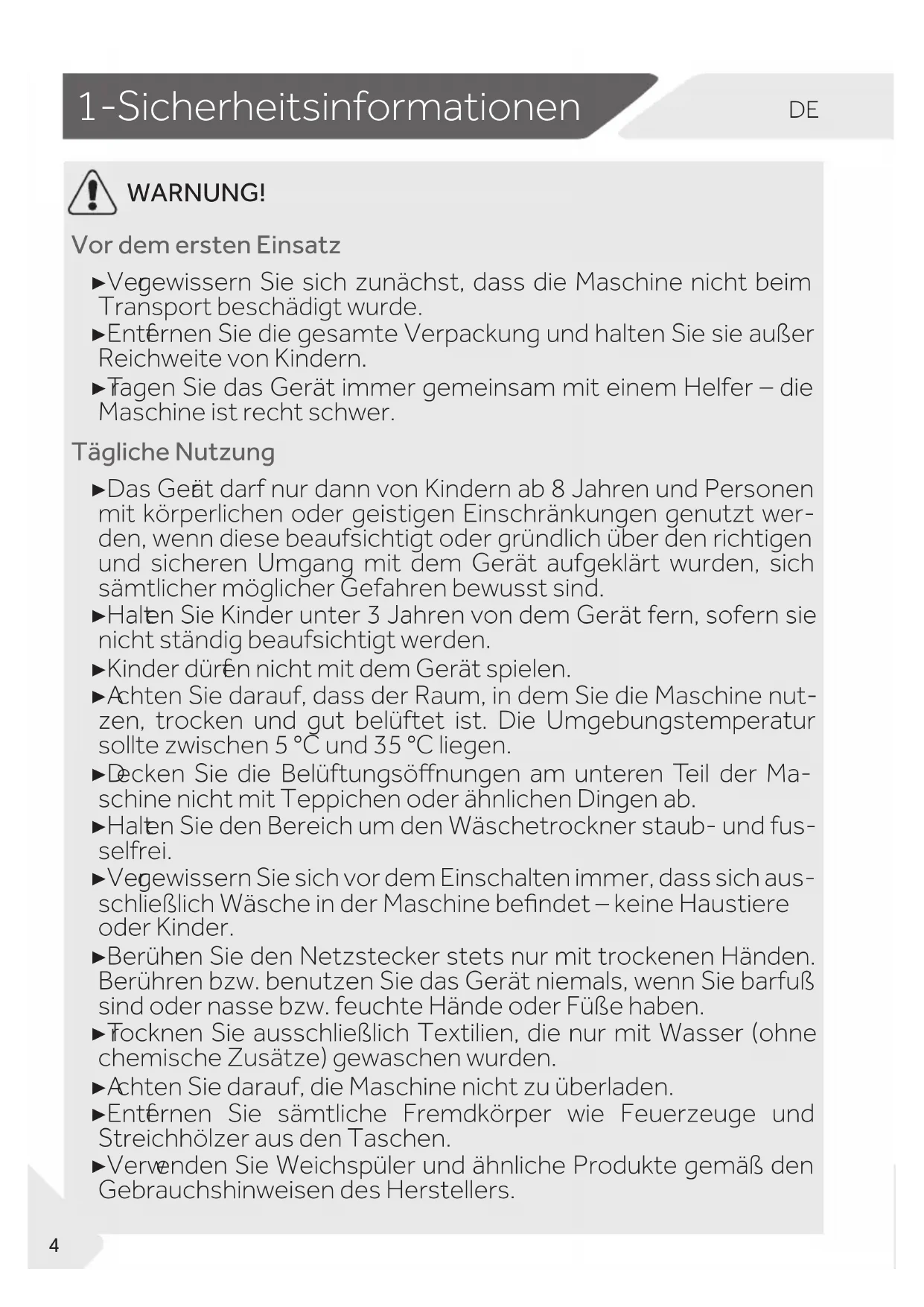 WARNUNG! Vor dem ersten Einsatz ▶ Ver gewissern Sie sich zunächst, dass die Maschine nicht beim Transport beschädigt wurde. ▶ Entf ernen Sie die gesamte Verpackung und halten Sie sie außer Reichweite von Kindern. ▶ T ragen Sie das Gerät immer gemeinsam mit einem Helfer – die Maschine ist recht schwer. Tägliche Nutzung ▶ Das Ger ät darf nur dann von Kindern ab 8 Jahren und Personen mit körperlichen oder geistigen Einschränkungen genutzt wer- den, wenn diese beaufsichtigt oder gründlich über den richtigen und sicheren Umgang mit dem Gerät aufgeklärt wurden, sich sämtlicher möglicher Gefahren bewusst sind. ▶ Halt en Sie Kinder unter 3 Jahren von dem Gerät fern, sofern sie nicht ständig beaufsichtigt werden. ▶ Kinder dürf en nicht mit dem Gerät spielen. ▶ A chten Sie darauf, dass der Raum, in dem Sie die Maschine nut- zen, trocken und gut belüftet ist. Die Umgebungstemperatur sollte zwischen 5 °C und 35 °C liegen. ▶ D ecken Sie die Belüftungsönungen am unteren Teil der Ma- schine nicht mit Teppichen oder ähnlichen Dingen ab. ▶ Halt en Sie den Bereich um den Wäschetrockner staub- und fus- selfrei. ▶ Ver gewissern Sie sich vor dem Einschalten immer, dass sich aus- schließlich Wäsche in der Maschine bendet – keine Haustiere oder Kinder. ▶ Berühr en Sie den Netzstecker stets nur mit trockenen Händen. Berühren bzw. benutzen Sie das Gerät niemals, wenn Sie barfuß sind oder nasse bzw. feuchte Hände oder Füße haben. ▶ T rocknen Sie ausschließlich Textilien, die nur mit Wasser (ohne chemische Zusätze) gewaschen wurden. ▶ A chten Sie darauf, die Maschine nicht zu überladen. ▶ Entf ernen Sie sämtliche Fremdkörper wie Feuerzeuge und Streichhölzer aus den Taschen. ▶ Verw enden Sie Weichspüler und ähnliche Produkte gemäß den Gebrauchshinweisen des Herstellers.DE
