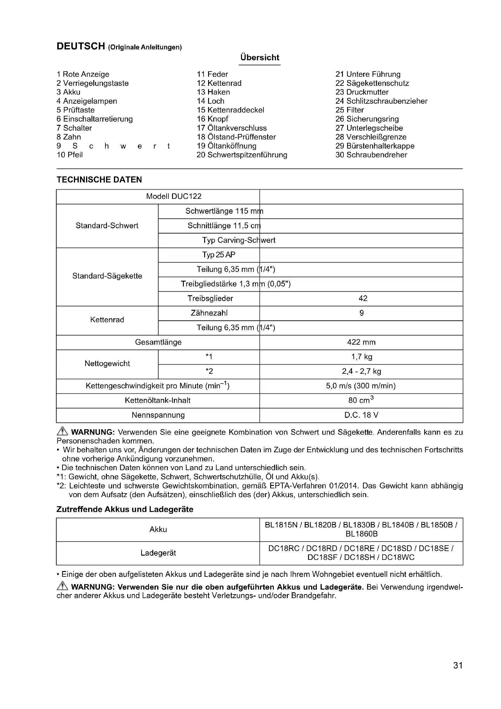 - Einige der oben aufgelisteten Akkus und Ladegeräte sind je nach Ihrem Wohngebiet eventuell nicht erhältlich. WARNUNG: Verwenden Sie nur die oben aufgeführten Akkus und Ladegeräte. Bei Verwendung irgendwel- cher anderer Akkus und Ladegeräte besteht Verletzungs- und/oder Brandgefahr. Modell DUC122 Standard-Schwert Schwertlänge 115 mm Schnittlänge 11,5 cm Typ Carving-Schwert Standard-Sägekette Typ 25 AP Teilung 6,35 mm (1/4") Treibgliedstärke 1,3 mm (0,05") Treibsglieder 42 Kettenrad Zähnezahl 9 Teilung 6,35 mm (1/4") Gesamtlänge 422 mm Nettogewicht *1 1,7 kg *2 2,4 - 2,7 kg Kettengeschwindigkeit pro Minute (min