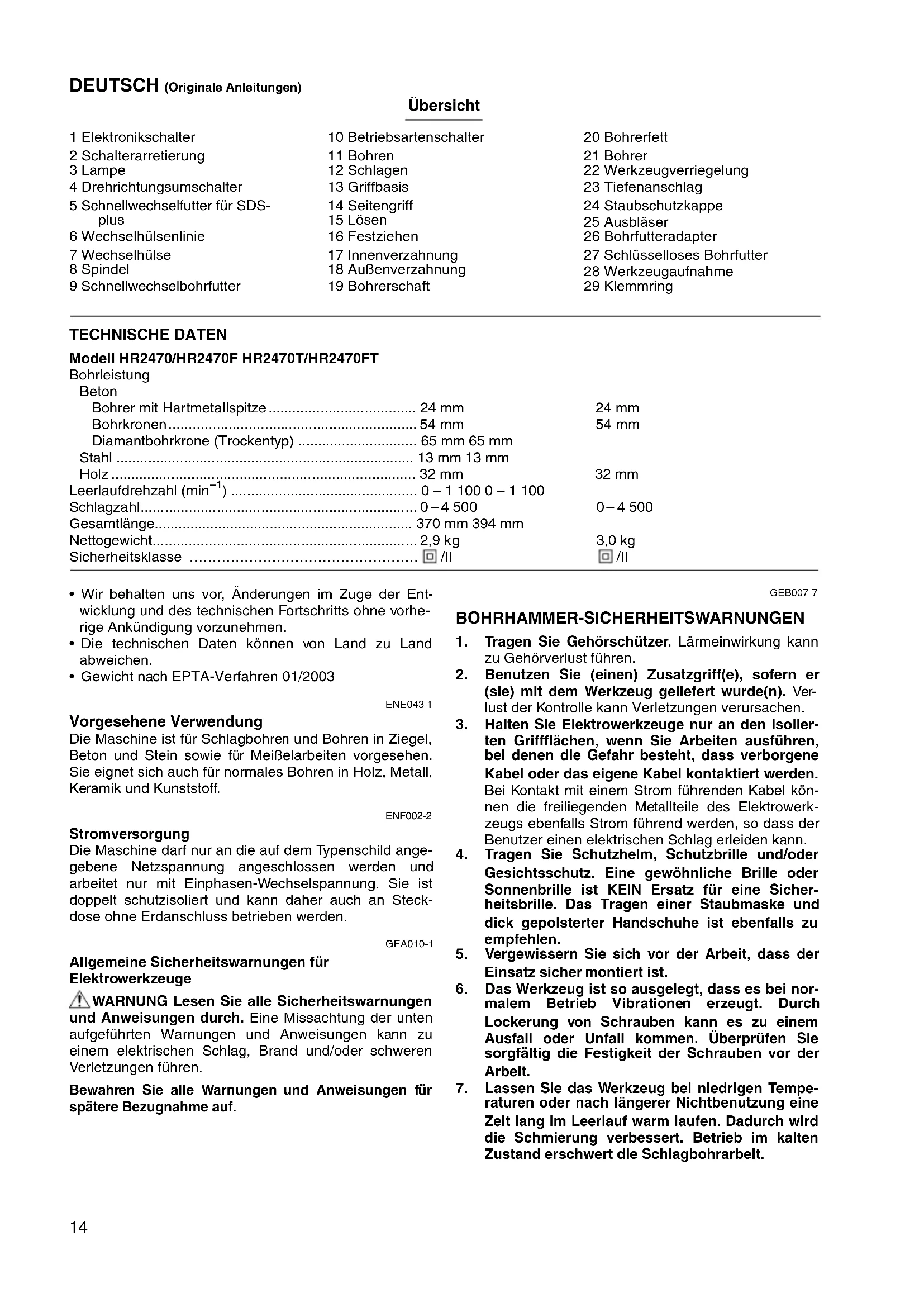 - Gewicht nach EPTA-Verfahren 01/2003 ENE043-1 Vorgesehene Verwendung Die Maschine ist für Schlagbohren und Bohren in Ziegel, Beton und Stein sowie für Meißelarbeiten vorgesehen. Sie eignet sich auch für normales Bohren in Holz, Metall, Keramik und Kunststoff. ENF002-2 Stromversorgung Die Maschine darf nur an die auf dem Typenschild ange- gebene Netzspannung angeschlossen werden und arbeitet nur mit Einphasen-Wechselspannung. Sie ist doppelt schutzisoliert und kann daher auch an Steck- dose ohne Erdanschluss betrieben werden. GEA010-1 Allgemeine Sicherheitswarnungen für Elektrowerkzeuge WARNUNG Lesen Sie alle Sicherheitswarnungen und Anweisungen durch. Eine Missachtung der unten aufgeführten Warnungen und Anweisungen kann zu einem elektrischen Schlag, Brand und/oder schweren Verletzungen führen. Bewahren Sie alle Warnungen und Anweisungen für spätere Bezugnahme auf. GEB007-7 BOHRHAMMER-SICHERHEITSWARNUNGEN