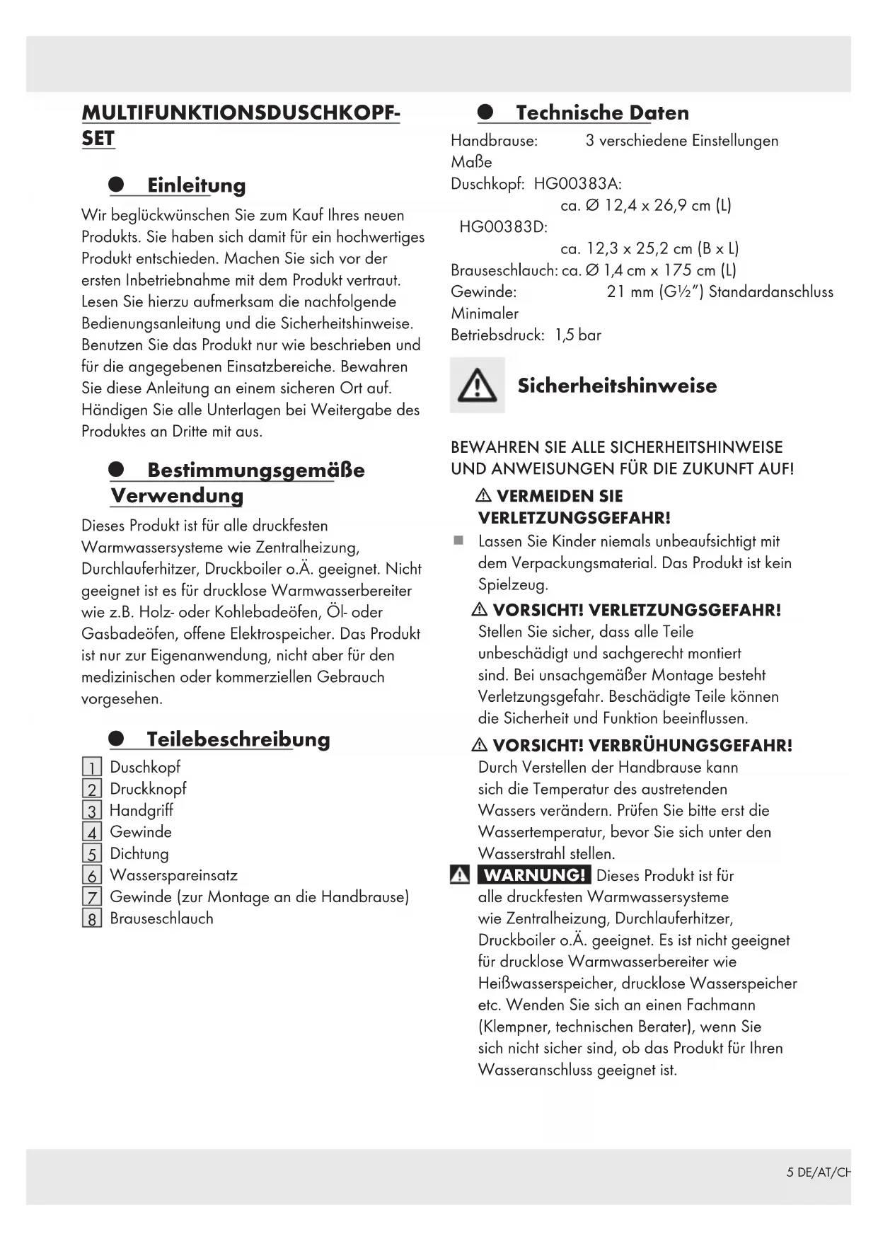 45 DE/AT/CH MULTIFUNKTIONSDUSCHKOPF- SET Einleitung Wir beglückwünschen Sie zum Kauf Ihres neuen Produkts. Sie haben sich damit für ein hochwertiges Produkt entschieden. Machen Sie sich vor der ersten Inbetriebnahme mit dem Produkt vertraut. Lesen Sie hierzu aufmerksam die nachfolgende Bedienungsanleitung und die Sicherheitshinweise. Benutzen Sie das Produkt nur wie beschrieben und für die angegebenen Einsatzbereiche. Bewahren Sie diese Anleitung an einem sicheren Ort auf. Händigen Sie alle Unterlagen bei Weitergabe des Produktes an Dritte mit aus. Bestimmungsgemäße Verwendung Dieses Produkt ist für alle druckfesten Warmwassersysteme wie Zentralheizung, Durchlauferhitzer, Druckboiler o.Ä. geeignet. Nicht geeignet ist es für drucklose Warmwasserbereiter wie z.B. Holz- oder Kohlebadeöfen, Öl- oder Gasbadeöfen, offene Elektrospeicher. Das Produkt ist nur zur Eigenanwendung, nicht aber für den medizinischen oder kommerziellen Gebrauch vorgesehen. Teilebeschreibung