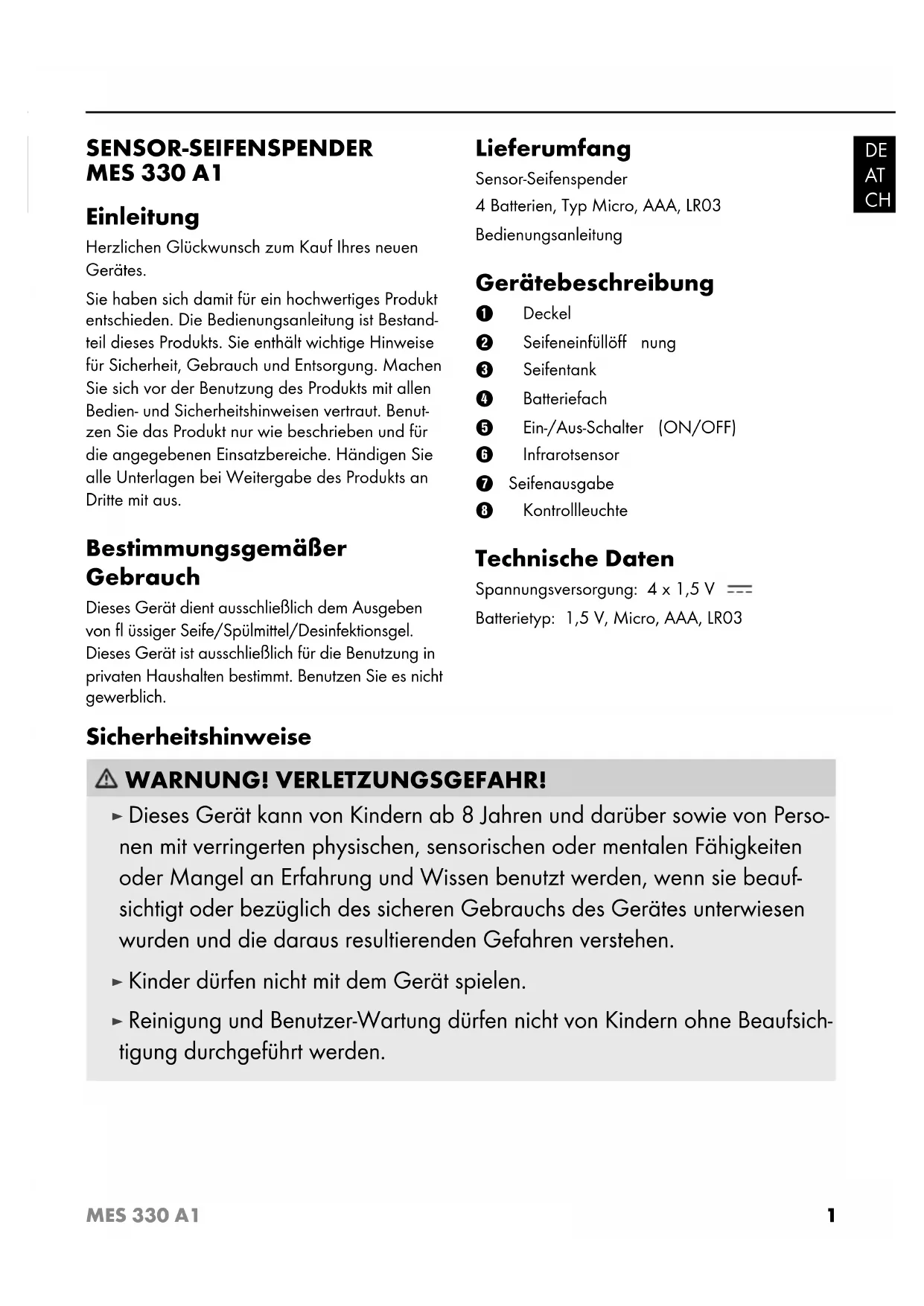 SENSOR-SEIFENSPENDER MES 330 A1 Einleitung Herzlichen Glückwunsch zum Kauf Ihres neuen Gerätes. Sie haben sich damit für ein hochwertiges Produkt entschieden. Die Bedienungsanleitung ist Bestand- teil dieses Produkts. Sie enthält wichtige Hinweise für Sicherheit, Gebrauch und Entsorgung. Machen Sie sich vor der Benutzung des Produkts mit allen Bedien- und Sicherheitshinweisen vertraut. Benut- zen Sie das Produkt nur wie beschrieben und für die angegebenen Einsatzbereiche. Händigen Sie alle Unterlagen bei Weitergabe des Produkts an Dritte mit aus. Bestimmungsgemäßer Gebrauch Dieses Gerät dient ausschließlich dem Ausgeben von fl üssiger Seife/Spülmittel/Desinfektionsgel. Dieses Gerät ist ausschließlich für die Benutzung in privaten Haushalten bestimmt. Benutzen Sie es nicht gewerblich. Lieferumfang Sensor-Seifenspender 4 Batterien, Typ Micro, AAA, LR03 Bedienungsanleitung Gerätebeschreibung 1 Deckel 2 Seifeneinfüllöff nung 3 Seifentank 4 Batteriefach 5 Ein-/Aus-Schalter (ON/OFF) 6 Infrarotsensor 7 Seifenausgabe 8 Kontrollleuchte Technische Daten Spannungsversorgung: 4 x 1,5 V Batterietyp: 1,5 V, Micro, AAA, LR03 Sicherheitshinweise WARNUNG! VERLETZUNGSGEFAHR! ► Dieses Gerät kann von Kindern ab 8 Jahren und darüber sowie von Perso- nen mit verringerten physischen, sensorischen oder mentalen Fähigkeiten oder Mangel an Erfahrung und Wissen benutzt werden, wenn sie beauf- sichtigt oder bezüglich des sicheren Gebrauchs des Gerätes unterwiesen wurden und die daraus resultierenden Gefahren verstehen. ► Kinder dürfen nicht mit dem Gerät spielen. ► Reinigung und Benutzer-Wartung dürfen nicht von Kindern ohne Beaufsich- tigung durchgeführt werden. IB_90846_MES330A1_LB1.indb 1IB_90846_MES330A1_LB1.indb 1 10.12.13 09:3010.12.13 09:30 148 mm x 200 mm2 MES 330 A1