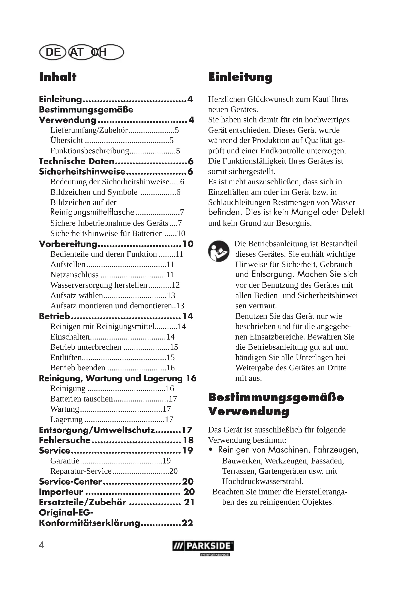 - Original-EG- Konformitätserklärung Einleitung Herzlichen Glückwunsch zum Kauf Ihres neuen Gerätes. Sie haben sich damit für ein hochwertiges Gerät entschieden. Dieses Gerät wurde während der Produktion auf Qualität ge- prüft und einer Endkontrolle unterzogen. Die Funktionsfähigkeit Ihres Gerätes ist somit sichergestellt. Es ist nicht auszuschließen, dass sich in Einzelfällen am oder im Gerät bzw. in Schlauchleitungen Restmengen von Wasser benden. Dies ist kein Mangel oder Defekt und kein Grund zur Besorgnis. Die Betriebsanleitung ist Bestandteil dieses Gerätes. Sie enthält wichtige Hinweise für Sicherheit, Gebrauch und Entsorgung. Machen Sie sich vor der Benutzung des Gerätes mit allen Bedien- und Sicherheitshinwei- sen vertraut. Benutzen Sie das Gerät nur wie beschrieben und für die angegebe- nen Einsatzbereiche. Bewahren Sie die Betriebsanleitung gut auf und händigen Sie alle Unterlagen bei Weitergabe des Gerätes an Dritte mit aus. Bestimmungsgemäße Verwendung Das Gerät ist ausschließlich für folgende Verwendung bestimmt: p. 22