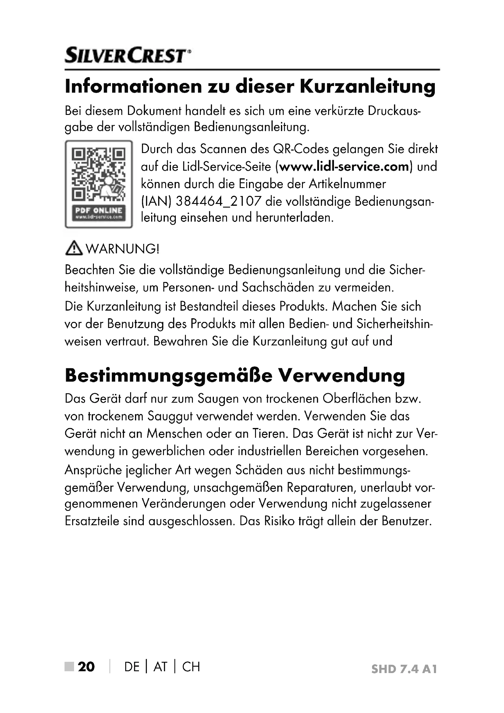 Informationen zu dieser Kurzanleitung Bei diesem Dokument handelt es sich um eine verkürzte Druckaus- gabe der vollständigen Bedienungsanleitung. Durch das Scannen des QR-Codes gelangen Sie direkt auf die Lidl-Service-Seite (www.lidl-service.com) und können durch die Eingabe der Artikelnummer (IAN) 384464_2107 die vollständige Bedienungsan- leitung einsehen und herunterladen. WARNUNG! Beachten Sie die vollständige Bedienungsanleitung und die Sicher- heitshinweise, um Personen- und Sachschäden zu vermeiden. Die Kurzanleitung ist Bestandteil dieses Produkts. Machen Sie sich vor der Benutzung des Produkts mit allen Bedien- und Sicherheitshin- weisen vertraut. Bewahren Sie die Kurzanleitung gut auf und Bestimmungsgemäße Verwendung Das Gerät darf nur zum Saugen von trockenen Oberflächen bzw. von trockenem Sauggut verwendet werden. Verwenden Sie das Gerät nicht an Menschen oder an Tieren. Das Gerät ist nicht zur Ver- wendung in gewerblichen oder industriellen Bereichen vorgesehen