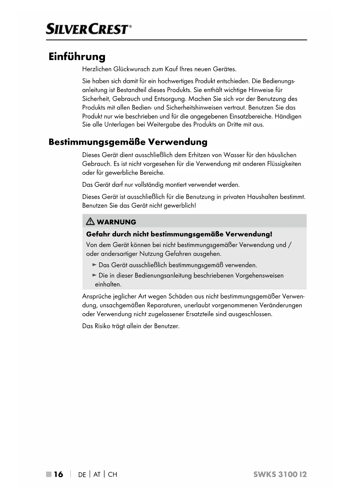 Einführung Herzlichen Glückwunsch zum Kauf Ihres neuen Gerätes. Sie haben sich damit für ein hochwertiges Produkt entschieden. Die Bedienungs- anleitung ist Bestandteil dieses Produkts. Sie enthält wichtige Hinweise für Sicherheit, Gebrauch und Entsorgung. Machen Sie sich vor der Benutzung des Produkts mit allen Bedien- und Sicherheitshinweisen vertraut. Benutzen Sie das Produkt nur wie beschrieben und für die angegebenen Einsatzbereiche. Händigen Sie alle Unterlagen bei Weitergabe des Produkts an Dritte mit aus. Bestimmungsgemäße Verwendung Dieses Gerät dient ausschließlich dem Erhitzen von Wasser für den häuslichen Gebrauch. Es ist nicht vorgesehen für die Verwendung mit anderen Flüssigkeiten oder für gewerbliche Bereiche. Das Gerät darf nur vollständig montiert verwendet werden. Dieses Gerät ist ausschließlich für die Benutzung in privaten Haushalten bestimmt. Benutzen Sie das Gerät nicht gewerblich! WARNUNG Gefahr durch nicht bestimmungsgemäße Verwendung! Von dem Gerät können bei nicht bestimmungsgemäßer Verwendung und / oder andersartiger Nutzung Gefahren ausgehen. ► Das Gerät ausschließlich bestimmungsgemäß verwenden. ► Die in dieser Bedienungsanleitung beschriebenen Vorgehensweisen einhalten. Ansprüche jeglicher Art wegen Schäden aus nicht bestimmungsgemäßer Verwen- dung, unsachgemäßen Reparaturen, unerlaubt vorgenommenen Veränderungen oder Verwendung nicht zugelassener Ersatzteile sind ausgeschlossen. Das Risiko trägt allein der Benutzer.SWKS 3100 I2