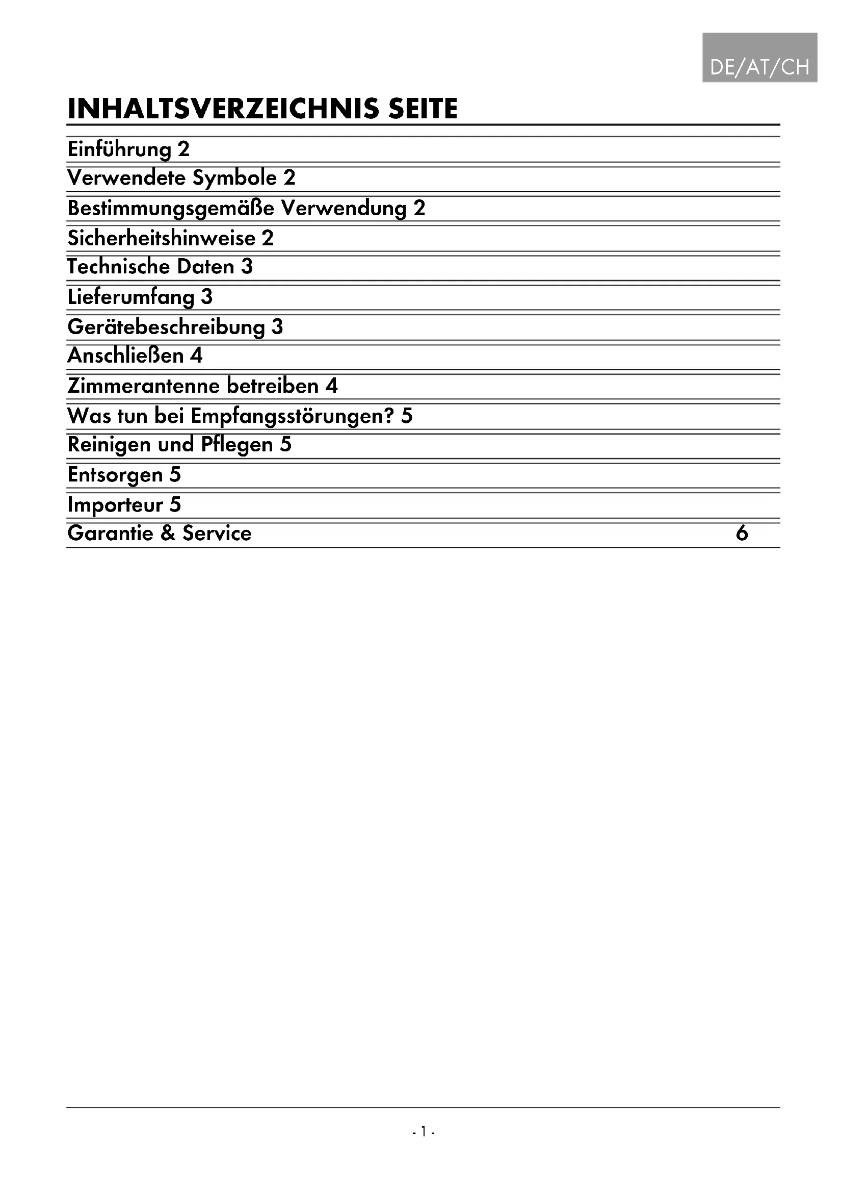 Operating instructionsDE / AT / CH Bedienungsanleitung Seite 1 FR / CH Mode d’emploi Page 7 IT / CH Istruzioni per l’uso Pagina 13 GB Operating instructions Page 19 Klappen Sie vor dem Lesen die Seite mit den Abbildungen aus und machen Sie sich anschließend mit allen Funktionen des Gerätes vertraut. Avant de lire le mode d‘emploi, ouvrez la page contenant les illustrations et familiarisez-vous ensuite avec toutes les fonctions de l‘appareil. Prima di leggere aprire la pagina con le immagini e prendere confi denza con le diverse funzioni dell’apparecchio. Before reading, unfold the page containing the illustrations and familiarise yourself with all functions of the device.- 1 - INHALTSVERZEICHNIS SEITE Einführung 2 Verwendete Symbole 2 Bestimmungsgemäße Verwendung 2 Sicherheitshinweise 2 Technische Daten 3 Lieferumfang 3 Gerätebeschreibung 3 Anschließen 4 Zimmerantenne betreiben 4 Was tun bei Empfangsstörungen? 5 Reinigen und Pflegen 5 Entsorgen 5 Importeur 5 Garantie & Service 6 DE/AT/CH IB_79829_SZA28A1_DE_LB1.qxd 06.12.2012 13:34 Uhr Seite 1- 2 - Einführung Herzlichen Glückwunsch zum Kauf Ihres neuen Gerätes. Sie haben sich damit für ein hochwertiges Produkt entschieden. Die Bedienungsanleitung ist Bestandteil dieses Produkts. Sie enthält wichtige Hin- weise für Sicherheit, Gebrauch und Entsorgung. Machen Sie sich vor der Benutzung des Produkts mit allen Bedien- und Sicherheitshinweisen vertraut. Benutzen Sie das Produkt nur wie beschrieben und für die angegebenen Einsatzbereiche. Bewahren Sie diese Anleitung gut auf. Händigen Sie alle Unterlagen bei Weitergabe des Produkts an Dritte mit aus. Verwendete Symbole Dieses Warnsymbol macht Sie darauf aufmerk- sam, dass hier ein Warnhinweis folgt, der vor folgenden Dingen warnt: - Verletzungsgefahr, - Gefahr durch elektrischen Schlag, - Brandgefahr, - Explosionsgefahr, - Geräteschäden, sowie auf wichtige Hinweise aufmerksam macht, wie: - Hinweise zur Netztrennung. Bei diesem Symbol werden Ihnen Tipps zum Umgang mit dem Gerät gegeben. Bestimmungsgemäße Verwendung Diese Zimmerantenne ist ausschließlich für den nicht gewerblichen Gebrauch zum Empfang von UHF/VHF und DVB-T TV Sendern sowie für den UKW Radioempfang in Innenräumen bestimmt. Eine andere Verwendung als hier beschrieben ist nicht zulässig und kann zu Beschädigungen und Verletzungen führen. Für Schäden, die von miss- bräuchlicher oder unsachgemäßer Behandlung, von Gewaltanwendung oder unautorisierter Modifi- kation herrühren, wird keine Haftung übernommen. DE/AT/CH Sicherheitshinweise Um Lebensgefahr durch elektrischen Schlag zu vermeiden: