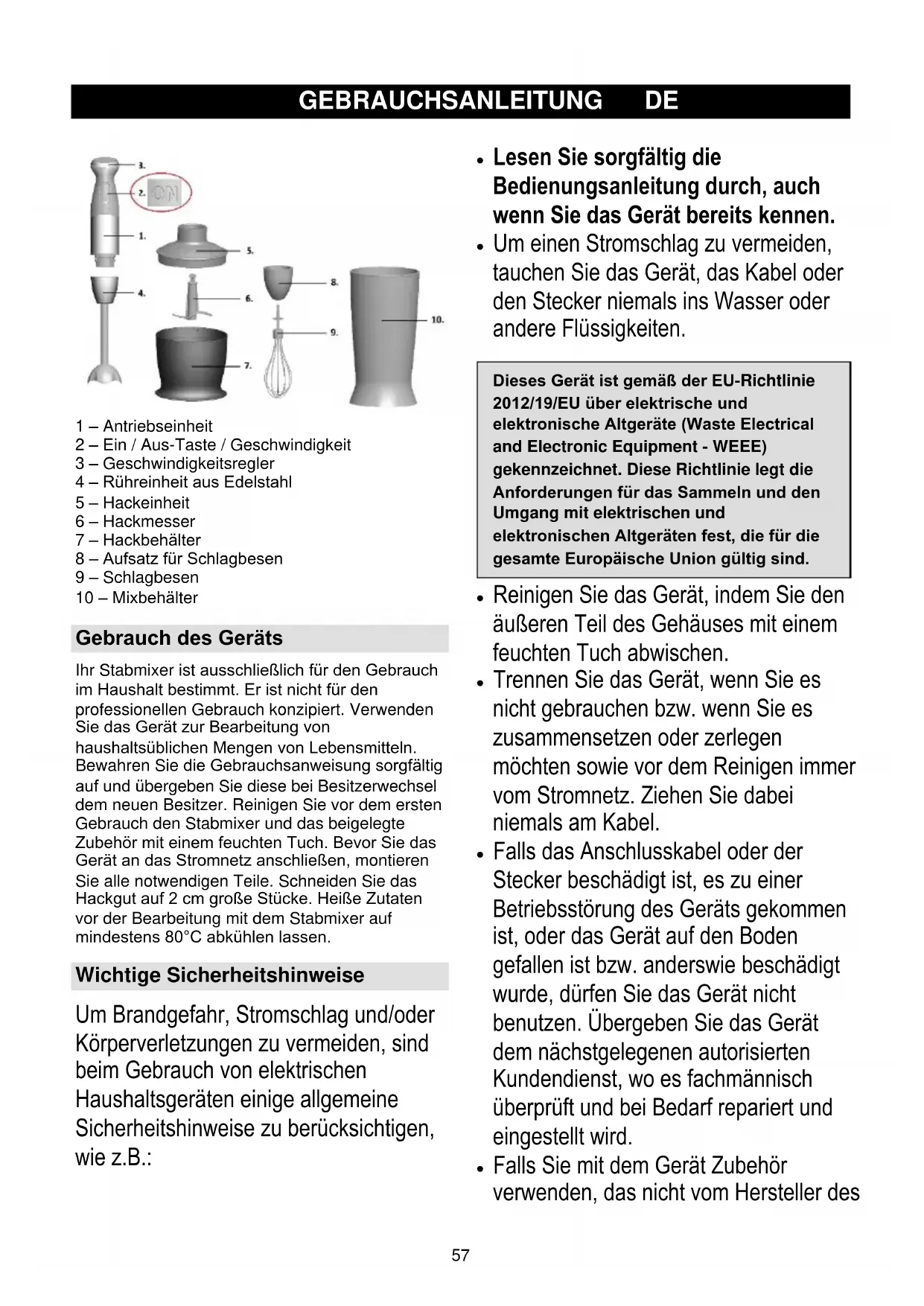 GORENJE ЖЕЛАЕТ, ЧТОБЫ ПОЛЬЗОВАНИЕ ПРИБОРОМ ДОСТАВИЛО ВАМ УДОВОЛЬСТВИЕ! Производитель оставляет за собой право на внесение изменений!57 GEBRAUCHSANLEITUNG DE 1 – Antriebseinheit 2 – Ein / Aus-Taste / Geschwindigkeit 3 – Geschwindigkeitsregler 4 – Rühreinheit aus Edelstahl 5 – Hackeinheit 6 – Hackmesser 7 – Hackbehälter 8 – Aufsatz für Schlagbesen 9 – Schlagbesen 10 – Mixbehälter Gebrauch des Geräts Ihr Stabmixer ist ausschließlich für den Gebrauch im Haushalt bestimmt. Er ist nicht für den professionellen Gebrauch konzipiert. Verwenden Sie das Gerät zur Bearbeitung von haushaltsüblichen Mengen von Lebensmitteln. Bewahren Sie die Gebrauchsanweisung sorgfältig auf und übergeben Sie diese bei Besitzerwechsel dem neuen Besitzer. Reinigen Sie vor dem ersten Gebrauch den Stabmixer und das beigelegte Zubehör mit einem feuchten Tuch. Bevor Sie das Gerät an das Stromnetz anschließen, montieren Sie alle notwendigen Teile. Schneiden Sie das Hackgut auf 2 cm große Stücke. Heiße Zutaten vor der Bearbeitung mit dem Stabmixer auf mindestens 80°C abkühlen lassen. Wichtige Sicherheitshinweise Um Brandgefahr, Stromschlag und/oder Körperverletzungen zu vermeiden, sind beim Gebrauch von elektrischen Haushaltsgeräten einige allgemeine Sicherheitshinweise zu berücksichtigen, wie z.B.: