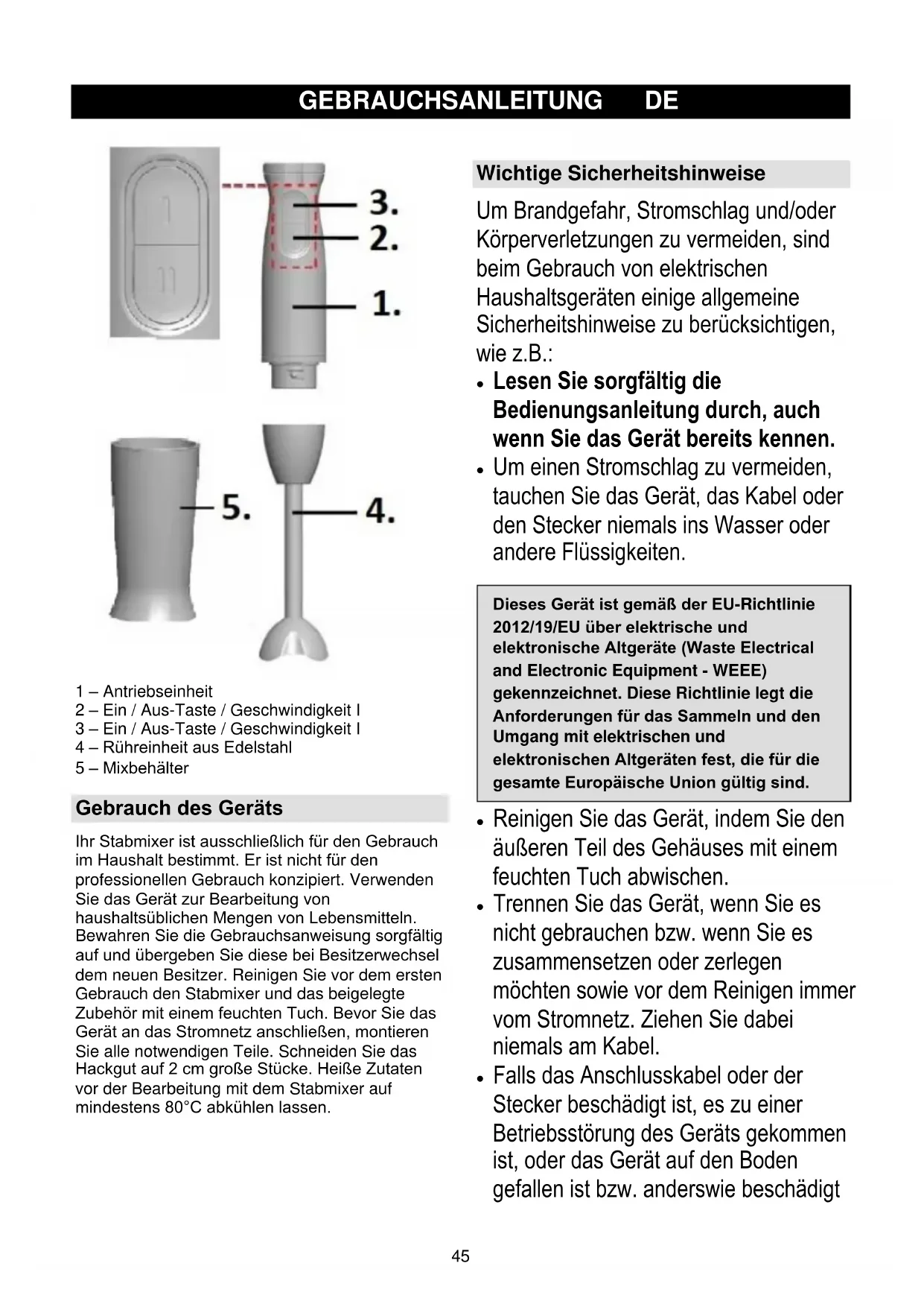 GORENJE ЖЕЛАЕТ, ЧТОБЫ ПОЛЬЗОВАНИЕ ПРИБОРОМ ДОСТАВИЛО ВАМ УДОВОЛЬСТВИЕ! Производитель оставляет за собой право на внесение изменений!45 GEBRAUCHSANLEITUNG DE 1 – Antriebseinheit 2 – Ein / Aus-Taste / Geschwindigkeit I 3 – Ein / Aus-Taste / Geschwindigkeit I 4 – Rühreinheit aus Edelstahl 5 – Mixbehälter Gebrauch des Geräts Ihr Stabmixer ist ausschließlich für den Gebrauch im Haushalt bestimmt. Er ist nicht für den professionellen Gebrauch konzipiert. Verwenden Sie das Gerät zur Bearbeitung von haushaltsüblichen Mengen von Lebensmitteln. Bewahren Sie die Gebrauchsanweisung sorgfältig auf und übergeben Sie diese bei Besitzerwechsel dem neuen Besitzer. Reinigen Sie vor dem ersten Gebrauch den Stabmixer und das beigelegte Zubehör mit einem feuchten Tuch. Bevor Sie das Gerät an das Stromnetz anschließen, montieren Sie alle notwendigen Teile. Schneiden Sie das Hackgut auf 2 cm große Stücke. Heiße Zutaten vor der Bearbeitung mit dem Stabmixer auf mindestens 80°C abkühlen lassen. Wichtige Sicherheitshinweise Um Brandgefahr, Stromschlag und/oder Körperverletzungen zu vermeiden, sind beim Gebrauch von elektrischen Haushaltsgeräten einige allgemeine Sicherheitshinweise zu berücksichtigen, wie z.B.: