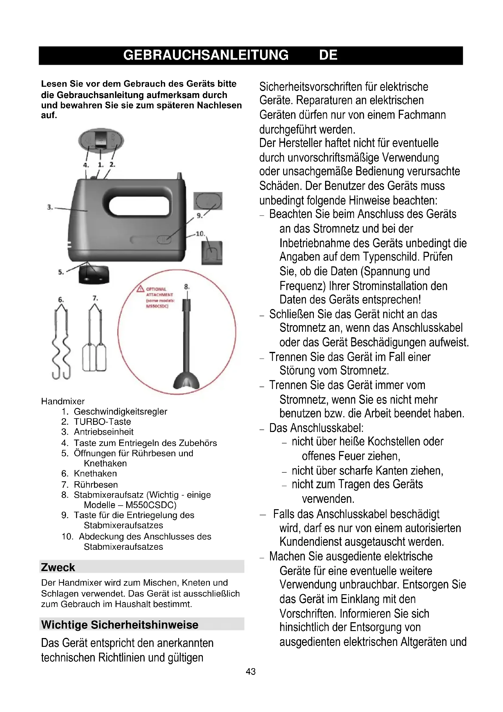 Stabmixeraufsatzes Zweck Der Handmixer wird zum Mischen, Kneten und Schlagen verwendet. Das Gerät ist ausschließlich zum Gebrauch im Haushalt bestimmt. Wichtige Sicherheitshinweise Das Gerät entspricht den anerkannten technischen Richtlinien und gültigen Sicherheitsvorschriften für elektrische Geräte. Reparaturen an elektrischen Geräten dürfen nur von einem Fachmann durchgeführt werden. Der Hersteller haftet nicht für eventuelle durch unvorschriftsmäßige Verwendung oder unsachgemäße Bedienung verursachte Schäden. Der Benutzer des Geräts muss unbedingt folgende Hinweise beachten: − Beachten Sie beim Anschluss des Geräts an das Stromnetz und bei der Inbetriebnahme des Geräts unbedingt die Angaben auf dem Typenschild. Prüfen Sie, ob die Daten (Spannung und Frequenz) Ihrer Strominstallation den Daten des Geräts entsprechen! − Schließen Sie das Gerät nicht an das Stromnetz an, wenn das Anschlusskabel oder das Gerät Beschädigungen aufweist. − Trennen Sie das Gerät im Fall einer Störung vom Stromnetz. − Trennen Sie das Gerät immer vom Stromnetz, wenn Sie es nicht mehr benutzen bzw. die Arbeit beendet haben. − Das Anschlusskabel: − nicht über heiße Kochstellen oder offenes Feuer ziehen, − nicht über scharfe Kanten ziehen, − nicht zum Tragen des Geräts verwenden. − Falls das Anschlusskabel beschädigt wird, darf es nur von einem autorisierten Kundendienst ausgetauscht werden. − Machen Sie ausgediente elektrische Geräte für eine eventuelle weitere Verwendung unbrauchbar. Entsorgen Sie das Gerät im Einklang mit den Vorschriften. Informieren Sie sich hinsichtlich der Entsorgung von ausgedienten elektrischen Altgeräten und44 Verpackungsmaterialien bei Ihrer Gemeinde- bzw. Ortsverwaltung. − Sobald das Gerät vollkommen zum Stillstand gekommen ist, den Stecker des Anschlusskabels aus der Steckdose ziehen und erst danach die Zubehörteile austauschen. Während des Betriebs des Geräts nicht in die Rührstäbe greifen und diese auch nicht mit Gegenständen berühren. − Die Rührbesen laufen ein paar Sekunden nach dem Abschalten des Geräts nach. Die Rührstäbe nicht berühren, damit Sie sich nicht verletzen. − Trennen Sie das Gerät vor dem Reinigen unbedingt vom Stromnetz. − Gebrauchen Sie das Gerät nicht im Freien. − Sorgen Sie dafür, dass Sie beim Gebrauch des Geräts trockene Hände haben. − Während des Betriebs des Geräts sollten sich Personen oder Tiere von den drehenden Teilen oder Schneiden fernhalten, da diese Verletzungen verursachen können. − Dieses Gerät darf von Kindern ab acht Jahren, wie auch von Personen mit verminderten körperlichen, sensorischen und geistigen Fähigkeiten oder mangelhaften Erfahrungen und Wissen bedient werden, jedoch nur, wenn sie das Gerät unter entsprechender Aufsicht bedienen oder entsprechende Anweisungen über den sicheren Gebrauch des Geräts erhalten haben und die mit dem Gebrauch des Geräts verbundenen Gefahren verstanden haben. − Beaufsichtigen Sie Kinder, wenn diese das Gerät gebrauchen und achten Sie darauf, dass sie nicht mit dem Gerät spielen. − Reinigung oder Benutzerwartung darf von Kindern nicht durchgeführt werden, es sei denn sie sind älter als 8 Jahre und werden dabei von einem Erwachsenen beaufsichtigt. − Schallpegel: Lc = 72 dB (A) Dieses Gerät wurde gemäß der EU- Richtlinie 2012/19/EU über elektrische und elektronische Altgeräte (Waste Electrical and Electronic Equipment - WEEE) gekennzeichnet. Diese Richtlinie legt die Anforderungen für das Sammeln und den Umgang mit ausgedienten Elektro- und Elektronikaltgeräten fest, die für die gesamte Europäische Union gültig sind. Vor dem Gebrauch Stellen Sie sicher, dass sich das Gerät in einem einwandfreien Zustand befindet, dass es nicht beschädigt oder durch Alter und übermäßigen Einsatz abgenutzt ist. Prüfen Sie, ob das Anschlusskabel beschädigt ist. Prüfen Sie den Ein-/Aus-Schalter. Prüfen Sie, ob alle Komponenten, die Sie an das Gerät anschließen möchten, Originalteile sind, die vom Hersteller empfohlen werden. Verwenden Sie mit diesem Gerät kein Zubehör von Drittherstellern! Nach dem Gebrauch Trennen Sie das Gerät immer vom Stromnetz, wenn Sie den Vorgang beendet haben und bevor Sie es ablegen. Bewahren Sie das Gerät an einem sicheren Platz auf, außerhalb der Reichweite von Kindern. Verwendung von Zubehör