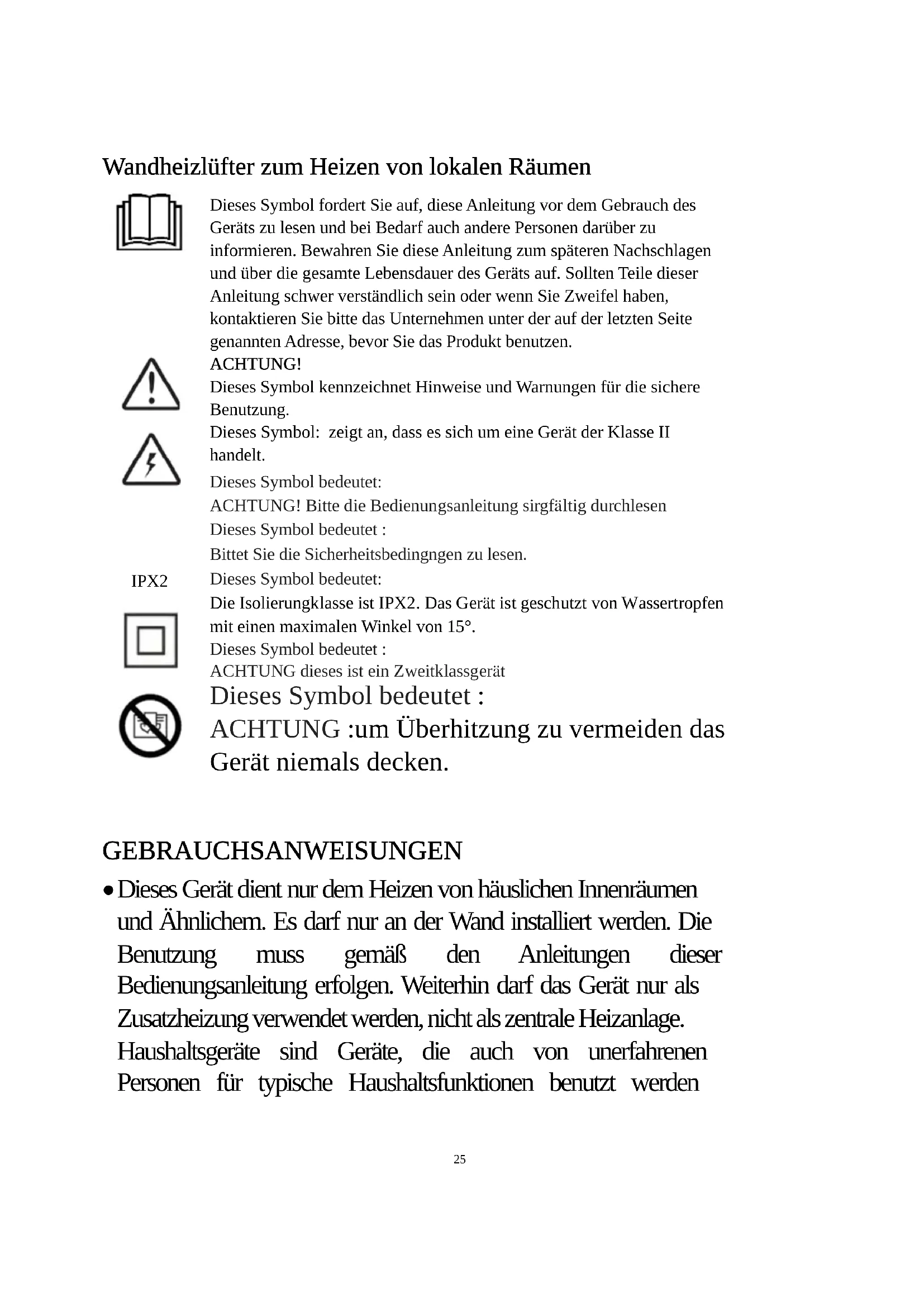 Dieses Symbol fordert Sie auf, diese Anleitung vor dem Gebrauch des Geräts zu lesen und bei Bedarf auch andere Personen darüber zu informieren. Bewahren Sie diese Anleitung zum späteren Nachschlagen und über die gesamte Lebensdauer des Geräts auf. Sollten Teile dieser Anleitung schwer verständlich sein oder wenn Sie Zweifel haben, kontaktieren Sie bitte das Unternehmen unter der auf der letzten Seite genannten Adresse, bevor Sie das Produkt benutzen. ACHTUNG! Dieses Symbol kennzeichnet Hinweise und Warnungen für die sichere Benutzung. Dieses Symbol: zeigt an, dass es sich um eine Gerät der Klasse II handelt. Dieses Symbol bedeutet: ACHTUNG! Bitte die Bedienungsanleitung sirgfältig durchlesen Dieses Symbol bedeutet : Bittet Sie die Sicherheitsbedingngen zu lesen. Dieses Symbol bedeutet: Die Isolierungklasse ist IPX2. Das Gerät ist geschutzt von Wassertropfen mit einen maximalen Winkel von 15°. Dieses Symbol bedeutet : ACHTUNG dieses ist ein Zweitklassgerät Dieses Symbol bedeutet : ACHTUNG :um Überhitzung zu vermeiden das Gerät niemals decken.26 dürfen und die auch an folgenden Orten eingesetzt werden können: - in Geschäften, Büros und anderen Arbeitsumgebungen; - in landwirtschaftlichen oder ähnlichen Unternehmen; - von Gästen in Hotels, Motels und anderen Wohnumgebungen; - in Frühstückspensionen.