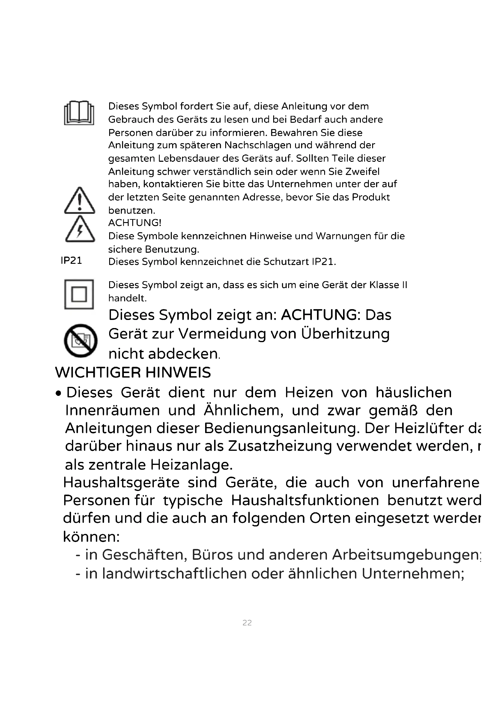 Dieses Symbol fordert Sie auf, diese Anleitung vor dem Gebrauch des Geräts zu lesen und bei Bedarf auch andere Personen darüber zu informieren. Bewahren Sie diese Anleitung zum späteren Nachschlagen und während der gesamten Lebensdauer des Geräts auf. Sollten Teile dieser Anleitung schwer verständlich sein oder wenn Sie Zweifel haben, kontaktieren Sie bitte das Unternehmen unter der auf der letzten Seite genannten Adresse, bevor Sie das Produkt benutzen. ACHTUNG! Diese Symbole kennzeichnen Hinweise und Warnungen für die sichere Benutzung. Dieses Symbol kennzeichnet die Schutzart IP21. Dieses Symbol zeigt an, dass es sich um eine Gerät der Klasse II handelt. Dieses Symbol zeigt an: ACHTUNG: Das Gerät zur Vermeidung von Überhitzung nicht abdecken.23 - von Gästen in Hotels, Motels und anderen Wohnumgebungen; - in Frühstückspensionen. Das Gerät darf NICHT bei Vorhandensein von Staub, übermäßig viel flüchtigem Material (die Gitter können sich verstopfen), erhöhter Luftfeuchtigkeit oder entzündbaren Produkten verwendet werden. Eine Benutzung im Außenbereich (im Freien) ist ebenfalls nicht gestattet. Jede davon abweichende Verwendung wird als unsachgemäß und gefährlich angesehen. Der Hersteller haftet nicht für Schäden, die durch unsachgemäßen, fehlerhaften oder unverantwortlichen Gebrauch und/oder durch Reparaturen entstehen, die von nicht qualifizierten Personen durchgeführt werden. Wenn der Heizlüfter in Betrieb steht, wird er heiß; daher dürfen nur der Kunststoffgriff und die Kunststoffschalter berührt werden. Nicht das Frontgitter berühren, dieses ist sehr heiß! Weder die Finger noch Gegenstände in das Frontgitter einführen, dies könnte zu Abschürfungen, Stromschlägen oder Geräteschäden führen. Das Schutzgitter gewährleistet keinen vollständigen Schutz für Kinder oder Personen mit eingeschränkten körperlichen, sensorischen oder geistigen Fähigkeiten. ACHTUNG: - Einige Teile dieses Produktes können sehr heiß werden und Verbrennungen verursachen. Bei Anwesenheit von Kindern oder verletzbaren Personen sollte besonders aufgepasst werden.24 - Bei Benutzung von Elektrogeräten sind immer die grundlegenden Sicherheitsvorschriften einzuhalten, um Gefahren durch Feuer, Stromschläge und Verletzungen zu vermeiden. - Dieses Gerät nicht in Räumlichkeiten benutzen, deren Grundfläche kleiner als 4 m² ist. Das Gerät kann von Kindern ab 8 Jahren und Personen mit eingeschränkten körperlichen, sensorischen oder geistigen Fähigkeiten oder mangelnder Erfahrung und Wissen benutzt werden, sofern sie die notwendige Aufsicht oder Anweisungen im Hinblick auf den sicheren Umgang mit dem Gerät erhalten, und wenn sie sich der möglichen Gefahren bewusst sind. Kinder sollten nicht unbeaufsichtigt mit dem Gerät spielen. Die vom Benutzer durchzuführende Reinigung und Wartung darf nicht von unbeaufsichtigten Kindern vorgenommen werden. Kinder unter 3 Jahre müssen auf Abstand gehalten oder fortlaufend beaufsichtigt werden. Kinder zwischen 3 und 8 Jahre dürfen das Gerät nur ein- bzw. ausschalten, wenn dieses in seiner normalen Betriebsposition positioniert bzw. installiert ist und die Kinder beaufsichtigt sind oder diese eine Einweisung über den sicheren Gebrauch des Geräts erhalten haben und die entsprechend auftretende Gefährdung verstehen. Kinder zwischen 3 und 8 Jahren dürfen weder den Netzstecker einstecken noch das Gerät einstellen oder reinigen oder die durch den Gerätebenutzer auszuführende Wartung ausführen. Es ist sicherzustellen, dass der Heizlüfter nicht mit Wasser oder anderen Flüssigkeiten in Kontakt kommt. Sollte er aus Versehen nass werden oder in eine Flüssigkeit fallen, muss als erstes die Steckdose durch Ausschalten des Schalters an der25 Schalttafel deaktiviert werden. Erst danach darf der Stecker aus der Steckdose gezogen werden. Den Stecker und die Steckdose sorgfältig abtrocknen und erst dann den Strom der Steckdose wieder einschalten. Den Stecker wieder in die Steckdose stecken und dann das Gerät wieder benutzen. Sich bei Zweifeln an einen Fachmann wenden. Gefahr: - Das Gerät darf nicht direkt unter einer Steckdose aufgestellt werden. - Die Steckdose muss leicht zugänglich sein, um den Netzstecker im Notfall einfach herausziehen zu können. - Dieses Gerät nicht in unmittelbarer Nähe einer Badewanne, Dusche, eines Schwimmbeckens, Spühltisches usw. benutzen. - Wenn das Stromkabel beschädigt ist, muss es vom Hersteller, einem technischen Kundendienst oder einer Person, die in ähnlicher Weise qualifiziert ist, ersetzt werden, um etwaige Gefahren zu vermeiden. - Zur Vermeidung jeglicher Brandgefahr im Fall, dass das Gerät abgedeckt oder nicht ordnungsgemäß aufgestellt ist, ist dieses Gerät nicht für den Gebrauch mit einer externen Zeitschaltuhr oder gesonderten Fernbedienung ausgelegt. Dafür sorgen, dass an der Stromleitung keine anderen Geräte mit hoher Stromaufnahme angeschlossen sind, - Falls das Gerät in einem Badezimmer aufgestellt ist, muss es so positioniert werden, dass die Schalter und die anderen Bedienvorrichtungen nicht von Personen erreicht werden können, die sich in der Badewanne oder Dusche befinden.26 Zum Schutz vor Stromschlägen weder den Netzstecker, das Netzkabel noch das Gerät ins Wasser oder andere Flüssigkeiten eintauchen. Bei Nichtbenutzung des Geräts den Netzstecker aus der Steckdose ziehen. Das Gerät nicht mit nassen Händen oder Füßen berühren. Das Gerät nicht versetzen, wenn es sich in Betrieb befindet. Das Gerät keinen Witterungseinflüssen (Sonne, Regen usw.) aussetzen. Nach einem Herunterfallen oder bei schlechtem Betrieb des Geräts unverzüglich die Verbindung des Netzkabels unterbrechen. Prüfen, ob Teile des Geräts beschädigt sind und das Gerät erst nach dieser Prüfung einschalten. Wenden Sie sich im Zweifelsfall an einen qualifizierten Fachmann. Nicht am Netzkabel oder am Gerät ziehen, um den Netzstecker aus der Steckdose zu entfernen. Ziehen Sie nicht am Netzka