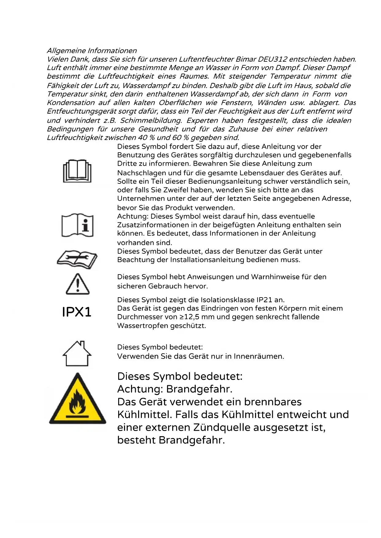 Dieses Symbol bedeutet: Achtung: Brandgefahr. Das Gerät verwendet ein brennbares Kühlmittel. Falls das Kühlmittel entweicht und einer externen Zündquelle ausgesetzt ist, besteht Brandgefahr.ALLGEMEINE WARNHINWEISE Dieses Gerät ist nur für den häuslichen (also nicht für den gewerblichen) Gebrauch bestimmt, und zwar zum Entfeuchten und Reduzieren des Prozentsatzes der relativen Luftfeuchtigkeit in Innenräumen gemäß den in dieser Anleitung beschriebenen Verfahren. Verwenden Sie das Gerät nicht in besonders staubiger Umgebung oder bei Vorhandensein von extrem flüchtigen Substanzen, die den Filter verstopfen oder den Motor beschädigen könnten, und auch nicht im Freien. Haushaltsgeräte sind beispielsweise Geräte für typisch häusliche Anwendungen, die im Haushalt zur Anwendung kommen, und die für typisch häusliche Anwendungen auch von nicht sachkundigen Personen verwendet werden können: - in Geschäften, Büros und anderen ähnlichen Arbeitsplätzen; - in landwirtschaftlichen oder ähnlichen Betrieben; - von Kunden in Hotels, Motels und anderen Wohnunterkünften; - in Pensionen, B&B, etc. Das Gerät ist für den Betrieb bei einer Temperatur zwischen 5 °C und 32 °C ausgelegt. Verwenden Sie den Luftentfeuchter nur, wenn alle seine Bestandteile korrekt montiert sind. Verwenden Sie den Luftentfeuchter immer nur in aufrechter Position; setzen Sie sich oder steigen Sie nicht auf das Gerät. Achtung: Beachten Sie beim Umgang mit Elektrogeräten immer die grundlegenden Sicherheitsvorkehrungen, um die Gefahr von Feuer, Stromschlägen und Körperverletzungen zu vermeiden. Noch mehr Sorgfalt und Vorsicht ist bei der Verwendung von Elektrogeräten mit Wasserbehälter geboten: Bei überlaufendem Wasser bzw. wenn das Kabel und der Stecker nass sein sollte, schalten Sie zuerst das Gerät unter Betätigung desentsprechenden Schalters aus; erst dann ziehen Sie den Stecker aus der Steckdose. Trocknen Sie sowohl den Stecker als auch das Netzkabel sorgfältig, und stecken Sie erst danach den Stecker wieder in die Steckdose. Wenden Sie sich im Zweifelsfall an qualifiziertes Personal. Das Gerät darf von Kindern ab einem Alter von 8 Jahren und von Personen mit eingeschränkten körperlichen, sensorischen oder geistigen Fähigkeiten oder ohne Erfahrung oder die notwendigen Kenntnisse benutzt werden, vorausgesetzt, sie werden beaufsichtigt oder sie haben Anweisungen für den sicheren Gebrauch des Geräts und verstehen die damit verbundenen Gefahren. Kinder dürfen nicht mit dem Gerät spielen. Die vom Benutzer durchzuführende Reinigung und Instandhaltung darf nicht von unbeaufsichtigten Kindern durchgeführt werden. Treffen Sie Vorsichtsmaßnahmen, um zu verhindern, dass Kinder mit dem Gerät spielen. Das Gerät mit all seinem Zubehör ist für Kinder unzugänglich aufzubewahren. Verstopfen Sie nicht das Luftansaug- und das Luftauslassgitter. Stecken Sie nicht ihre Finger oder irgendwelche Gegenstände in die Luftansaug- oder Luftauslassgitter. Berühren Sie das Gerät oder den Netzstecker nicht mit nassen Händen und nassen Füßen. Vermeiden Sie es, Teile Ihres Körpers der aus dem Gerät strömenden Luft über einen längeren Zeitraum auszusetzen, da dies Ihre Gesundheit beeinträchtigen könnte. Wenn das Gerät nicht in Betrieb ist, ziehen Sie den Stecker aus der Steckdose. Bewegen Sie das Gerät während des Betriebs nicht. Ziehen Sie nicht am Netzkabel oder am Gerät selbst, um den Stecker aus der Steckdose zu ziehen. Ziehen Sie nicht am Kabel, um das Gerät zu bewegen. Ziehen Sie immer den Netzstecker aus der Steckdose, bevor Sie den Wasserbehälter einfügen, herausnehmen, entleeren und bevor Sie den Filter bzw. das Gerät reinigen. Bei Beschädigung des Netzkabels muss dieses vom Hersteller, von dessen technischen Kundendienst oder auf jeden Fall von einem entsprechend qualifizierten Fachmann ersetzt werden, um jegliches Risiko zu vermeiden. Dieses Gerät darf nicht mit einer externen Zeitschaltuhr oder einem separaten Fernbedienungssystem betrieben werden, um Brandgefahren zu vermeiden, falls das Gerät abgedeckt oder nicht korrekt aufgestellt ist. Setzen Sie das Gerät nicht der Witterung (Sonne, Regen usw.) aus. Um sich vor Stromschlag zu schützen, tauchen Sie den Stecker, das Kabel oder das Gerät nicht in Wasser oder irgendeine andere Flüssigkeit. Trinken oder verwenden Sie nicht das im Behälter gesammelte Wasser. Jeder andere Gebrauch ist als unsachgemäß und gefährlich anzusehen. Der Hersteller kann nicht für Schäden haftbar gemacht werden, die durch unsachgemäßen, falschen bzw. unverantwortlichen Gebrauch und/oder Reparaturen durch unqualifiziertes Personal entstehen.Dieses Produkt enthält fluorierte Treibhausgase. Dieses Produkt ist hermetisch verschlossen. Kühlmittel R290 GWP: 3. Zusätzliche Informationen für Geräte mit Kühlmittelgas R290 (siehe Typenschild der verwendeten Gasart). Achtung: Brandgefahr. Lesen Sie diese Anleitung sorgfältig durch, bevor Sie das Gerät in Betrieb nehmen. R290 ist ein Kühlmittelgas, das den europäischen Umweltrichtlinien entspricht. Dieses Gerät enthält ca. 40 g Kühlmittelgas R290. Das Gerät muss in einem Raum mit einer Grundfläche von mehr als 2 m² aufgestellt, benutzt und aufbewahrt werden. Durchbohren Sie an keiner Stelle den Kühlmittelkreislauf.
