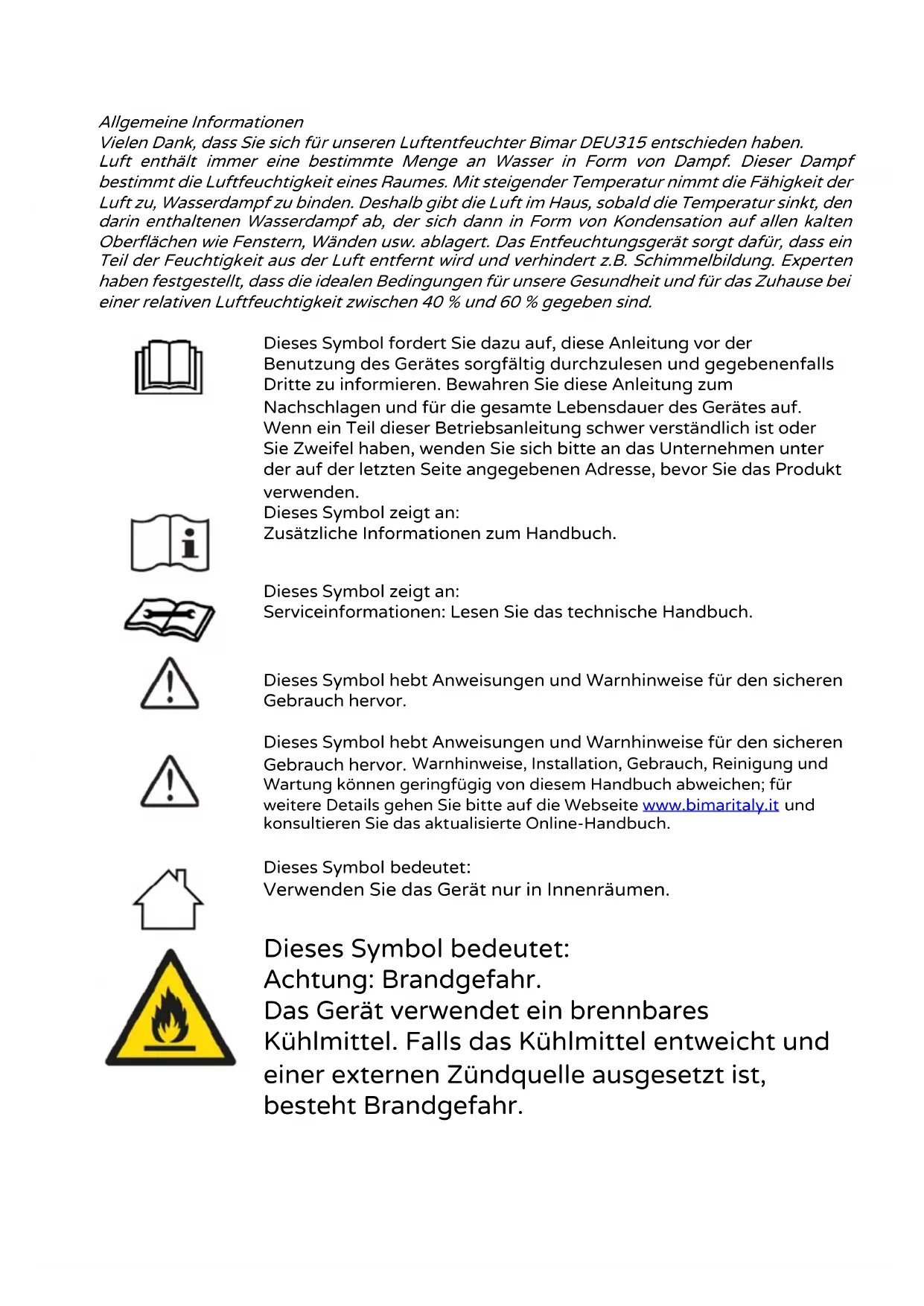 The air filter is clogged. Clean the filter as described in the section, “Cleaning and Maintenance”. The windows and doors of the room are open. Close the windows and doors of the room. The room temperature is too low. Automatic defrosting is in operation; the appliance will start dehumidifying again once it stops. The time is not long enough to extract the humidity. Increase the time. The air inlet or outlet grille is covered or blocked. Make sure that the grilles are free. The dehumidifier is excessively noisy. The dehumidifier is not correctly positioned or is not tilted and/or is unstable. Position the dehumidifier on a flat stable surface. The air filter is clogged or incorrectly inserted in its guides. Clean the filter as described in the section, “Cleaning and Maintenance”. Check that it is set in its guides correctly.Allgemeine Informationen Vielen Dank, dass Sie sich für unseren Luftentfeuchter Bimar DEU315 entschieden haben. Luft enthält immer eine bestimmte Menge an Wasser in Form von Dampf. Dieser Dampf bestimmt die Luftfeuchtigkeit eines Raumes. Mit steigender Temperatur nimmt die Fähigkeit der Luft zu, Wasserdampf zu binden. Deshalb gibt die Luft im Haus, sobald die Temperatur sinkt, den darin enthaltenen Wasserdampf ab, der sich dann in Form von Kondensation auf allen kalten Oberflächen wie Fenstern, Wänden usw. ablagert. Das Entfeuchtungsgerät sorgt dafür, dass ein Teil der Feuchtigkeit aus der Luft entfernt wird und verhindert z.B. Schimmelbildung. Experten haben festgestellt, dass die idealen Bedingungen für unsere Gesundheit und für das Zuhause bei einer relativen Luftfeuchtigkeit zwischen 40 % und 60 % gegeben sind.