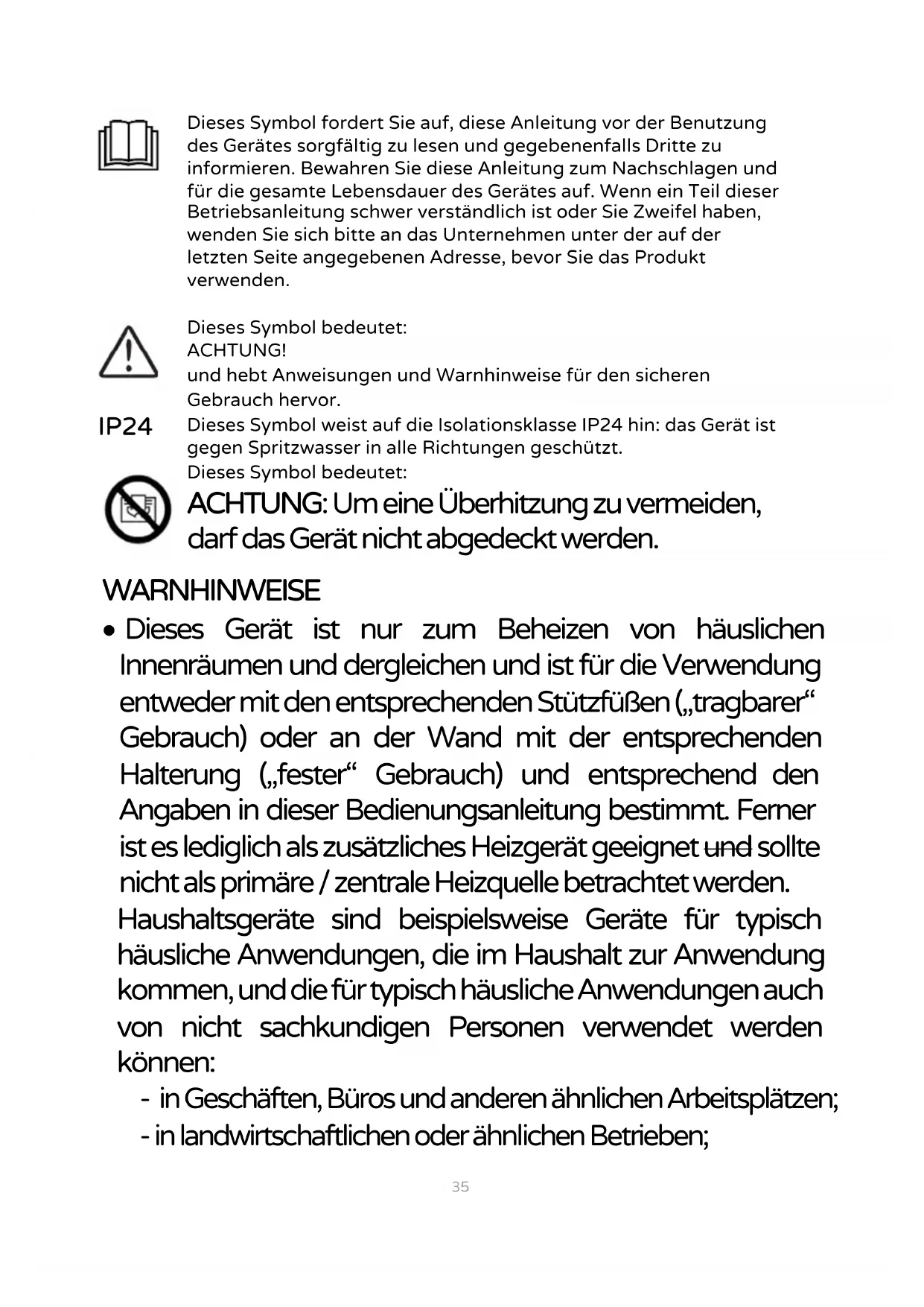 - Dieses Gerät ist nur zum Beheizen von häuslichen Innenräumen und dergleichen und ist für die Verwendung entweder mit den entsprechenden Stützfüßen („tragbarer“ Gebrauch) oder an der Wand mit der entsprechenden Halterung („fester“ Gebrauch) und entsprechend den Angaben in dieser Bedienungsanleitung bestimmt. Ferner ist es lediglich als zusätzliches Heizgerät geeignet und sollte nicht als primäre / zentrale Heizquelle betrachtet werden. Haushaltsgeräte sind beispielsweise Geräte für typisch häusliche Anwendungen, die im Haushalt zur Anwendung kommen, und die für typisch häusliche Anwendungen auch von nicht sachkundigen Personen verwendet werden können: - in Geschäften, Büros und anderen ähnlichen Arbeitsplätzen; - in landwirtschaftlichen oder ähnlichen Betrieben;36 - von Kunden in Hotels, Motels und anderen Wohnunterkünften; - in Pensionen, B&B etc.