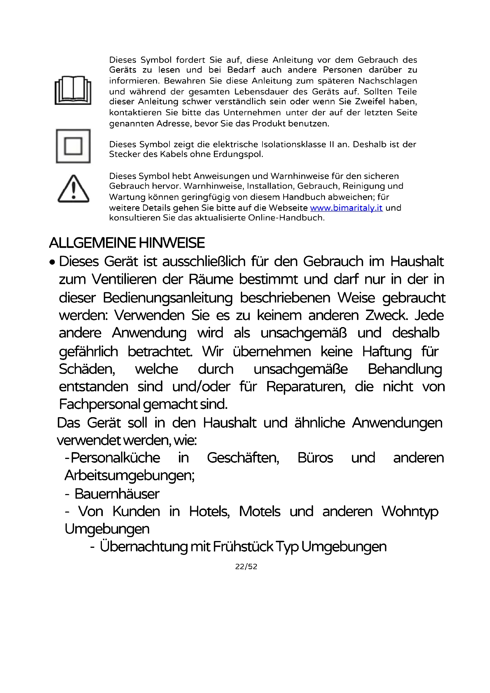 Dieses Symbol zeigt die elektrische Isolationsklasse II an. Deshalb ist der Stecker des Kabels ohne Erdungspol. Dieses Symbol hebt Anweisungen und Warnhinweise für den sicheren Gebrauch hervor. Warnhinweise, Installation, Gebrauch, Reinigung und Wartung können geringfügig von diesem Handbuch abweichen; für weitere Details gehen Sie bitte auf die Webseite www.bimaritaly.it und konsultieren Sie das aktualisierte Online-Handbuch.