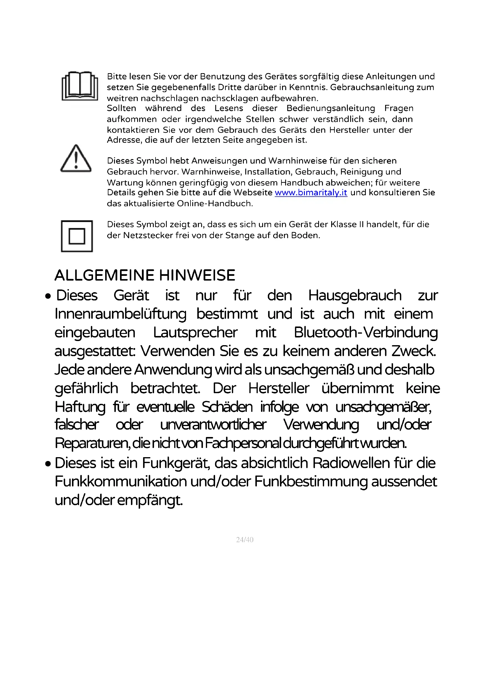 Sollten während des Lesens dieser Bedienungsanleitung Fragen aufkommen oder irgendwelche Stellen schwer verständlich sein, dann kontaktieren Sie vor dem Gebrauch des Geräts den Hersteller unter der Adresse, die auf der letzten Seite angegeben ist. Dieses Symbol hebt Anweisungen und Warnhinweise für den sicheren Gebrauch hervor. Warnhinweise, Installation, Gebrauch, Reinigung und Wartung können geringfügig von diesem Handbuch abweichen; für weitere Details gehen Sie bitte auf die Webseite www.bimaritaly.it und konsultieren Sie das aktualisierte Online-Handbuch.