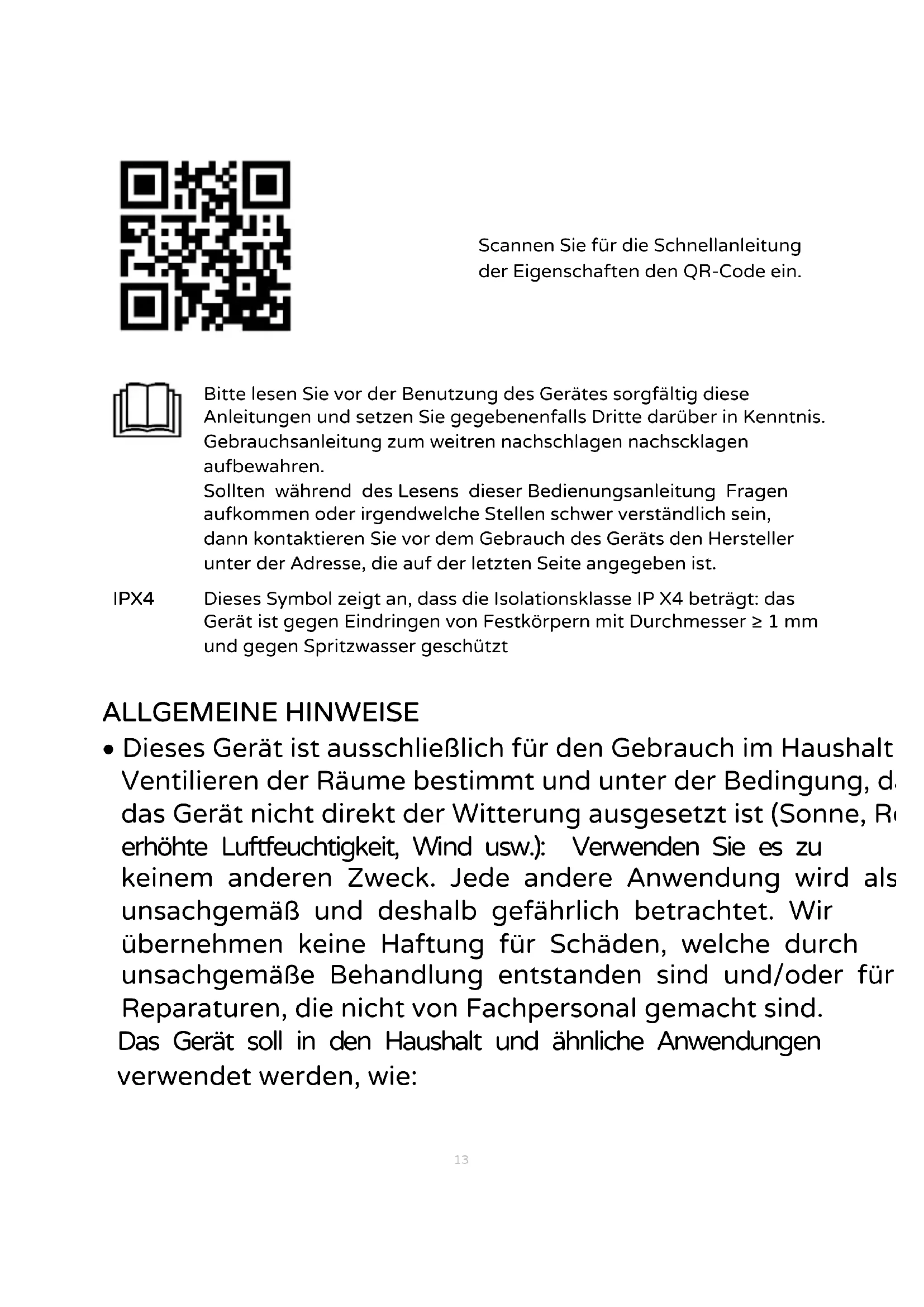 - Dieses Gerät ist ausschließlich für den Gebrauch im Haushalt Ventilieren der Räume bestimmt und unter der Bedingung, das Gerät nicht direkt der Witterung ausgesetzt ist (Sonne, Rehöhte Luftfeuchtigkeit, Wind usw.): Verwenden Sie es zu keinem anderen Zweck.Eine andere Anwendung wird als unsachgemäß und deshalb gefährlich betrachtet. Wir übernehmen keine Haftung für Schäden, welche durch unsachgemäß Behandlung entstanden sind und/oder für Reparaturen, die nicht von Fachpersonal gemacht sind. Das Gerät soll in den Haushalt und ähnliche Anwendungen verwendet werden, wie: