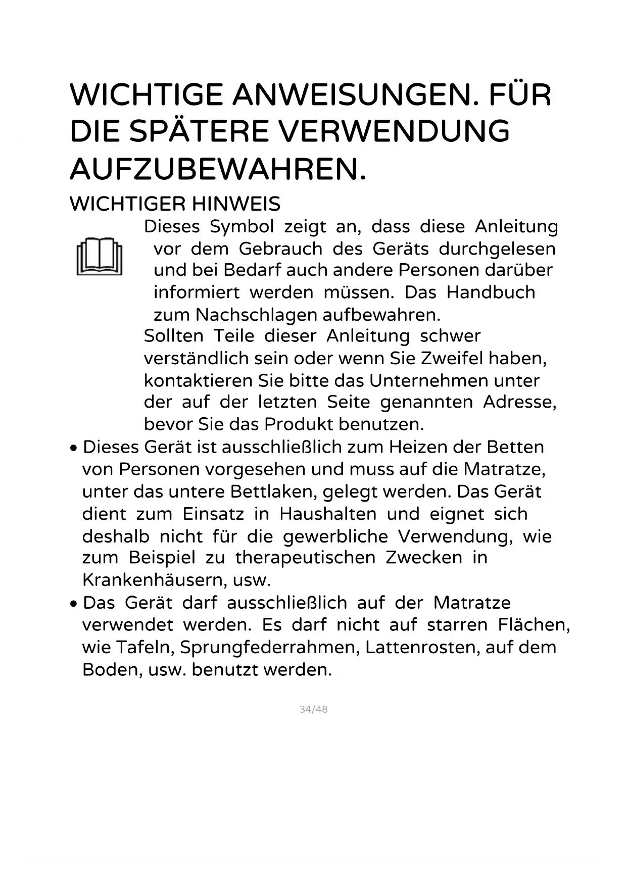 Dieses Symbol zeigt an, dass diese Anleitung vor dem Gebrauch des Geräts durchgelesen und bei Bedarf auch andere Personen darüber informiert werden müssen. Das Handbuch zum Nachschlagen aufbewahren. Sollten Teile dieser Anleitung schwer verständlich sein oder wenn Sie Zweifel haben, kontaktieren Sie bitte das Unternehmen unter der auf der letzten Seite genannten Adresse, bevor Sie das Produkt benutzen. Dieses Gerät ist ausschließlich zum Heizen der Betten von Personen vorgesehen und muss auf die Matratze, unter das untere Bettlaken, gelegt werden. Das Gerät dient zum Einsatz in Haushalten und eignet sich deshalb nicht für die gewerbliche Verwendung, wie zum Beispiel zu therapeutischen Zwecken in Krankenhäusern, usw. Das Gerät darf ausschließlich auf der Matratze verwendet werden. Es darf nicht auf starren Flächen, wie Tafeln, Sprungfederrahmen, Lattenrosten, auf dem Boden, usw. benutzt werden.35/48