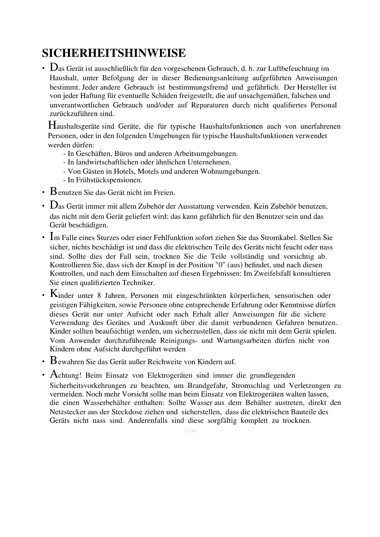 as Gerät ist ausschließlich für den vorgesehenen Gebrauch, d. h. zur Luftbefeuchtung im Haushalt, unter Befolgung der in dieser Bedienungsanleitung aufgeführten Anweisungen bestimmt. Jeder andere Gebrauch ist bestimmungsfremd und gefährlich. Der Hersteller ist von jeder Haftung für eventuelle Schäden freigestellt, die auf unsachgemäßen, falschen und unverantwortlichen Gebrauch und/oder auf Reparaturen durch nicht qualifiertes Personal zurückzuführen sind.