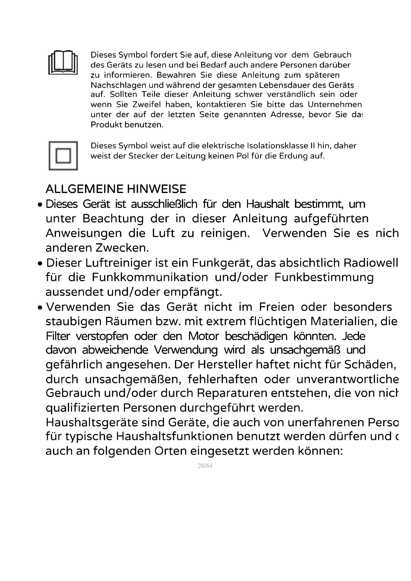 ALLGEMEINE HINWEISE Dieses Gerät ist ausschließlich für den Haushalt bestimmt, um unter Beachtung der in dieser Anleitung aufgeführten Anweisungen die Luft zu reinigen. Verwenden Sie es nicht zu anderen Zwecken. Dieser Luftreiniger ist ein Funkgerät, das absichtlich Radiowellen für die Funkkommunikation und/oder Funkbestimmung aussendet und/oder empfängt. Verwenden Sie das Gerät nicht im Freien oder besonders staubigen Räumen bzw. mit extrem flüchtigen Materialien, die die Filter verstopfen oder den Motor beschädigen könnten. Jede davon abweichende Verwendung wird als unsachgemäß und gefährlich angesehen. Der Hersteller haftet nicht für Schäden, die durch unsachgemäßen, fehlerhaften oder unverantwortlichen Gebrauch und/oder durch Reparaturen entstehen, die von nicht qualifizierten Personen durchgeführt werden. Haushaltsgeräte sind Geräte, die auch von unerfahrenen Personen für typische Haushaltsfunktionen benutzt werden dürfen und die auch an folgenden Orten eingesetzt werden können:29/64