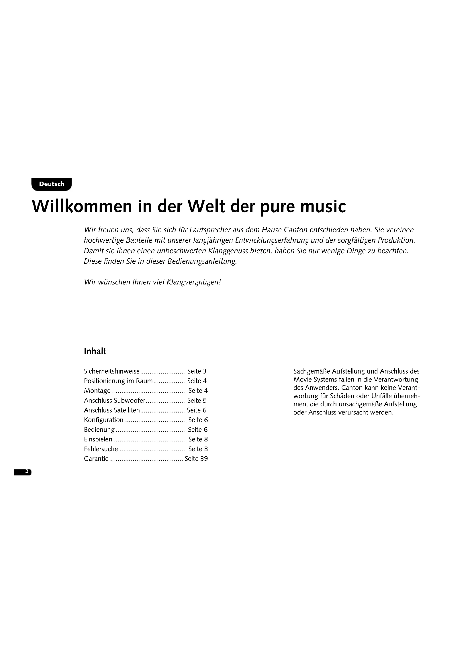 ENG DEU FRA ESP ITA RUS SWE NED POL Garantie-Urkunde Movie BeDieNuNgSANleiTuNg OPeRATiNg iNSTRuCTiONS NOTiCe D‘uTiliSATiON iNSTRuCCiONeS De uSO iSTRuziONi D’uSO РукОвОдСтвО пО экСплуатацИИ BRuKSANviSNiNg geBRuiKSAANWiJziNg iNSTRuKCJA OBSługi2 Inhalt Sicherheitshinweise ......................... Seite 3 Positionierung im Raum .................. Seite 4 Montage ........................................ Seite 4 Anschluss Subwoofer ...................... Seite 5 Anschluss Satelliten ......................... Seite 6 Konfiguration ................................. Seite 6 Bedienung ...................................... Seite 6 Einspielen ....................................... Seite 8 Fehlersuche .................................... Seite 8 Garantie ....................................... Seite 39 Deutsch Willkommen in der Welt der pure music Wir freuen uns, dass Sie sich für Lautsprecher aus dem Hause Canton entschieden haben. Sie vereinen hochwertige Bauteile mit unserer langjährigen Entwicklungserfahrung und der sorgfältigen Produktion. Damit sie Ihnen einen unbeschwerten Klanggenuss bieten, haben Sie nur wenige Dinge zu beachten. Diese finden Sie in dieser Bedienungsanleitung. Wir wünschen Ihnen viel Klangvergnügen! Sachgemäße Aufstellung und Anschluss des Movie Systems fallen in die Verantwortung des Anwenders. Canton kann keine Verant- wortung für Schäden oder Unfälle überneh- men, die durch unsachgemäße Aufstellung oder Anschluss verursacht werden.3 Deutsch Sicherheitshinweise Bitte beachten Sie die Sicherheitshinweise bei der Wahl des richtigen Platzes für Ihr Movie System und bei dessen Pflege und Bedienung! Wählen Sie einen ebenen Untergrund