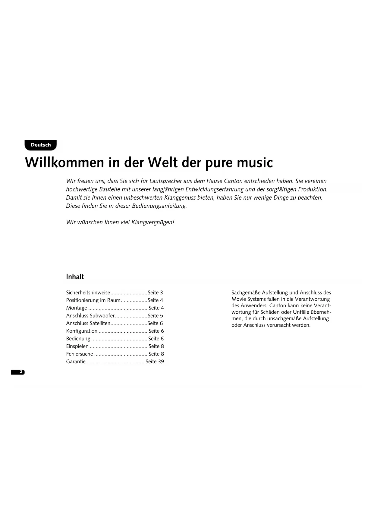 ENG DEU FRA ESP ITA RUS SWE NED POL Garantie-Urkunde Movie BeDieNuNgSANleiTuNg OPeRATiNg iNSTRuCTiONS NOTiCe D‘uTiliSATiON iNSTRuCCiONeS De uSO iSTRuziONi D’uSO РукОвОдСтвО пО экСплуатацИИ BRuKSANviSNiNg geBRuiKSAANWiJziNg iNSTRuKCJA OBSługi2 Inhalt Sicherheitshinweise ......................... Seite 3 Positionierung im Raum .................. Seite 4 Montage ........................................ Seite 4 Anschluss Subwoofer ...................... Seite 5 Anschluss Satelliten ......................... Seite 6 Konfiguration ................................. Seite 6 Bedienung ...................................... Seite 6 Einspielen ....................................... Seite 8 Fehlersuche .................................... Seite 8 Garantie ....................................... Seite 39 Deutsch Willkommen in der Welt der pure music Wir freuen uns, dass Sie sich für Lautsprecher aus dem Hause Canton entschieden haben. Sie vereinen hochwertige Bauteile mit unserer langjährigen Entwicklungserfahrung und der sorgfältigen Produktion. Damit sie Ihnen einen unbeschwerten Klanggenuss bieten, haben Sie nur wenige Dinge zu beachten. Diese finden Sie in dieser Bedienungsanleitung. Wir wünschen Ihnen viel Klangvergnügen! Sachgemäße Aufstellung und Anschluss des Movie Systems fallen in die Verantwortung des Anwenders. Canton kann keine Verant- wortung für Schäden oder Unfälle überneh- men, die durch unsachgemäße Aufstellung oder Anschluss verursacht werden.3 Deutsch Sicherheitshinweise Bitte beachten Sie die Sicherheitshinweise bei der Wahl des richtigen Platzes für Ihr Movie System und bei dessen Pflege und Bedienung! Wählen Sie einen ebenen Untergrund