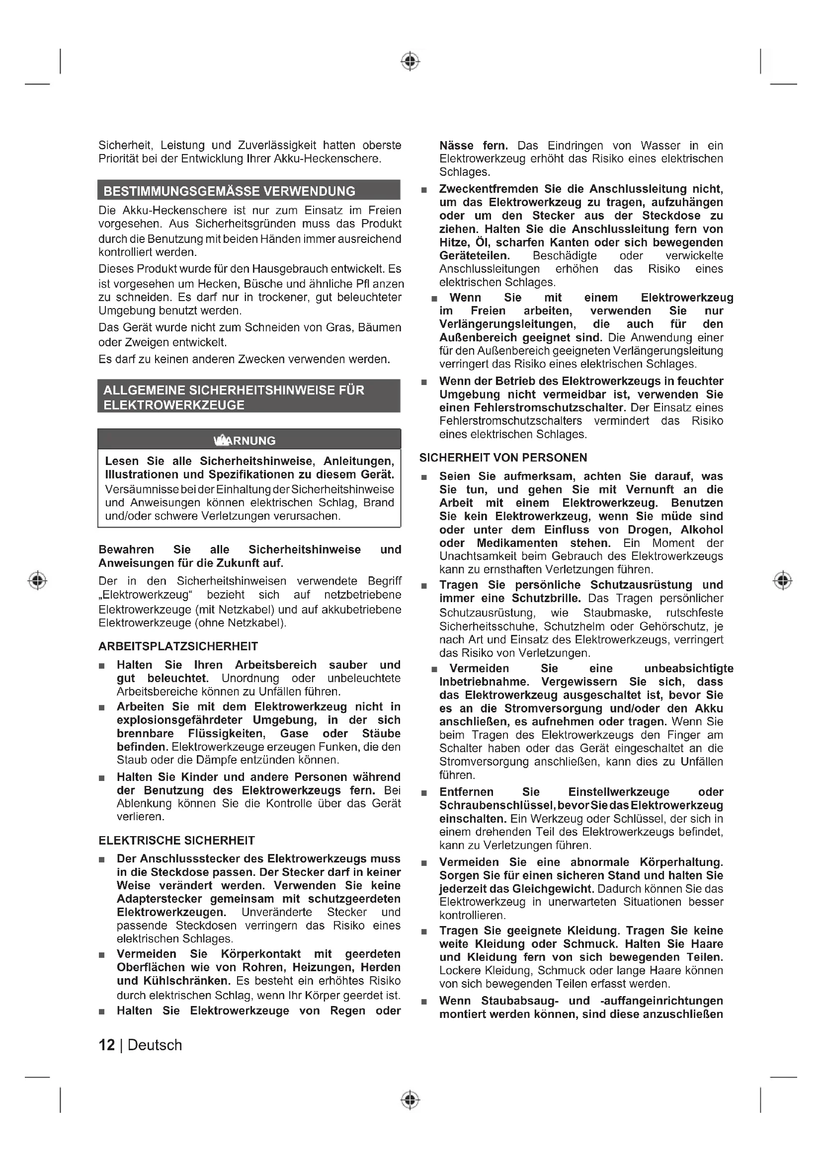 ■ In einigen Regionen können Vorschriften die Benutzung dieses Produkts einschränken. Lassen Sie sich von Ihrer örtlichen Behörde beraten. Lesen Sie alle Anweisungen. ■ Untersuchen Sie vor jeder Benutzung den Arbeitsbereich. Entfernen Sie alle Gegenstände, wie Kabel, Lampen, Draht oder Schnur, die geschleudert werden könnten oder in der Schneidvorrichtung verwickelt werden könnten. ■ Überprüfen Sie die Hecke auf Fremdkörper, wie Drahtzäune. ■ Gehen Sie vorsichtig vor, wenn Sie das Produkt in der Nähe von Einzäunungen, Pfosten, Gebäuden oder anderen unbeweglichen Objekten verwenden. ■ Achten Sie auf geschleuderte Objekte. Halten Sie unbeteiligte Personen (insbesondere Kinder und Tiere) mindestens 15m vom Arbeitsbereich fern. Stoppen Sie das Produkt, wenn jemand diesen Bereich betritt. ■ Erlauben Sie Kindern oder ungeschulten Personen nicht den Gebrauch des Produktes. ■ Nicht bei schlechter Beleuchtung verwenden. Der Benutzer braucht einen ungehinderten Blick auf den Arbeitsbereich, um mögliche Gefahren zu erkennen. ■ Stellen Sie beim Benutzen der Heckenschere immer sicher, dass alle Griffe und Vorkehrungen angebracht sind. Versuchen Sie niemals ein unvollständiges, oder mit unautorisierten Modifikationen ausgestattetes Gerät zu benutzen. ■ Stellen Sie vor jeder Benutzung sicher, dass alle Bedienelemente und Sicherheitsvorrichtung ordnungsgemäß funktionieren. Benutzen Sie das Produkt nicht, wenn der "Aus" -Schalter den Motor nicht stoppt. ■ Untersuchen Sie das Produkt vor jeder Benutzung. Überprüfen Sie auf lockere Verschlüsse, stellen Sie sicher, dass alle Schutzabdeckungen und Griffe ordnungsgemäß und sicher befestigt sind. Ersetzen Sie vor der Benutzung jegliche beschädigten Teile. Überprüfen Sie den Akku auf undichte Stellen. ■ Verändern Sie das Produkt nicht in irgendeiner Weise. ■ Tragen Sie bei Einsatz dieses Geräts vollen Augen- und Gehörschutz. Bei Arbeiten in Bereichen, wo die Gefahr herabfallender Objekte besteht, muss Kopfschutz getragen werden. ■ Tragen Sie lange, schwere Hosen, Stiefel und Handschuhe. Tragen Sie keine locker sitzende Kleidung, kurze Hosen oder jeglichen Schmuck. Tragen Sie beim Bedienen des Geräts Schuhe. ■ Binden Sie lange Haare zurück, so dass diese sich über Schulterhöhe befinden, um zu verhindern, dass sie sich in beweglichen Teilen verfangen. ■ Das Tragen von Gehörschutz verringert Ihre Fähigkeit, Warnungen zu hören (Warnungen oder Zurufe). Der Benutzer muss dem, was im Arbeitsbereich vor sich geht, ganz besondere Beachtung schenken. ■ Der Betrieb ähnlicher Werkzeuge in der Umgebung erhöht das Risiko von Gehörschäden und die Wahrscheinlichkeit, dass andere Personen Ihren Arbeitsbereich betreten. ■ Arbeiten Sie mit diesem Produkt nicht, wenn Sie müde oder krank sind, oder unter dem Einfluss von Alkohol, Drogen oder Medikamenten stehen. ■ Sorgen Sie für einen sicheren Stand und halten Sie das Gleichgewicht. Vermeiden Sie eine abnormale Körperhaltung. Eine abnormale Körperhaltung kann zu einem Verlust des Gleichgewichts führen und schwere Verletzungen verursachen. ■ Halten Sie alle Körperteile von den sich bewegenden Teilen fern. ■ Vergewissern Sie sich vor dem Starten des Produkts, dass die Schneidwerkzeuge mit nichts in Kontakt geraten können. ■ Halten Sie das Produkt bei der Benutzung immer mit beiden Händen an den beiden Griffen fest. Stellen Sie sicher, dass die Betriebsposition sicher und stabil ist. Der Hersteller empfiehlt die Benutzung von Trittleitern oder Leitern nicht. Benutzen Sie ein Werkzeug mit Verlängerung, wenn Schneiden in größerer Höhe erforderlich ist. ■ Schneidwerkzeuge sind scharf! Tragen Sie beim Umgang mit den Schneidwerkzeugen rutschfeste und schwere Schutzhandschuhe. Bringen Sie Hand oder Finger nicht zwischen das Schneidwerkzeug oder in eine Position, in der Sie gequetscht oder geschnitten werden könnten. Berühren Sie niemals das Messer oder warten das Gerät, außer der Akkupack wurde entfernt. ■ Schalten Sie das Gerät aus, entfernen Sie den Akku und lassen Sie beides abkühlen. Stellen Sie sicher, dass alle bewegenden Teile vollständig angehalten sind: ● bevor die Arbeitsstellung des Schneidwerkzeugs eingestellt wird ● bevor Sie das Produkt warten ● bevor Sie eine Blockierung entfernen ● Bevor Sie das Produkt prüfen, reinigen oder daran arbeiten ● bevor Sie Zubehörteile wechseln ● bevor Sie das Produkt unbeaufsichtigt zurücklassen ● bevor Sie das Gerät nach dem Kontakt mit Gegenständen auf Schäden prüfen ● vor der Durchführung der Wartung ● wenn die Maschine anfängt ungewöhnlich zu vibrieren ■ Führen Sie das Produkt nicht mit Gewalt durch dichtes Strauchwerk. Dies kann dazu führen, dass das Schneidwerkzeug blockieren und dadurch langsamer werden. Sollte die Schneidwerkzeuge langsamer werden, verringern Sie die Arbeitsgeschwindigkeit. ■ Versuchen Sie nicht, Äste oder Zweige mit einem Durchmesser von mehr als 22 mm zu schneiden, oder15 Deutsch |