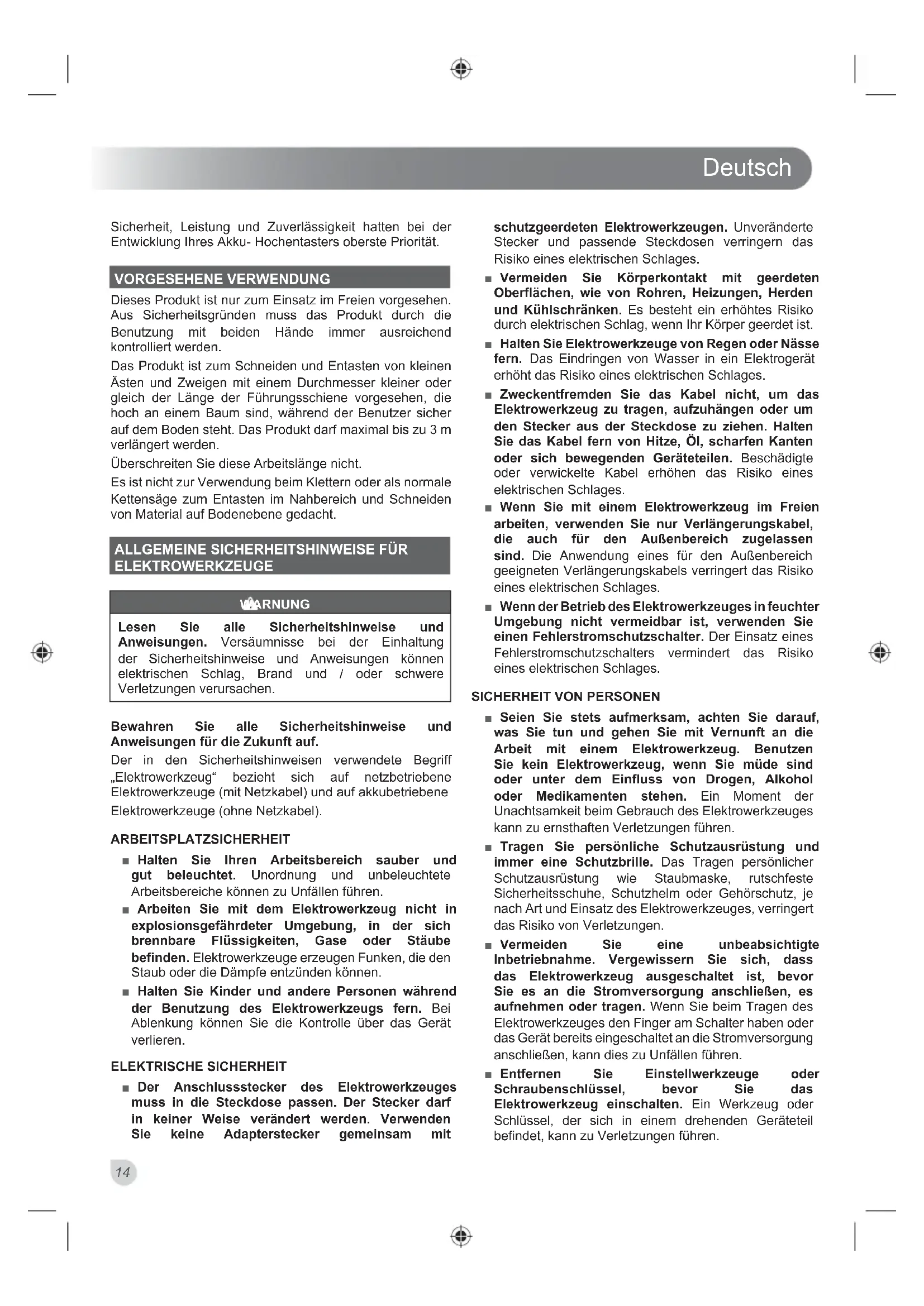 HOCHENTASTER ■ Benutzen Sie das Produkt nicht, wenn die Möglichkeit von Gewitter oder Blitz besteht. Bewahren Sie das Produkt sicher drinnen auf. ■ Stellen Sie sicher, dass alle Schutzabdeckungen und Griffe ordnungsgemäß befestigt und in gutem Zustand sind. ■ Achten Sie auf einen festen Stand, einen sauberen Arbeitsplatz und planen Sie einen Rückzugweg vor fallenden Ästen, bevor Sie das Gerät nutzen. ■ Nehmen Sie sich vor Abgasen, Schmieröldunst und Sägespänen in Acht. Tragen Sie, wenn nötig, eine Maske oder Atemgerät. ■ Halten Sie den Entaster bei der Benutzung immer mit beiden Händen. Benutzen Sie eine Hand, um den vorderen Griff festzuhalten. Benutzen Sie die andere Hand, um den hinteren Griff zu halten und die Auslöseverriegelung und den An/Aus Schalter zu bedienen. ■ Das Elektrowerkzeug darf nur an den isolierten Griffflächen gehalten werden, weil die Sägekette verdeckte Leitungen berühren kann. Sägeketten, die einen spannungsführenden Draht berühren, machen metallne Teile des Elektrowerkzeugs spannungsführend und könnten dem Bediener einen elektrisieren Schlag versetzen. ■ Verändern Sie Ihr Werkzeug nicht auf irgendeine Weise, oder verwenden es, um Anbauteile oder Geräte, die nicht vom Hersteller Ihres Entasters empfohlen sind, anzutreiben. ■ Ihr Entaster wird mit einem Tragegurt geliefert. Sie müssen das Geschirr bei Gebrauch des Entasters verwenden. Es wird Ihnen dabei helfen, den Entaster beim Senken nach dem Schnitt zu kontrollieren. Das Geschirr hilft Ihnen auch, das Gewicht der Maschine während der Nutzung und beim Bewegen während des Schneidens abzufangen. ■ Lernen Sie, wie der Schnellverschluss funktioniert und üben Sie die Benutzung, bevor Sie die Maschine benutzen. Die richtige Benutzung des Schnellverschlusses kann im Notfall schwere Verletzungen verhindern. Tragen Sie niemals zusätzliche Kleidung über dem Schultergurt oder behindern Sie den Zugriff zu dem Schnellverschluss anderweitig. ■ Achten Sie vor dem Starten der Elektrowerkzeugs darauf, dass die Sägekette keine Gegenstände berühren. ■ Eine falsch gespannte Sägekette kann von der Führungsschiene springen und zu schweren Verletzungen führen. Die Sägekette muss vor jeder Benutzung überprüft und ggfs. geölt werden, insbesondere eine neue Kette. ■ Um die Verletzungsgefahr durch sich bewegende Teile zu verringern, stoppen Sie den Motor immer und stellen Sie sicher, das alle sich bewegenden Teile gestoppt haben, bevor Sie: ● die Säge reinigen oder eine Blockierung entfernen ● Das Produkt unbeaufsichtigt lassenDeutsch