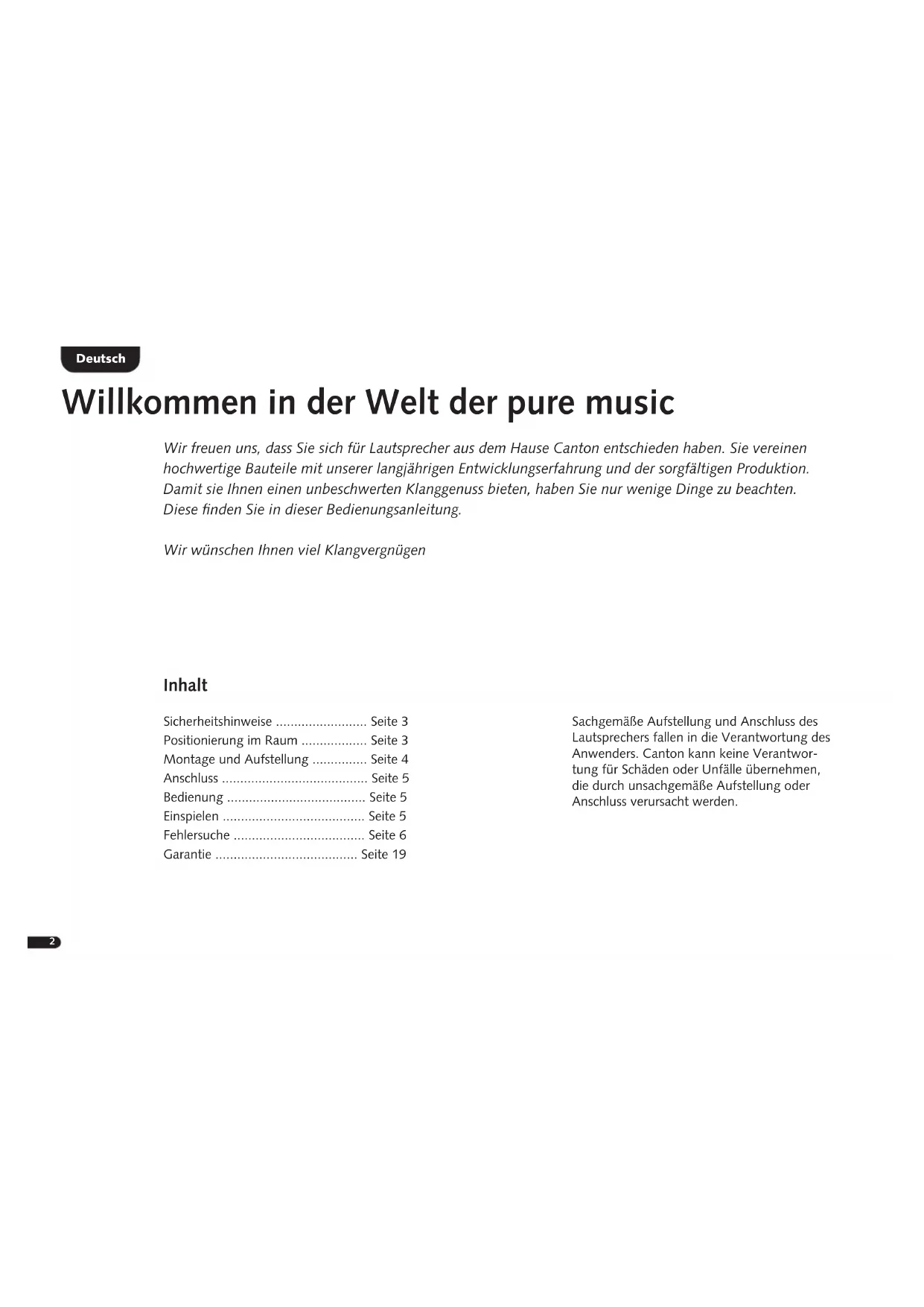 ENG DEU FRA ESP ITA RUS SWE NED POL Garantie-Urkunde Kompakt- und Standlautsprecher BeDieNuNgSANleiTuNg OPeRATiNg iNSTRuCTiONS NOTiCe D‘uTiliSATiON iNSTRuCCiONeS De uSO iSTRuziONi D’uSO РукОвОдСтвО пО экСплуатацИИ BRuKSANviSNiNg geBRuiKSAANWiJziNg iNSTRuKCJA OBSługi2 Inhalt Sicherheitshinweise ......................... Seite 3 Positionierung im Raum .................. Seite 3 Montage und Aufstellung ............... Seite 4 Anschluss ........................................ Seite 5 Bedienung ...................................... Seite 5 Einspielen ....................................... Seite 5 Fehlersuche .................................... Seite 6 Garantie ....................................... Seite 19 Sachgemäße Aufstellung und Anschluss des Lautsprechers fallen in die Verantwortung des Anwenders. Canton kann keine Verantwor- tung für Schäden oder Unfälle übernehmen, die durch unsachgemäße Aufstellung oder Anschluss verursacht werden. Deutsch Willkommen in der Welt der pure music Wir freuen uns, dass Sie sich für Lautsprecher aus dem Hause Canton entschieden haben. Sie vereinen hochwertige Bauteile mit unserer langjährigen Entwicklungserfahrung und der sorgfältigen Produktion. Damit sie Ihnen einen unbeschwerten Klanggenuss bieten, haben Sie nur wenige Dinge zu beachten. Diese finden Sie in dieser Bedienungsanleitung. Wir wünschen Ihnen viel Klangvergnügen3 Deutsch Positionierung im Raum Canton-Lautsprecher können im Stereo-Betrieb oder als Teil einer Surround-Anlage verwendet werden.