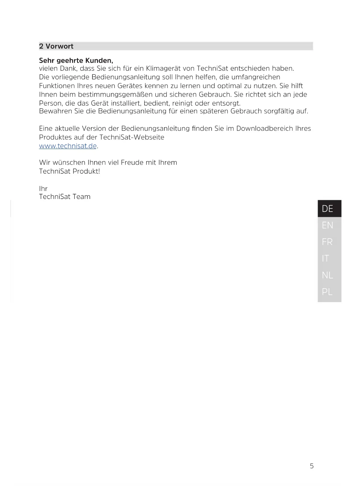 2 Vorwort Sehr geehrte Kunden, vielen Dank, dass Sie sich für ein Klimagerät von TechniSat entschieden haben. Die vorliegende Bedienungsanleitung soll Ihnen helfen, die umfangreichen Funktionen Ihres neuen Gerätes kennen zu lernen und optimal zu nutzen. Sie hil Ihnen beim bestimmungsgemäßen und sicheren Gebrauch. Sie richtet sich an jede Person, die das Gerät installiert, bedient, reinigt oder entsorgt. Bewahren Sie die Bedienungsanleitung für einen späteren Gebrauch sorgfältig auf. Eine aktuelle Version der Bedienungsanleitung finden Sie im Downloadbereich Ihres Produktes auf der TechniSat-Webseite www.technisat.de. Wir wünschen Ihnen viel Freude mit Ihrem TechniSat Produkt! Ihr TechniSat Team6 3 Sicherheitshinweise