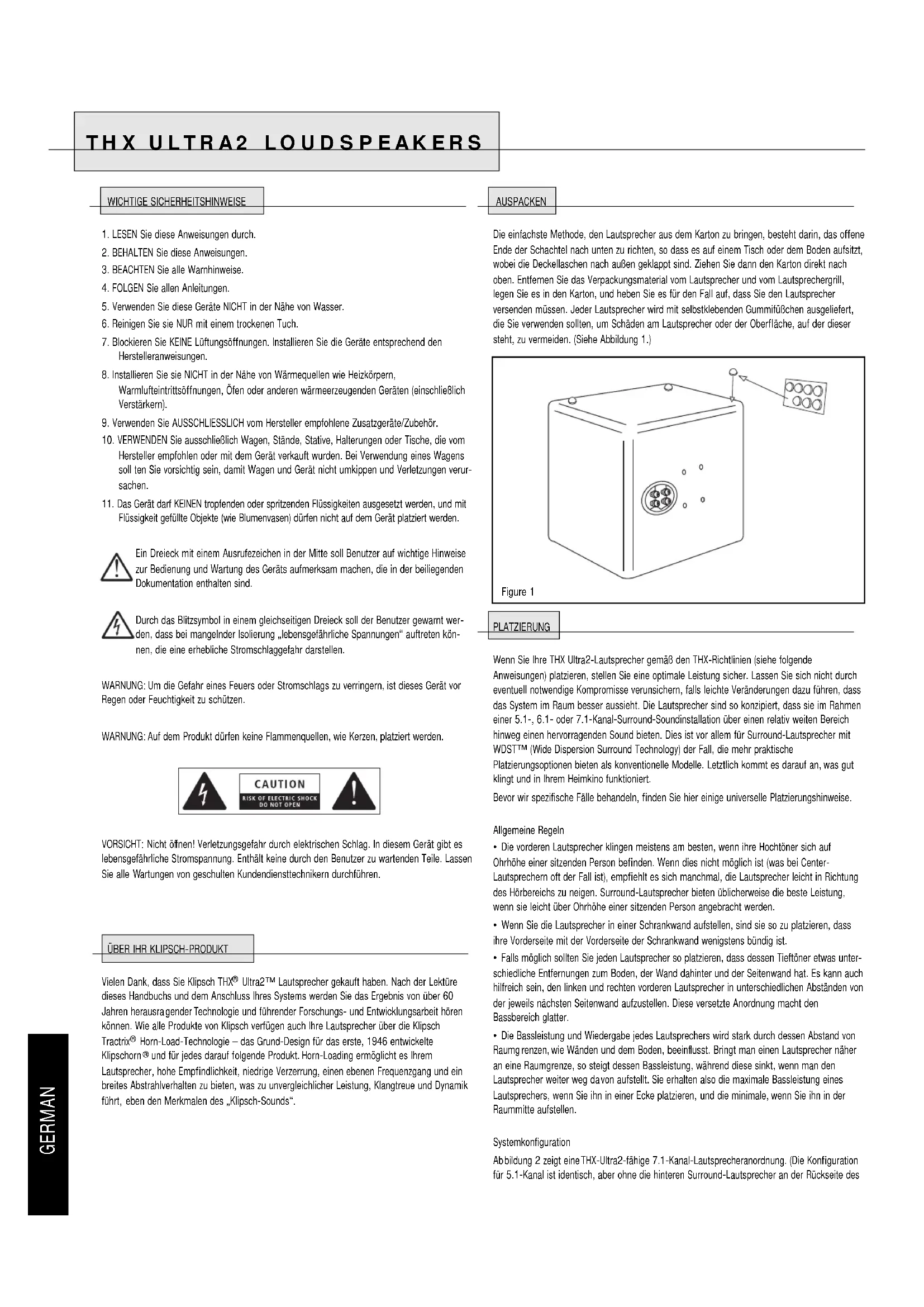 und für jedes darauf f olgende Produkt. Horn-Loading ermöglicht es Ihrem Lautsprecher, hohe Empfindlichkeit, niedrige Verzerrung, einen ebenen Frequenzgang und ein breites Abstrahlverhalten zu bieten, was zu unvergleichlicher Leistung, Klangtreue und Dynamik führt, eben den Merkmalen des „Klipsch-Sounds“. AUSPACKEN Die einfachste Methode, den Lautsprecher aus dem Karton zu bringen, besteht darin, das offene Ende der Schachtel nach unten zu richten, so dass es auf einem Tisch oder dem Boden aufsitzt, wobei die Deckellaschen nach außen geklappt sind. Ziehen Sie dann den Karton direkt nach oben. Entfernen Sie das Verpackungsmaterial vom Lautsprecher und vom Lautsprechergrill, legen Sie es in den Karton, und heben Sie es für den Fall auf, dass Sie den Lautsprecher versenden müssen. Jeder Lautsprecher wird mit selbstklebenden Gummifüßchen ausgeliefert, die Sie verwenden sollten, um Schäden am Lautsprecher oder der Oberfläche, auf der dieser steht, zu vermeiden. (Siehe Abbildung 1.) PLATZIERUNG Wenn Sie Ihre THX Ultra2-Lautsprecher gemäß den THX-Richtlinien (siehe folgende Anweisungen) platzieren, stellen Sie eine optimale Leistung sicher. Lassen Sie sich nicht durch eventuell notwendige Kompromisse verunsichern, falls leichte Veränderungen dazu führen, dass das System im Raum besser aussieht. Die Lautsprecher sind so konzipiert, dass sie im Rahmen einer 5.1-, 6.1- oder 7.1-Kanal-Surround-Soundinstallation über einen relativ weiten Bereich hinweg einen hervorragenden Sound bieten. Dies ist vor allem für Surround-Lautsprecher mit WDST™ (Wide Dispersion Surround Technology) der Fall, die mehr praktische Platzierungsoptionen bieten als konventionelle Modelle. Letztlich kommt es darauf an, was gut klingt und in Ihrem Heimkino funktioniert. Bevor wir spezifische Fälle behandeln, finden Sie hier einige universelle Platzierungshinweise. Allgemeine Regeln