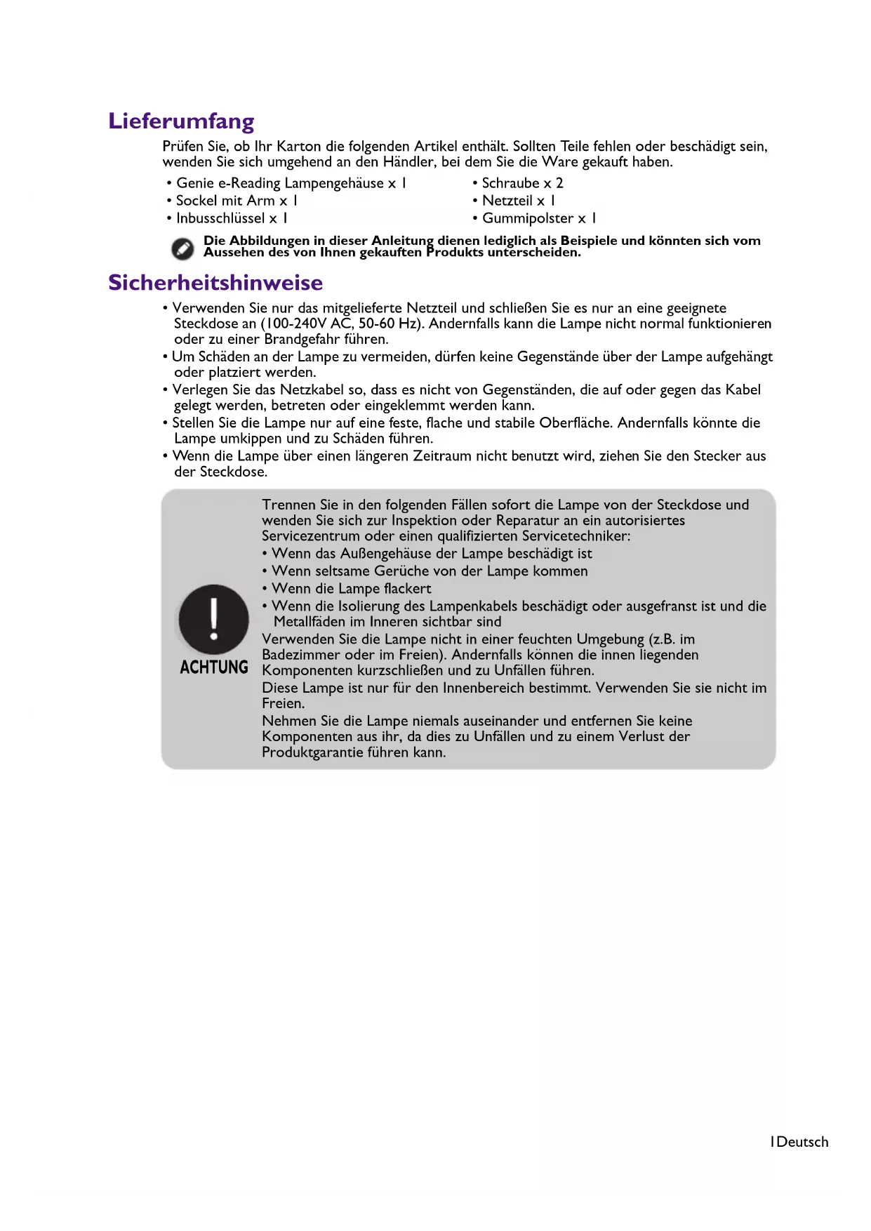 - Wenn die Isolierung des Lampenkabels beschädigt oder ausgefranst ist und die Metallfäden im Inneren sichtbar sind Verwenden Sie die Lampe nicht in einer feuchten Umgebung (z.B. im Badezimmer oder im Freien). Andernfalls können die innen liegenden Komponenten kurzschließen und zu Unfällen führen. Diese Lampe ist nur für den Innenbereich bestimmt. Verwenden Sie sie nicht im Freien. Nehmen Sie die Lampe niemals auseinander und entfernen Sie keine Komponenten aus ihr, da dies zu Unfällen und zu einem Verlust der Produktgarantie führen kann. ACHTUNG2Deutsch Installation
